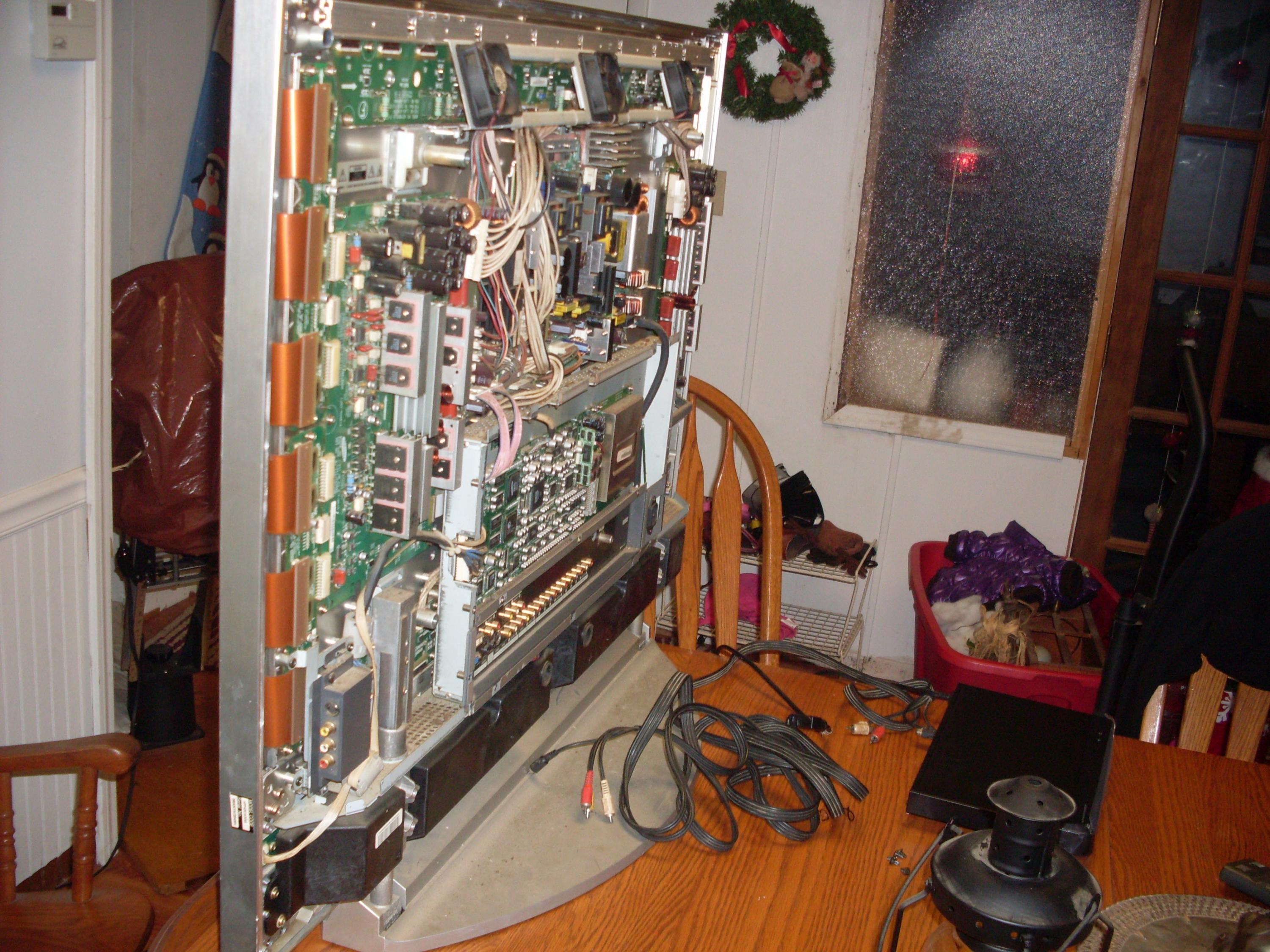 Hi Im new to this forum, I was searching all over and this site kept popping up, but I couldnt not find anything pertaining directly to my exact model and problem. Ok, so this t.v. was given to us for free, and I used to fix some electronics that were trash, but havent done it in years. When I popped the back off of this thing, I barely recognized anything, and realized I was way out of my league alone on this. When I plug it in, the blue led light blinks 4 times, the melody plays, and blinks for the 5th time and stays glowing forever. Just as the led light blinks and stays on the 5th time, the screen starts to brighten but then dies instantly, but the led stays on. The buttons on the bottom work, but do nothing on the screen. I unplugged the Y board, and I am able to turn it on, with no picture. Same with the X board, and neither of them. So I can turn it on with one, the other, or both Y and X boards unplugged from the main board. Never get any picture though. I do not have a remote, and seeing as this is a nice TV, I am willing to invest a couple hundred into it if I can get it going again, without a repairman and their hidden fee crap. Any idea's? Also let me know if i should take any other pictures, anything I can do, I will. Thank you.