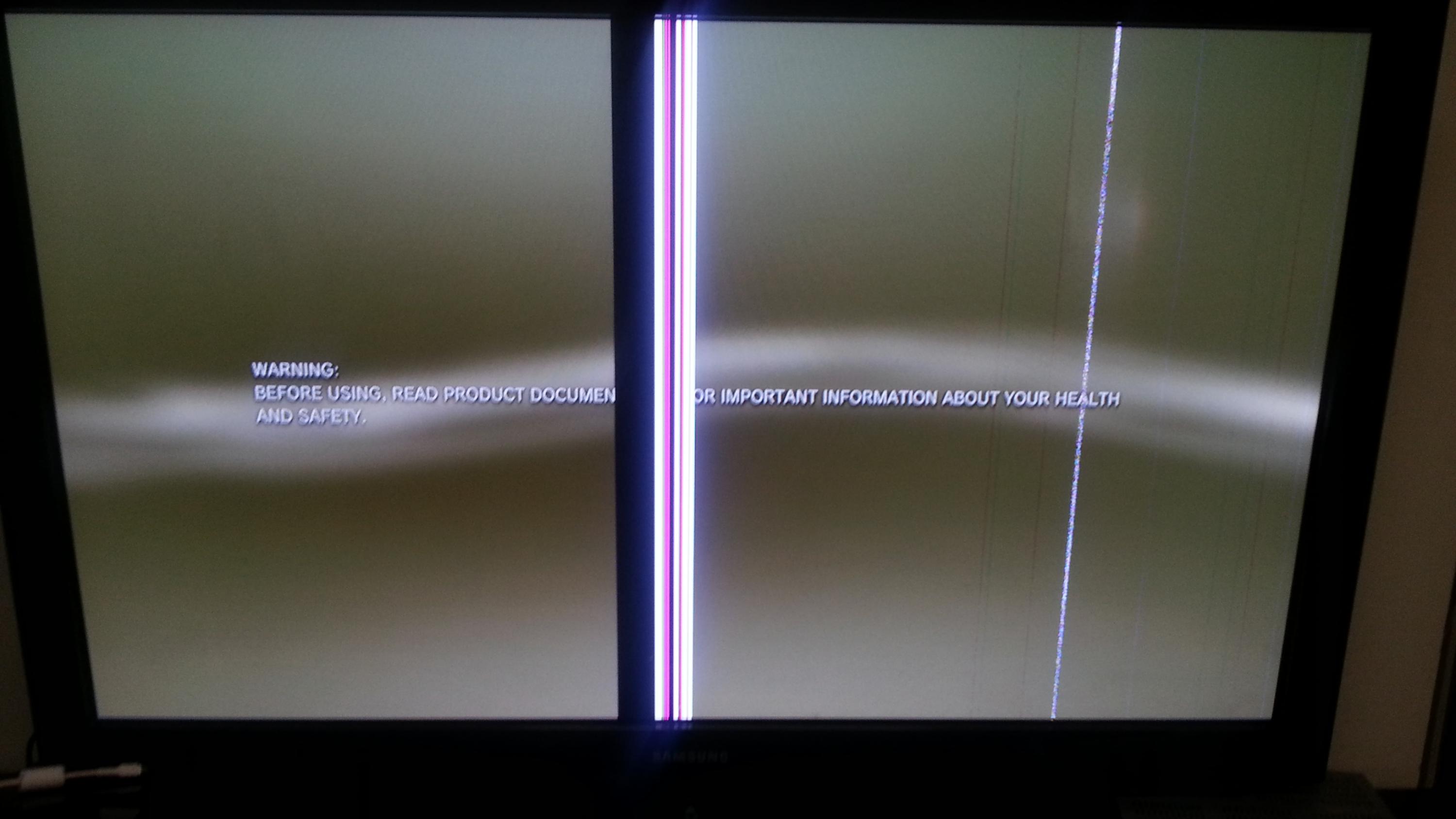 Hi. Attached are pictures of my issue. The large section missing in the middle shrinks after about 30 minutes of watching tv, but is obviously still noticeable since it's smack in the middle of the screen. As you can also see, there are single vertical strands of red, green or blue along the right side along with the white strip.
