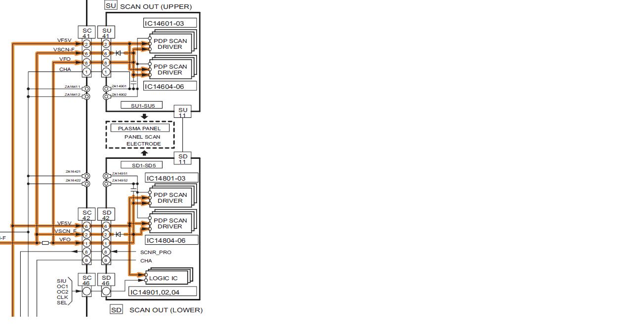 Using the VF-Ground (VF_GND) as reference, measure the Vfo, VSCN-F, and 5V-F resistance's on the SU and SD boards individually.The board is considered to be bad is a short circuit or a very low resistance reading is found on any of these lines.