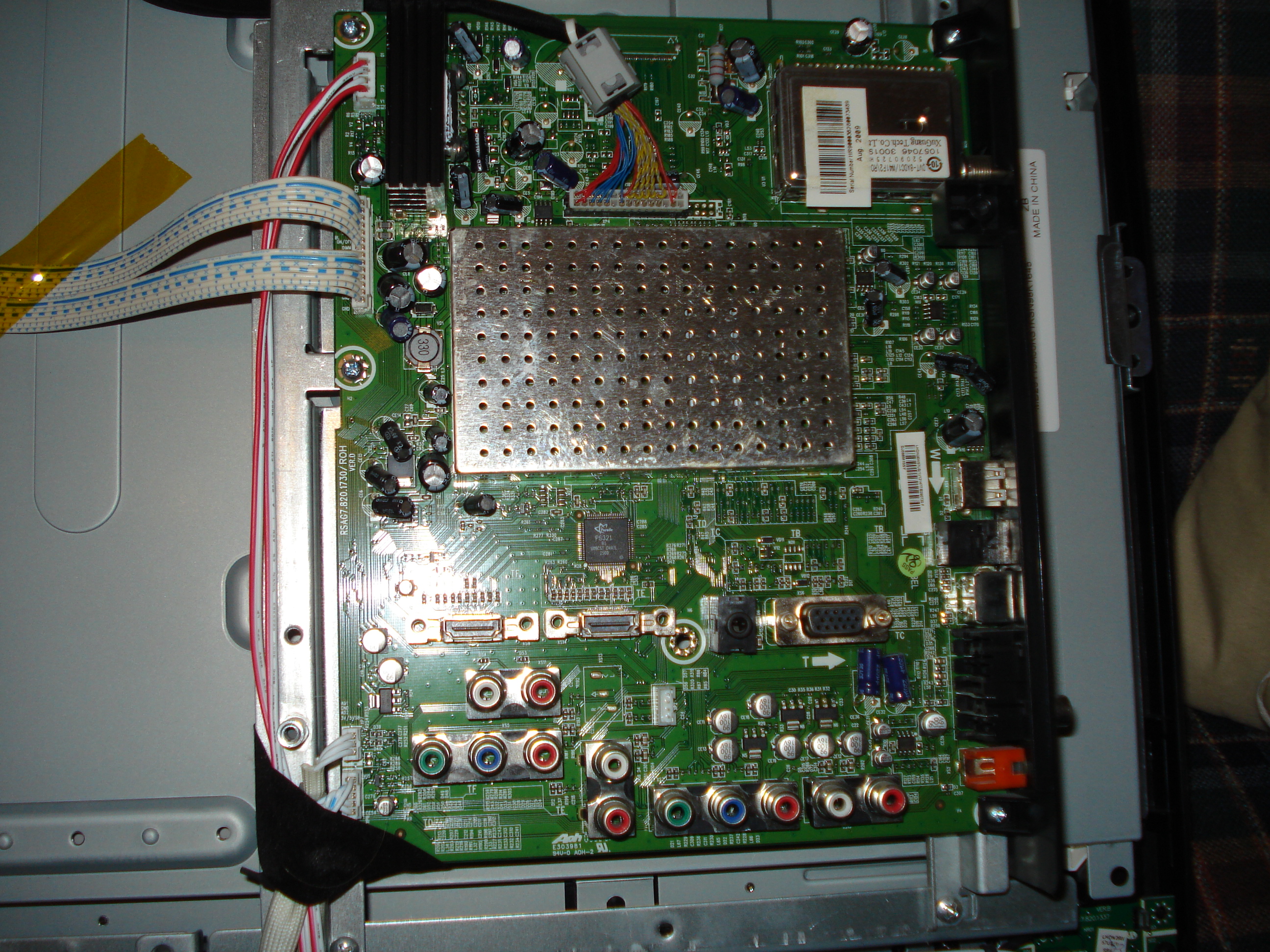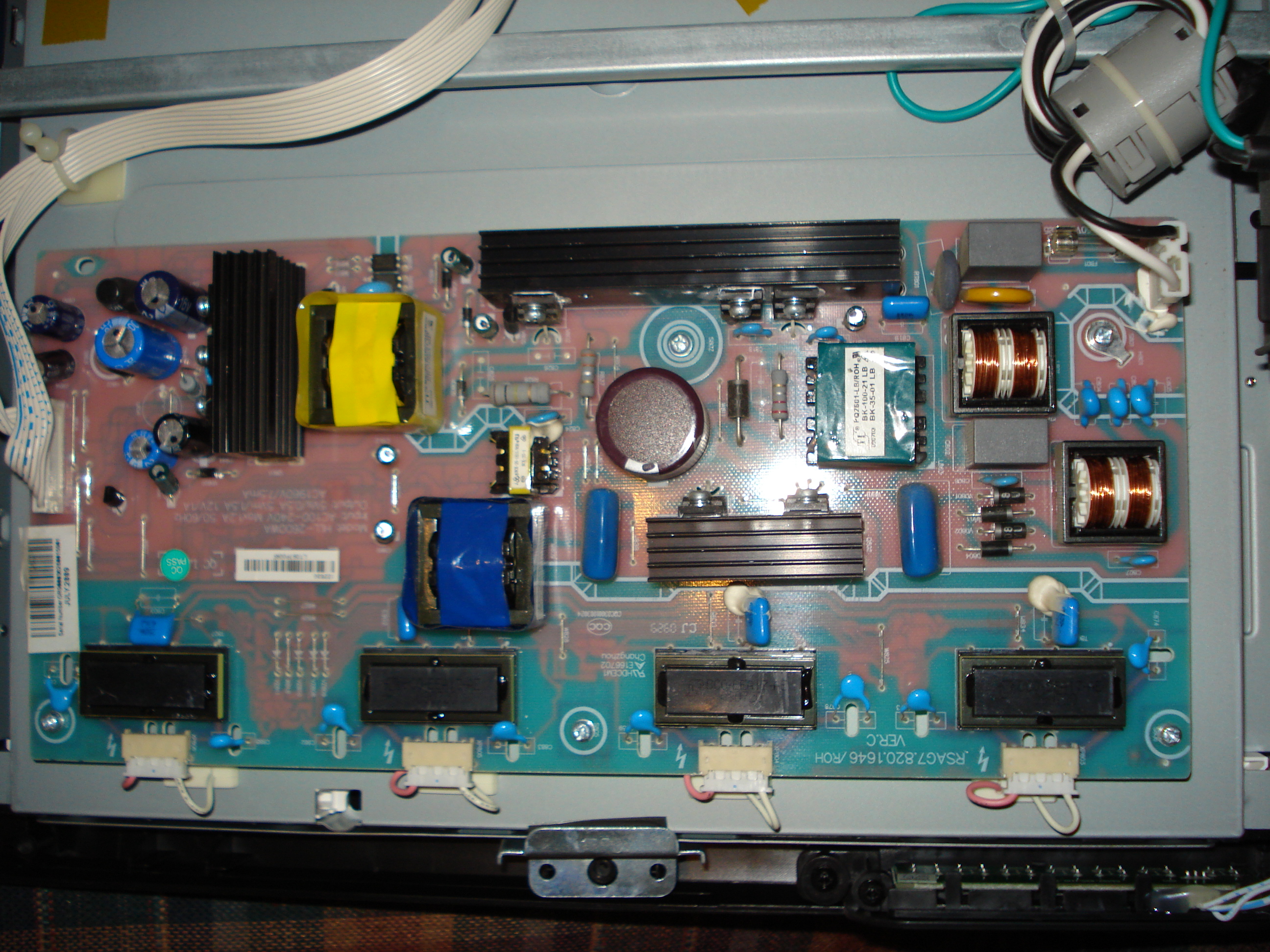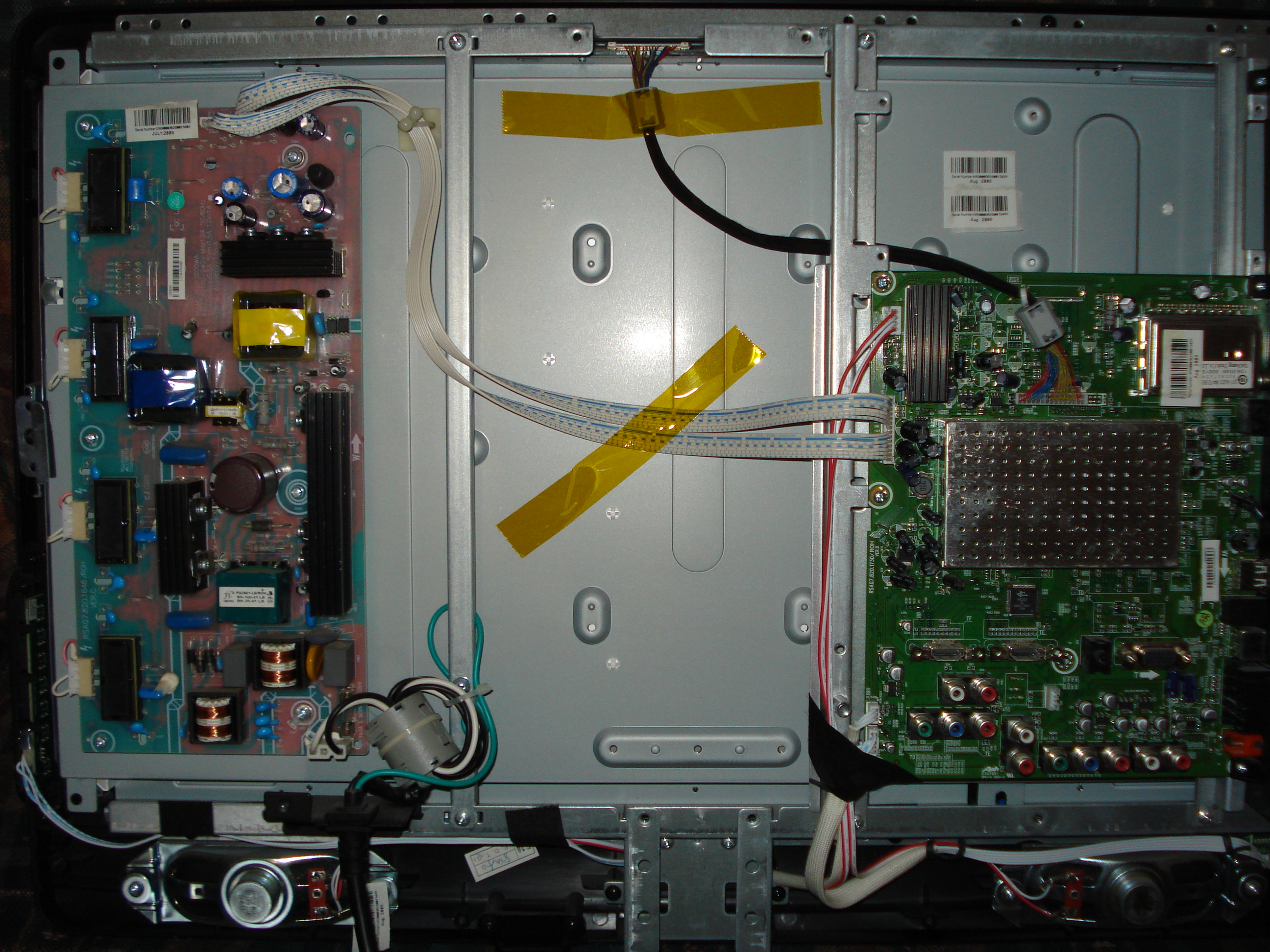 I picked this one up this morning at no cost to me, When first powered on it had a plain white screen, then it tried to display horizontal lines after on awhile, and this was intermittent when squeezing the plastic bezel at the top so I got out the hairdryer and heated where the connector from the main board plugs into the panel board and then it went to a normal blue screen, I removed and reseated the same connector, not sure if that really helped but then I hooked up a Dvd player to AV Input and got a good picture and sound, let it play for about 30 minutes with no problems, will let cool down over night and test again tomorrow. here are the pictures of the display, chassis and circuit boards. I may have bad tab bonds that I can try to fix.