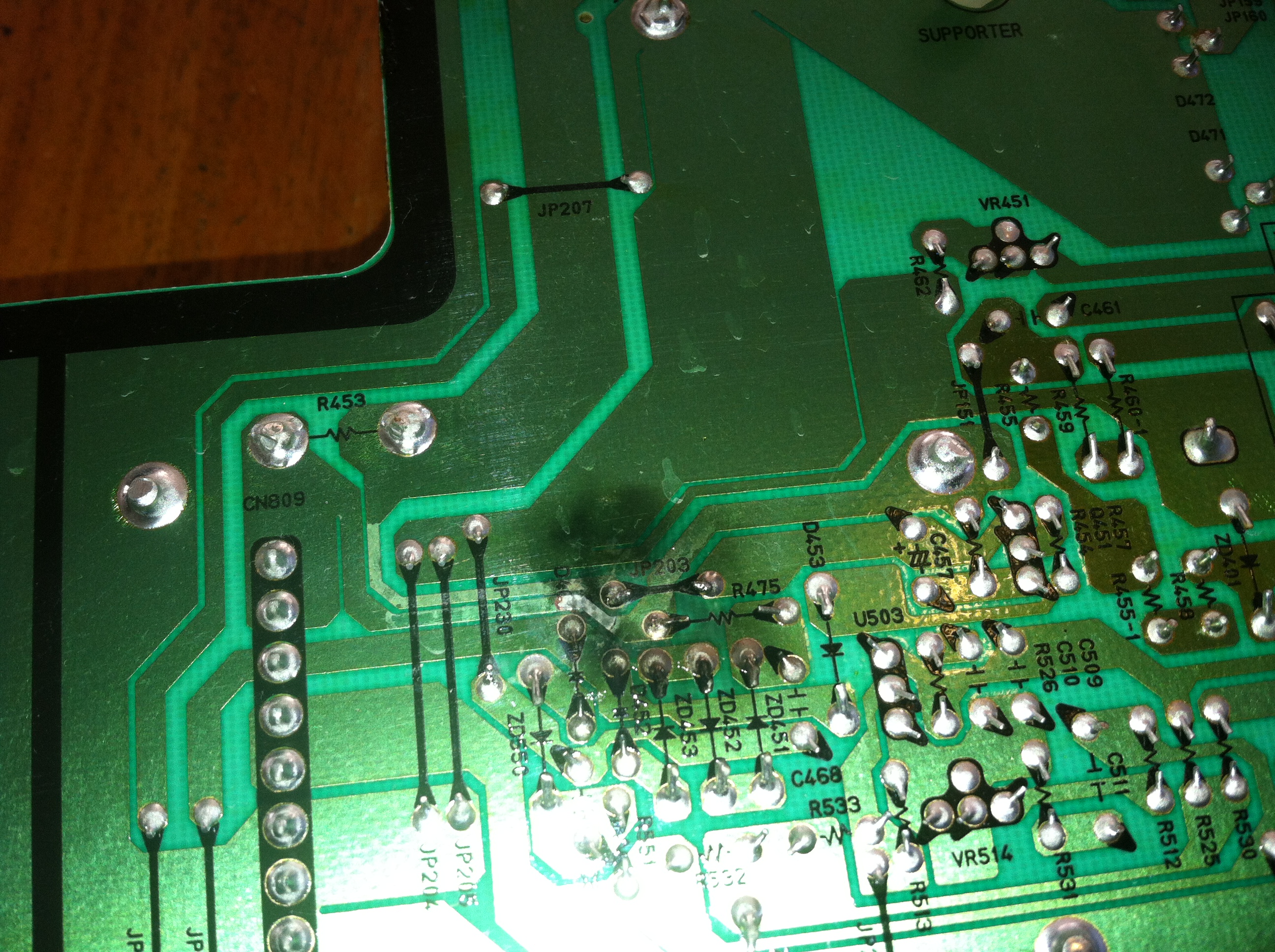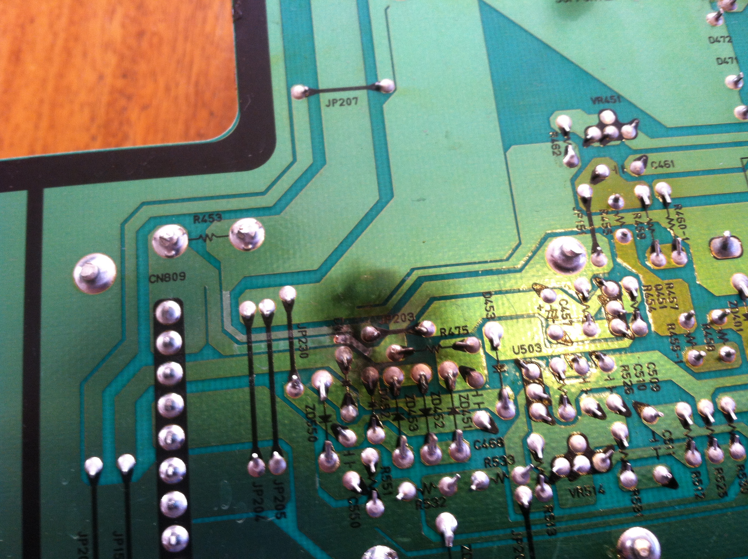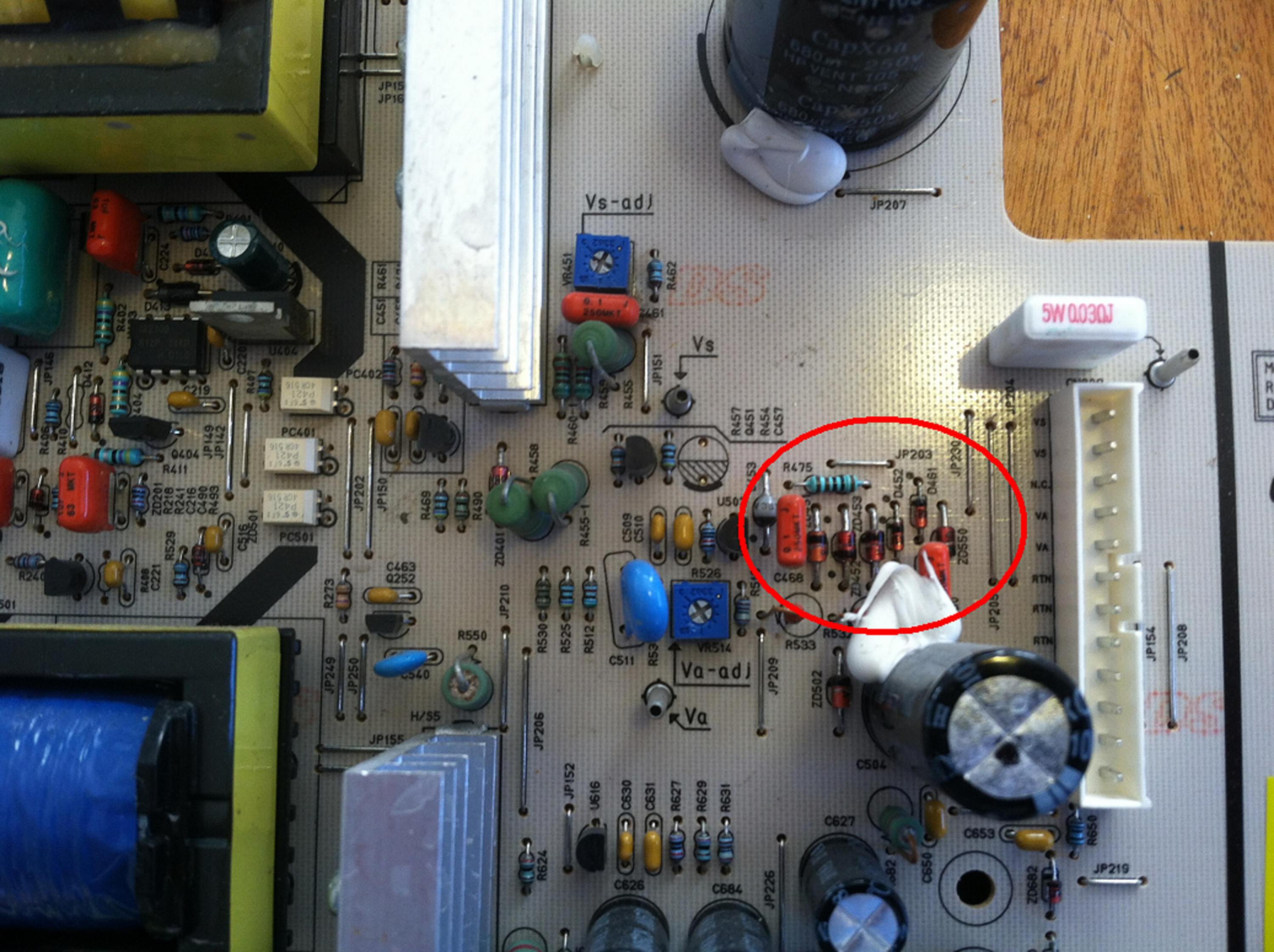 Because I'm lazy, the cover is a pain to get on and off, and I had just brought it upstairs, I decided to try to play with the Vs (small circle in pic) through a hole in the back cover. Everything was going fine until I apparently touched the heatsink in the large circle in the pic (or something connected to the heatsink) with the screwdriver. There was an arc and a loud pop and the set powered off. Now the standby light blinks and a relay in the back clicks about once every second. I'm hoping I just blew a fuse but I suspect more damage than that. I'm kinda upset with myself for being so foolish and the cover really is a pain to get off so I haven't opened it up to check.