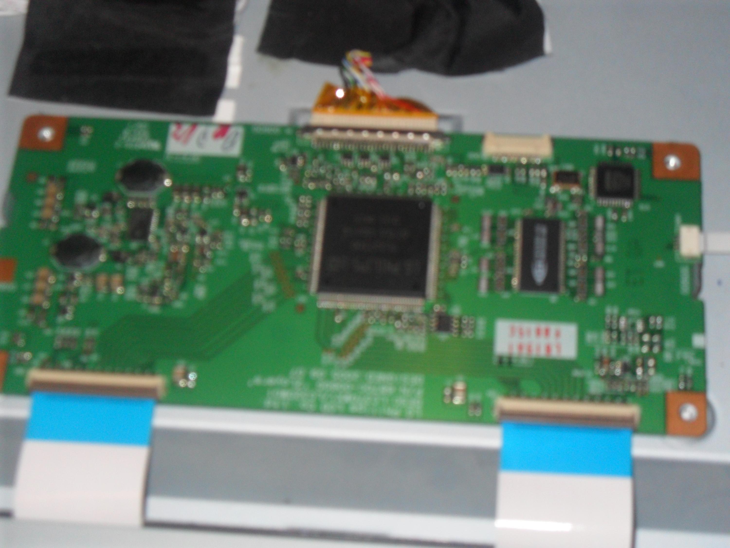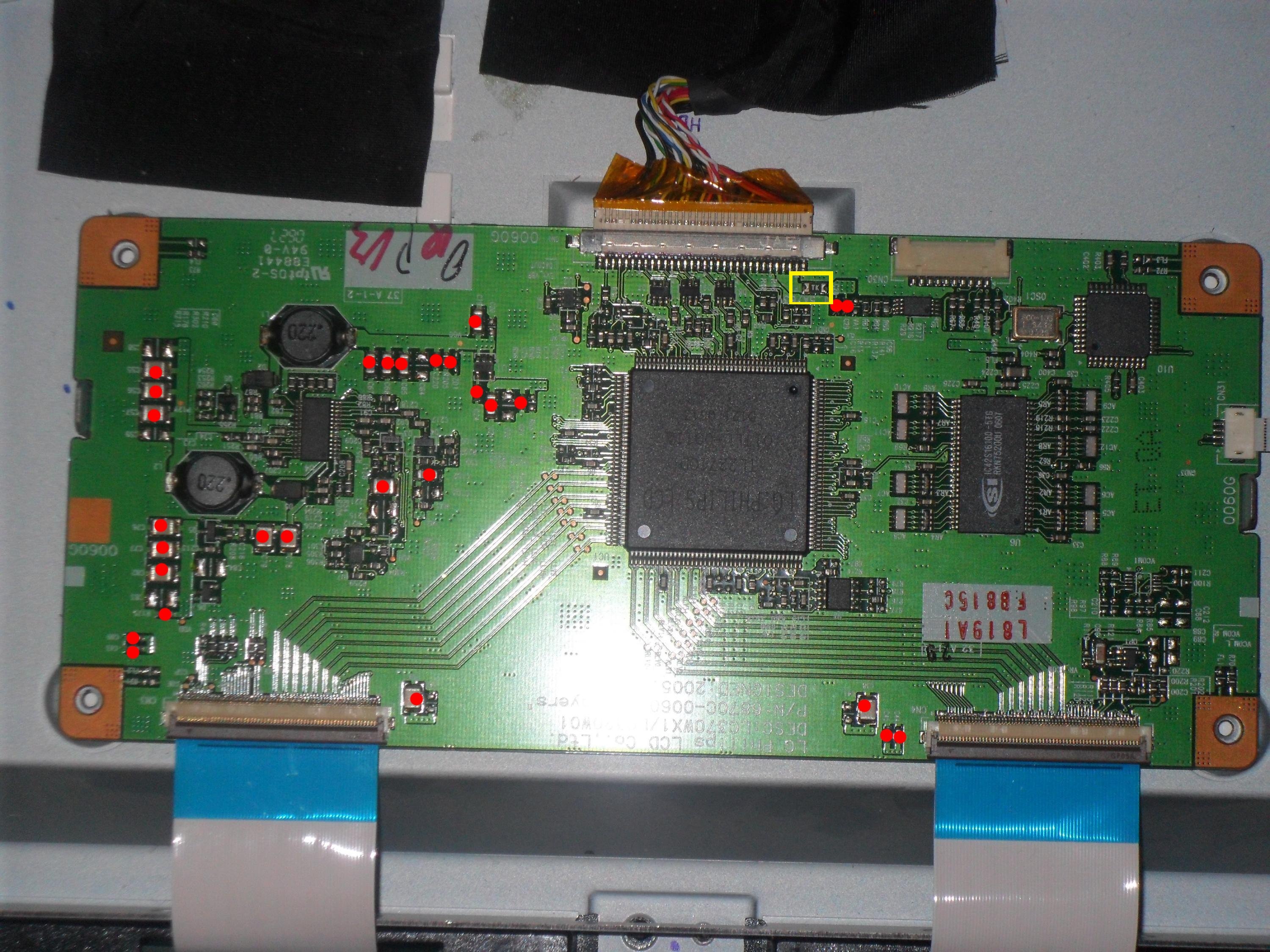 • TV came with vertical bars and no image. Found faulty TVS on left buffer board. Also replaced T-Con (may have damaged the original while hot air removing components, board has slight warp) and have full image but few horizontal lines on the screen. Some of the lines appears to be 2 pixel tall while others are 1 pixel tall.