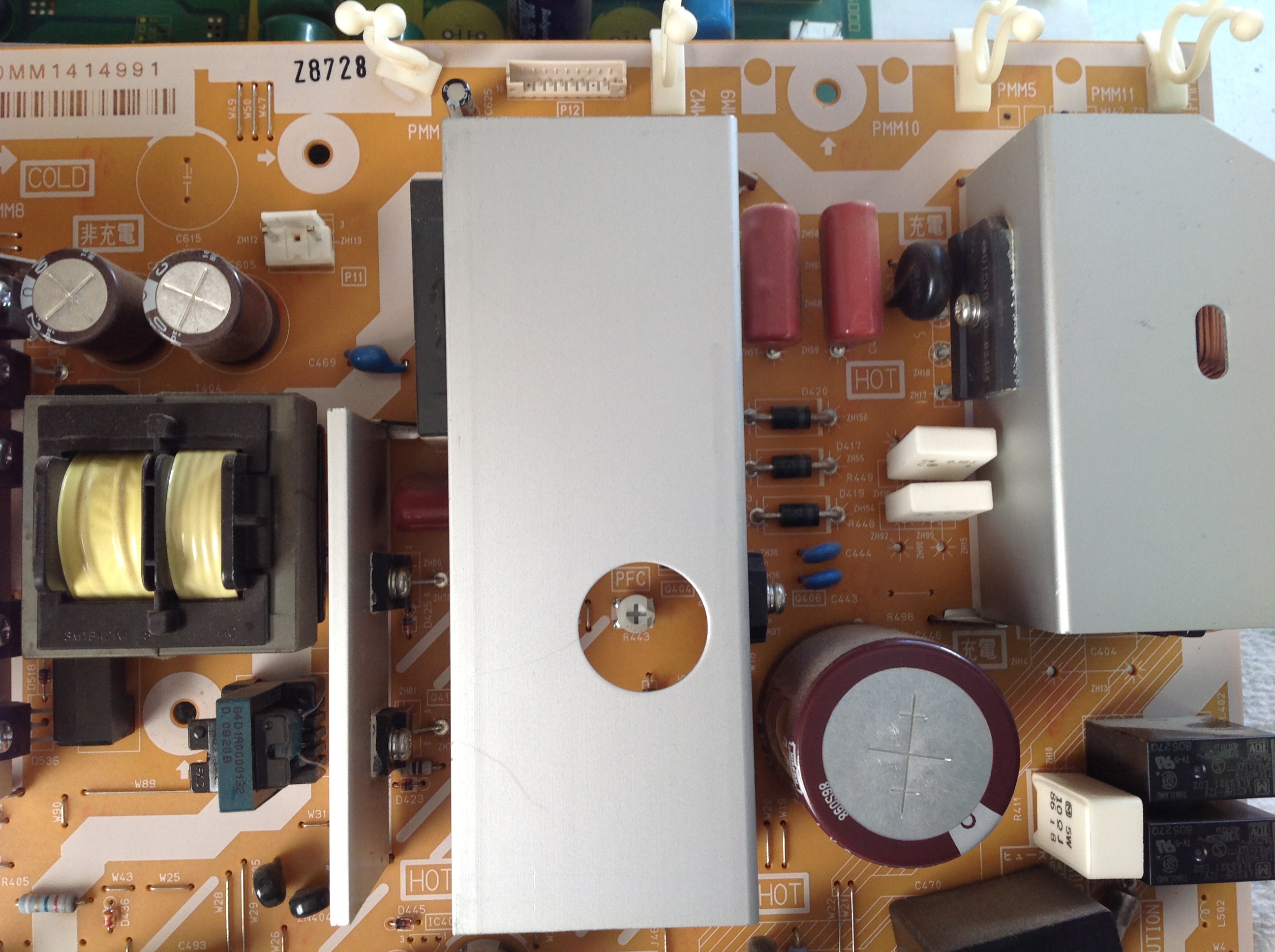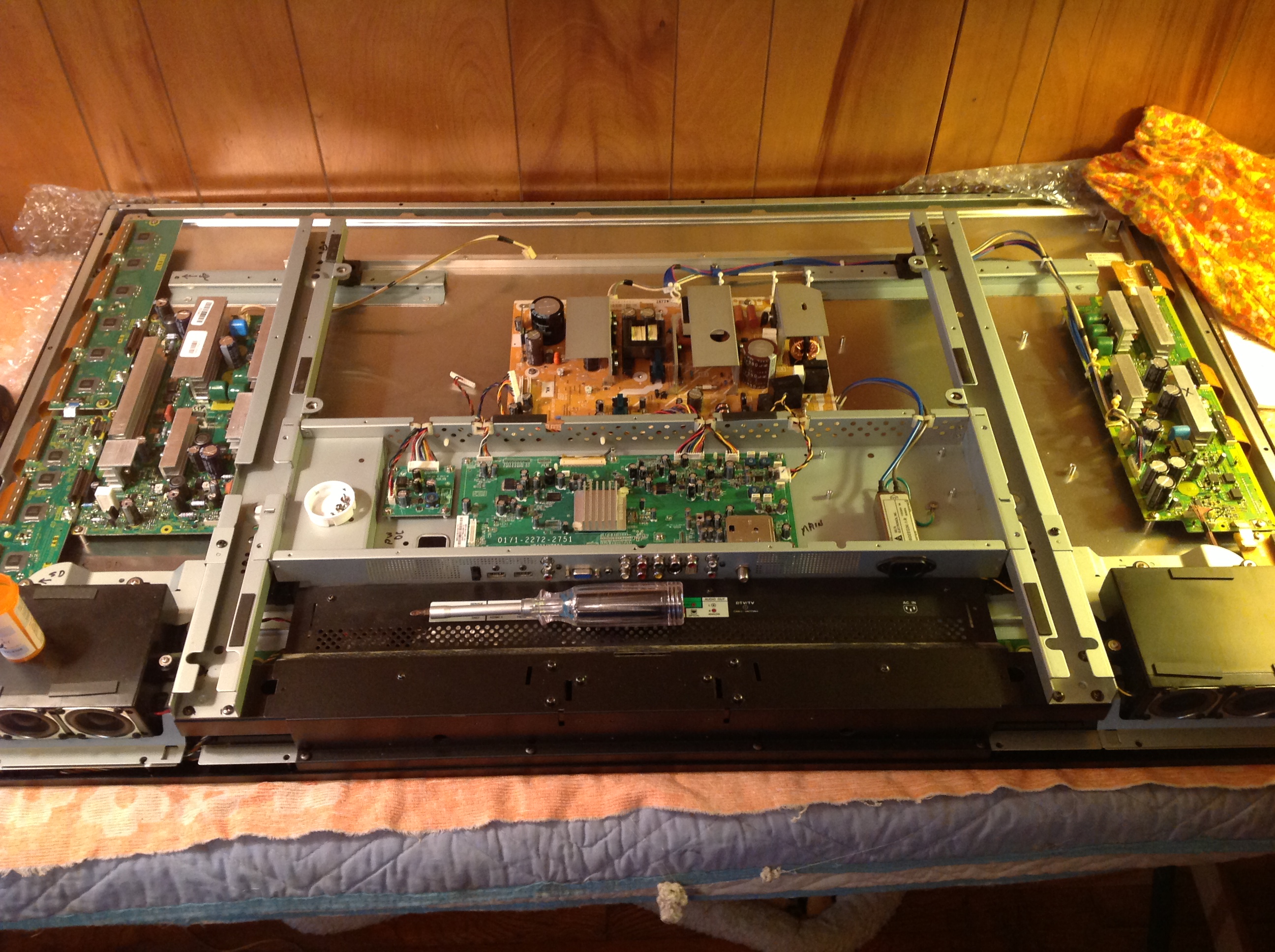 When the screen went black there was no audible pop. Breakdown shows no visible bad caps. I've removed the PSU (LSJB1260-1), the main (3850-0182-0150), and replaced the SC (TNPA 4393AE) and still no picture. No visible burn marks on the foil side.