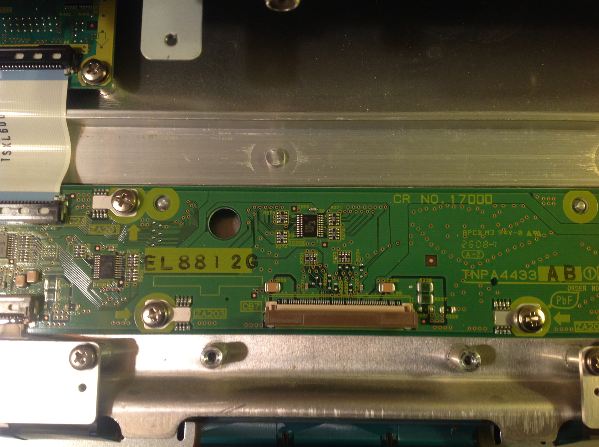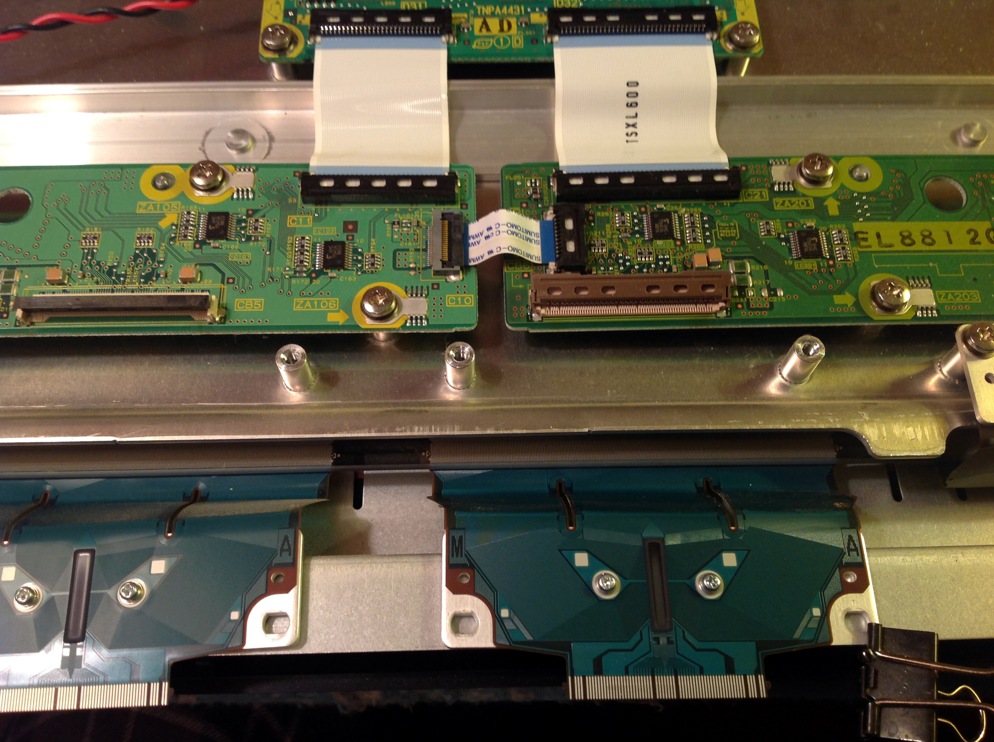 I put the SU board in this morning with some success. It seems with this hybrid Panasonic that one IC on the SU board CAN take this set down with Black Screen. However, as you can see in the pics, (I rotated them for better clarity) the ribbon cables still need to be adjusted and I have a black vertical bar down the center. Is this (Black bar) due to a misaligned cable on a C board??