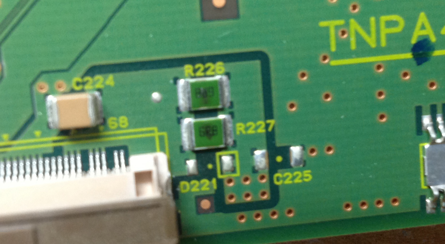 With and without the tab installed test across C224 for resistance. Near zero would indicate a fault; if it's near zero when not installed then it could be that ceramic cap instead.