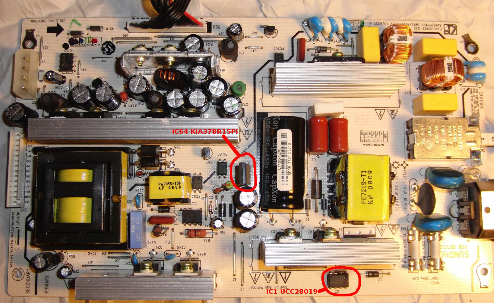 i try to repair the power supply from an ITT LCD 32-4000 32" Flat TV with DVB-S2 Tuner. I never plugged the device into the power socket. The seller told me that nothing happens at the TV. So i opened the TV and found a burned chip on the Power Supply. The Label on the chip is: UCC28019 (Datasheet: https://cdn.badcaps-static.com/pdfs/...c4694f2f17.pdf). The SMD Cap C5 seems to be burned. I tested all Fuses, FET's and Power Diodes. They seems to be OK. How can i test the PFC Controller IC1? Should i test other Parts? There are a lot of SMD Parts near the PFC Controller IC1. I have a Multimeter, 30Mhz Oszi, Waveform generator, ESR Meter, Hot Air Rework Station. Any help would be appreciated.