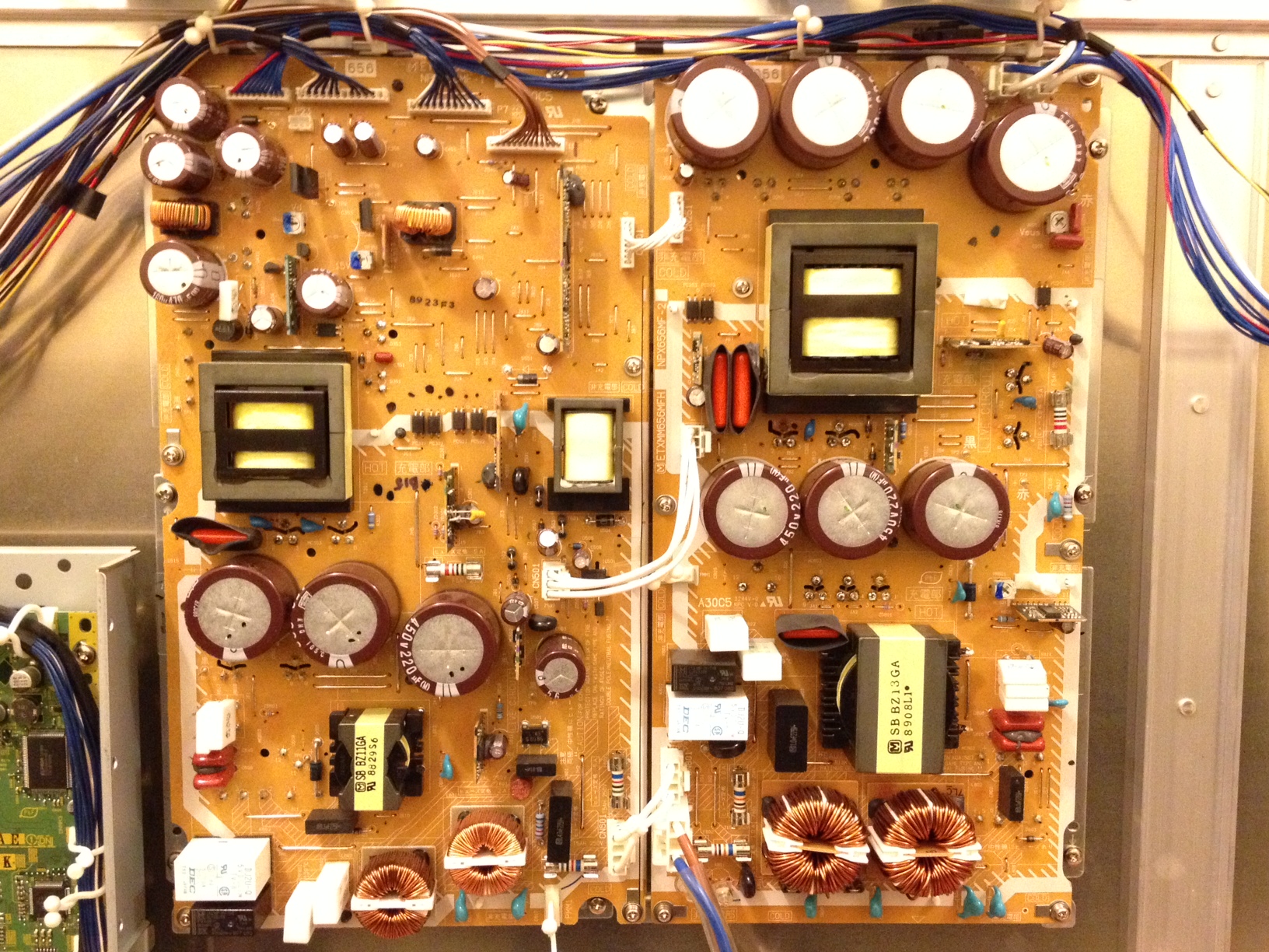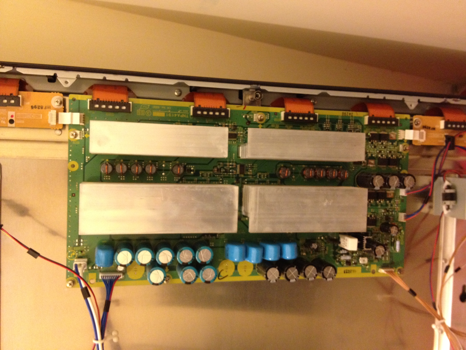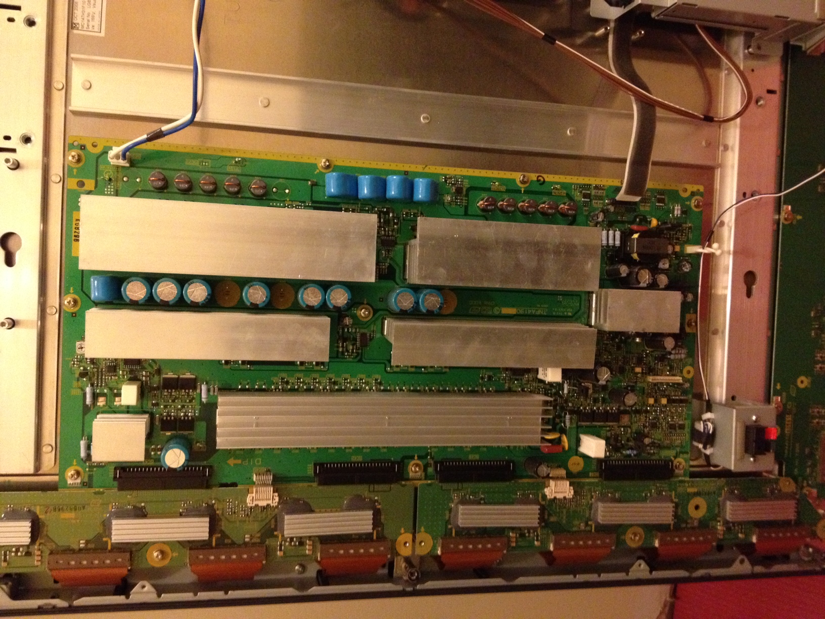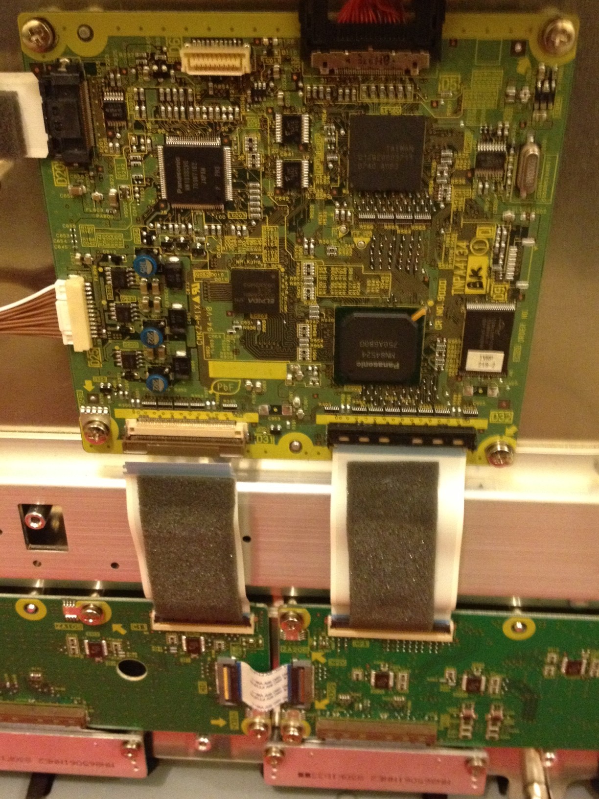 Hi all, I am looking for assistance with the repair of a Panasonic Plasma Display TH-58PH10BK. The issue is when you turn the set on you hear the relay click then I get the LED flashing 2 times. According to the service manual it says that P-Board, D-board or DS-board is likely. With the intent to save time i ordered replacements for all three boards however that did not resolve the issue. I did some more troubleshooting and found that when I disconnected the flat cable at D31 which connects D-board to the C1 board and the cable at C33 which connects C3 to the SS-Board the set stays on with full control of the volume, inputs select etc, but no display. I then replaced C1, C2 & C3 which also did not fix the issue. Not sure what else to check. If anyone can help it would really be appreciated.