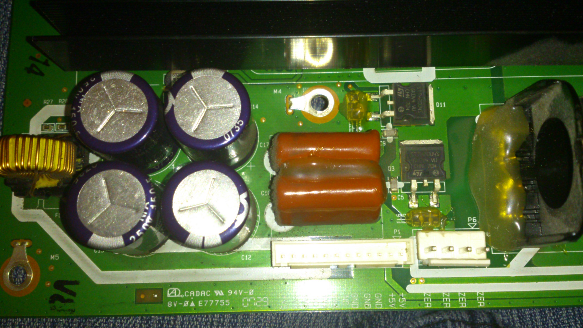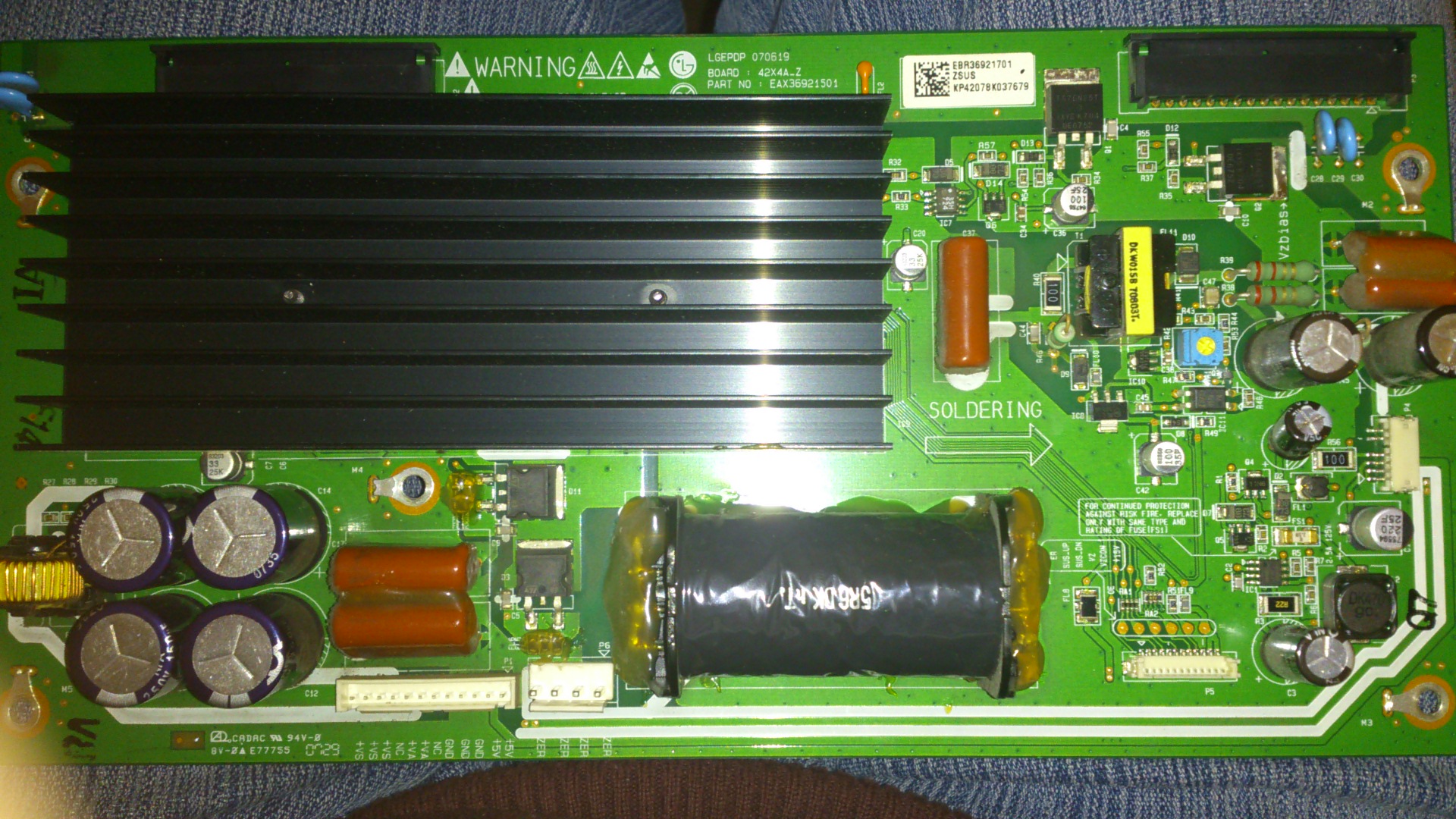 I have a mentioned LG plasma and I had a power outage during the night. In the morning TV was dead. I narrowed the problem to a mosfet on the power board, replaced it and the TV powered on, but there was a red-white blotch on the screen, pulsating a bit and there were horizontal red lines in the bottom half of the screen. I have found that th YDRV board was toast (two of the chips, in fact) and I replaced it with one from ebay, so the red lines are gone, but the blotch is there... I checked the YSUS and the fuses, mosfets and the hybrid were all ok (no shorts). I also checked the voltages and the only one that was off was the 3.4V_ON line, which was 4.3V. I'm clueless on what to check next or what is my next suspect...