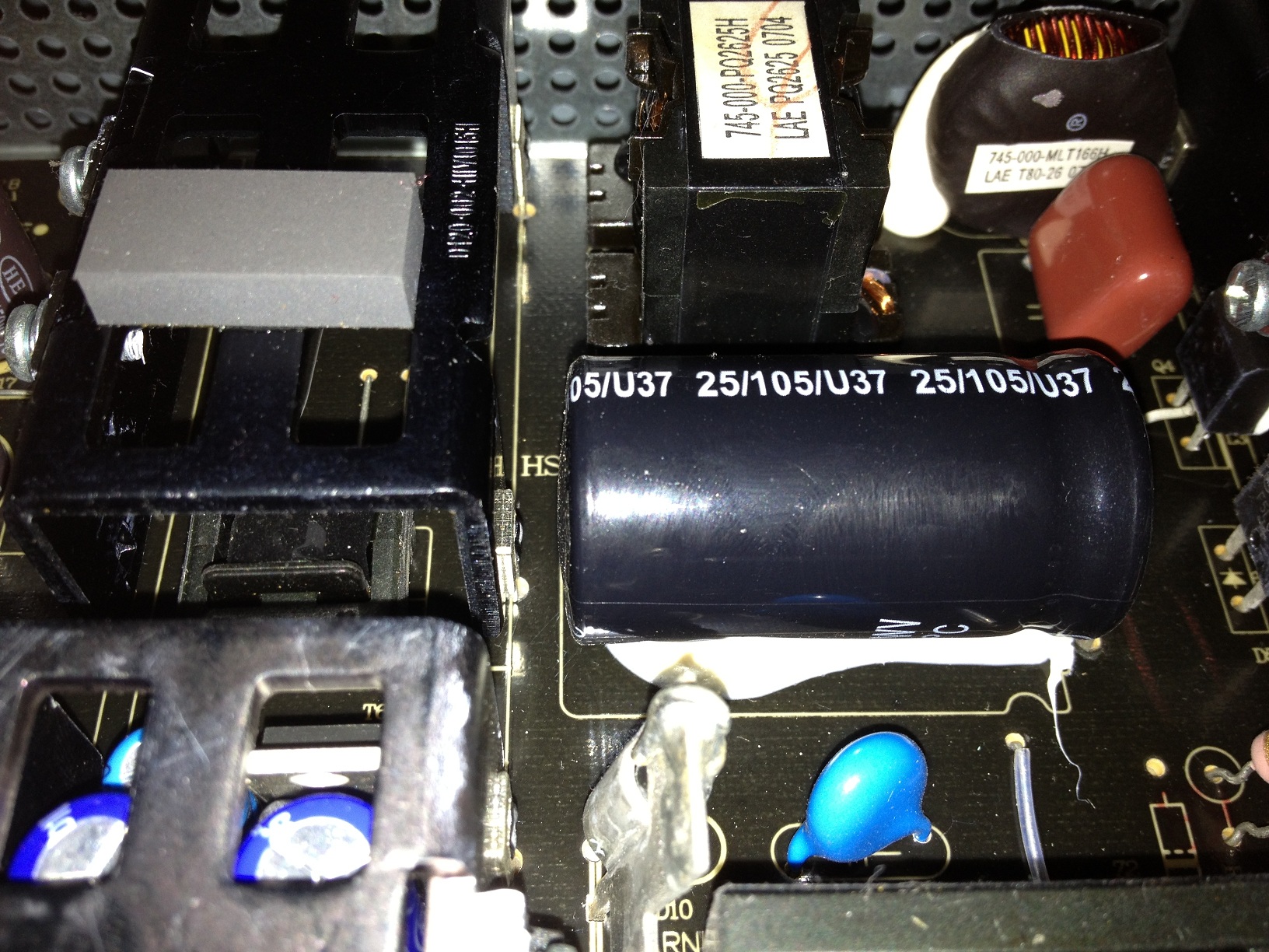 The two caps that traditionally bulge in the upper left corner of the power supply in the picture are not bulged. The really large one looks questionable but this cap doesn't look like the smaller ones so I'm not sure if the top should be domed or not. I don't have the proper capacitor tester to test it.