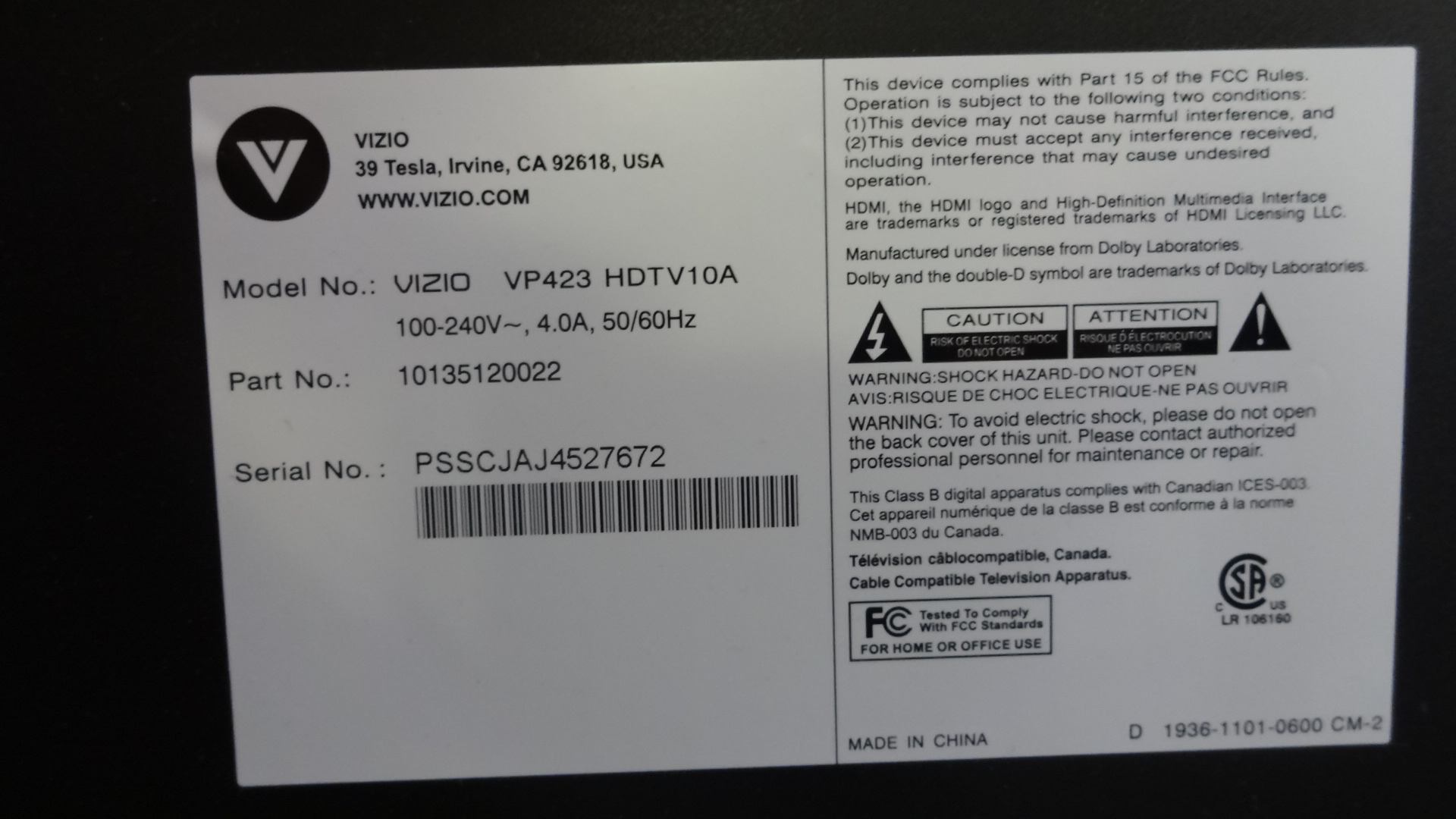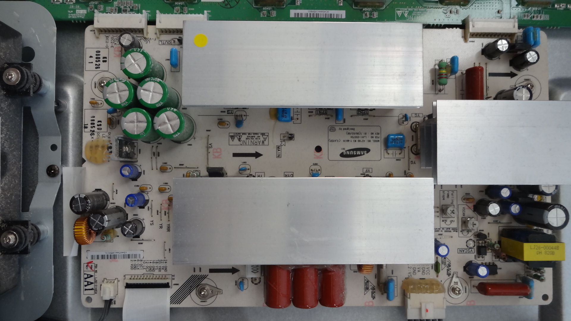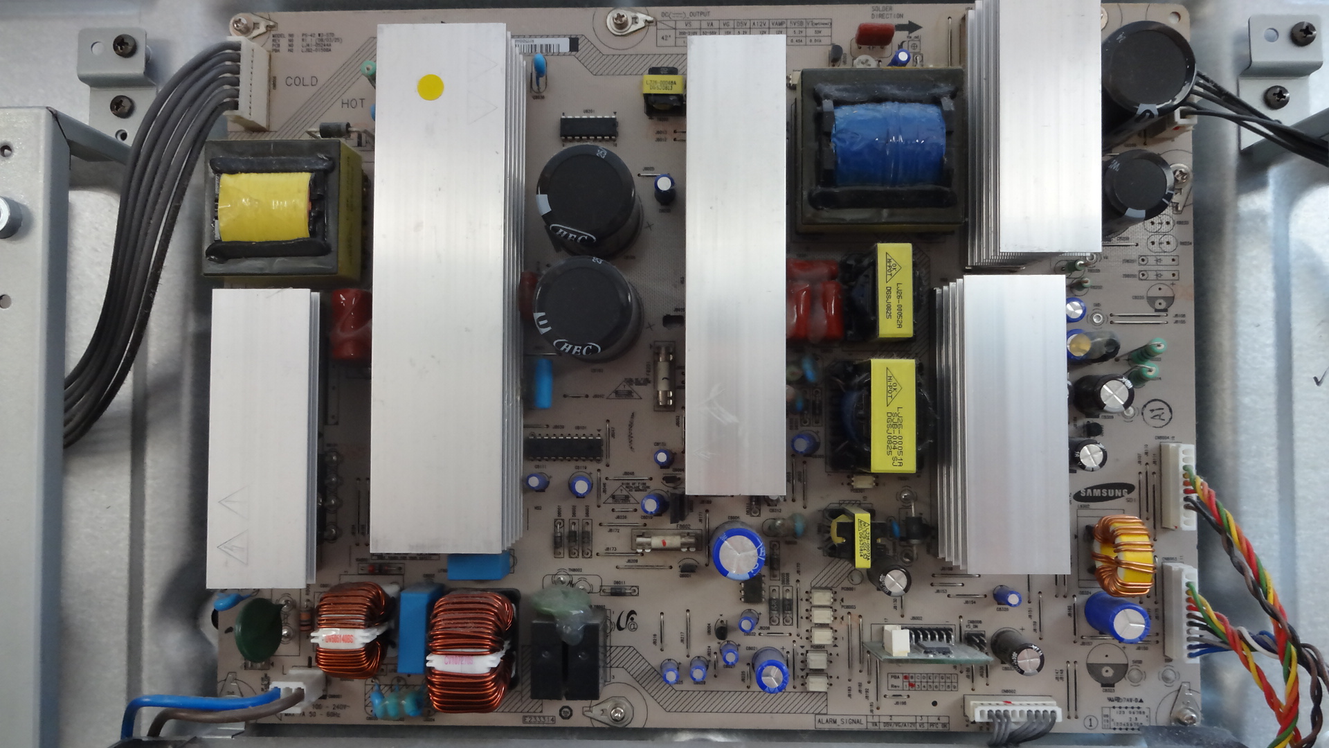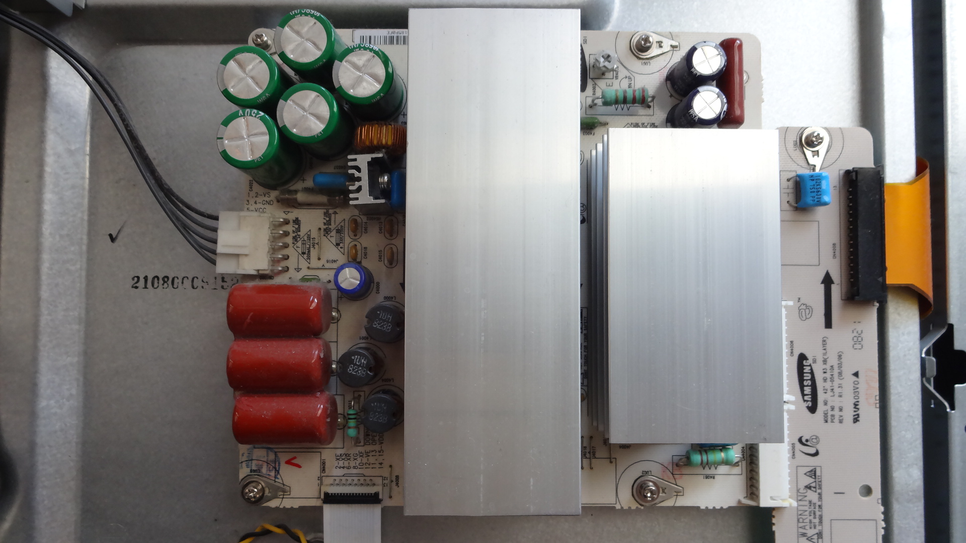 Alright, so I have a VIZIO VP423. When you plug in the power cable it makes a click (as TVs do when you turn them on), the backlight comes on and there is some faint static on the screen. Neither the power button nor any of the other buttons seem to do anything at all, and there is a faint buzzing coming from the Y-main board. The readings off of the main power board are as follows: