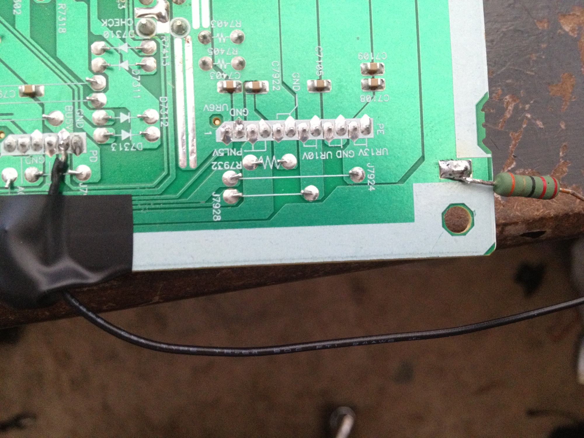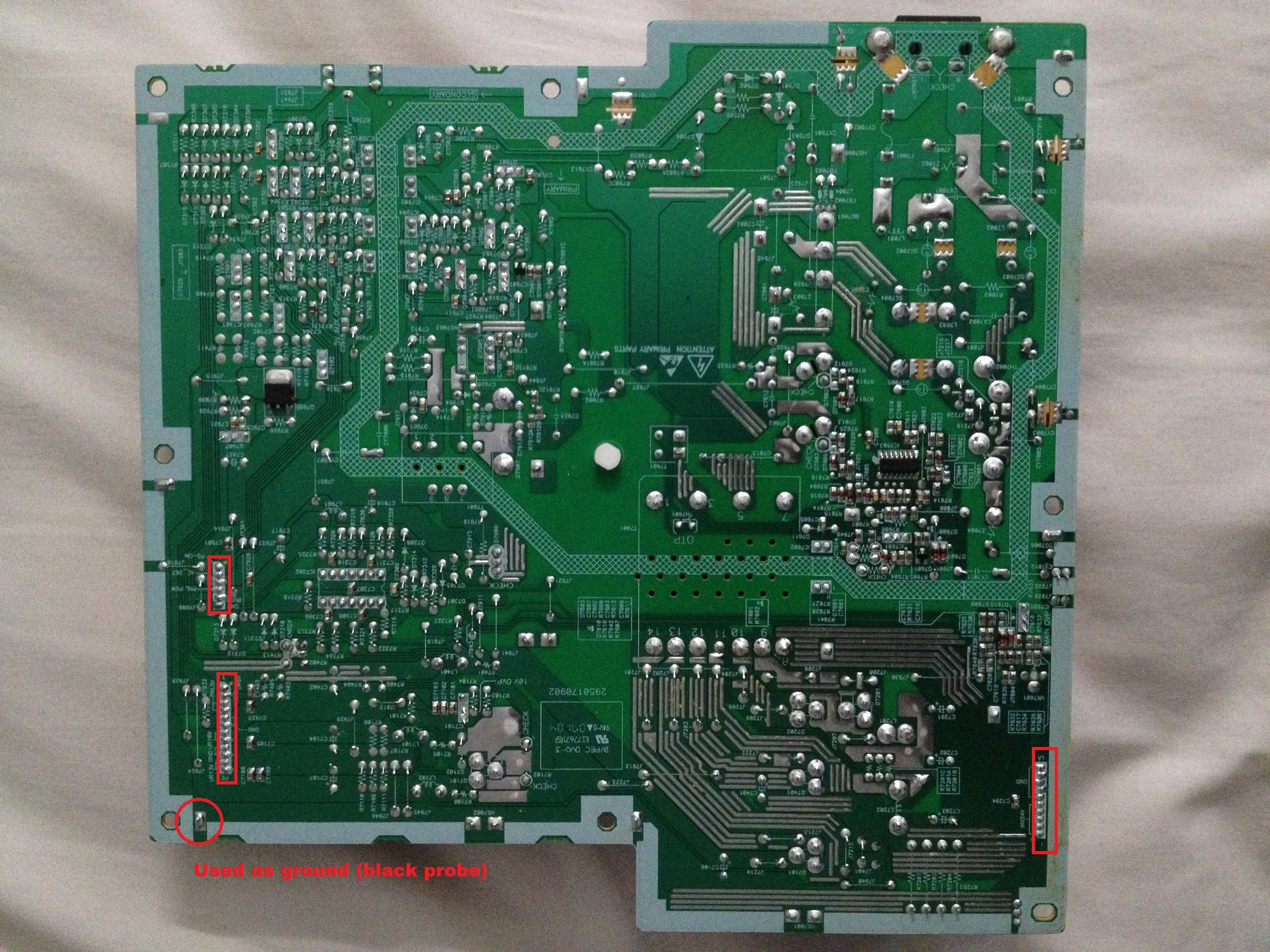 Hey I need a little help with this Sharp 37" LCD TV. I opened up the TV, there are no bad caps that I see anywhere. I checked the 5V output and there isn't any. I tried probing around the board and I can't seem to find any voltages anywhere, on the secondary (If i did it right, black probe on ground and red probe on the board)