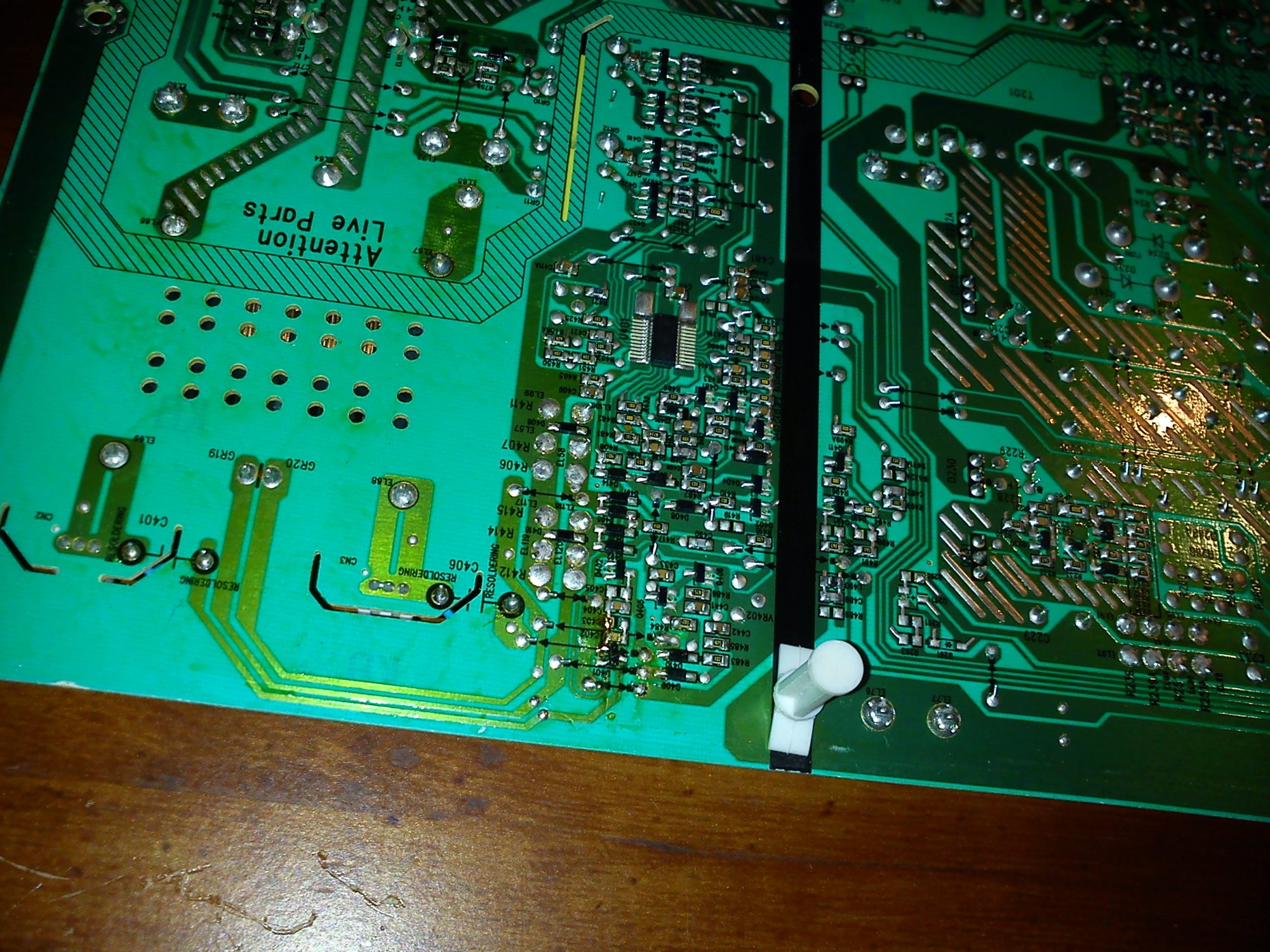The only spot on the board that looked like potential trouble was on the back of the board. This is near where the backlight(s) plug in. I attached an image, look about an inch to the left of the white peg. Maybe that is just flux? Difficult to tell from the image, sorry for the poor quality.