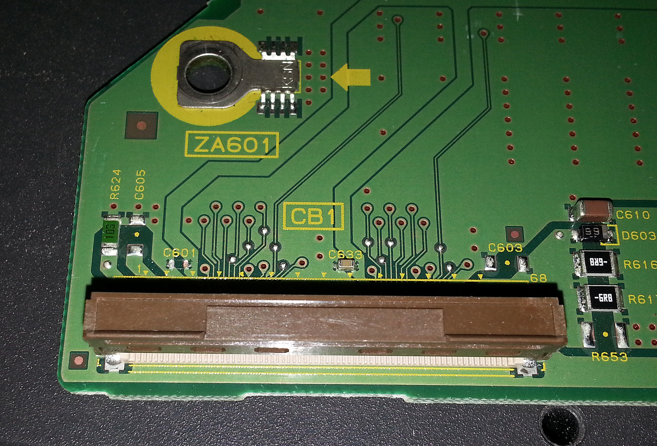 C601 is missing on the new buffer board, however, I'm not certain if that was the pop or not because the burning smell appears to be concentrated closer to the second ribbon connector and a little to the left (where C607, D602, R622 and R623 are) whereas C601 is above the left-most ribbon cable.