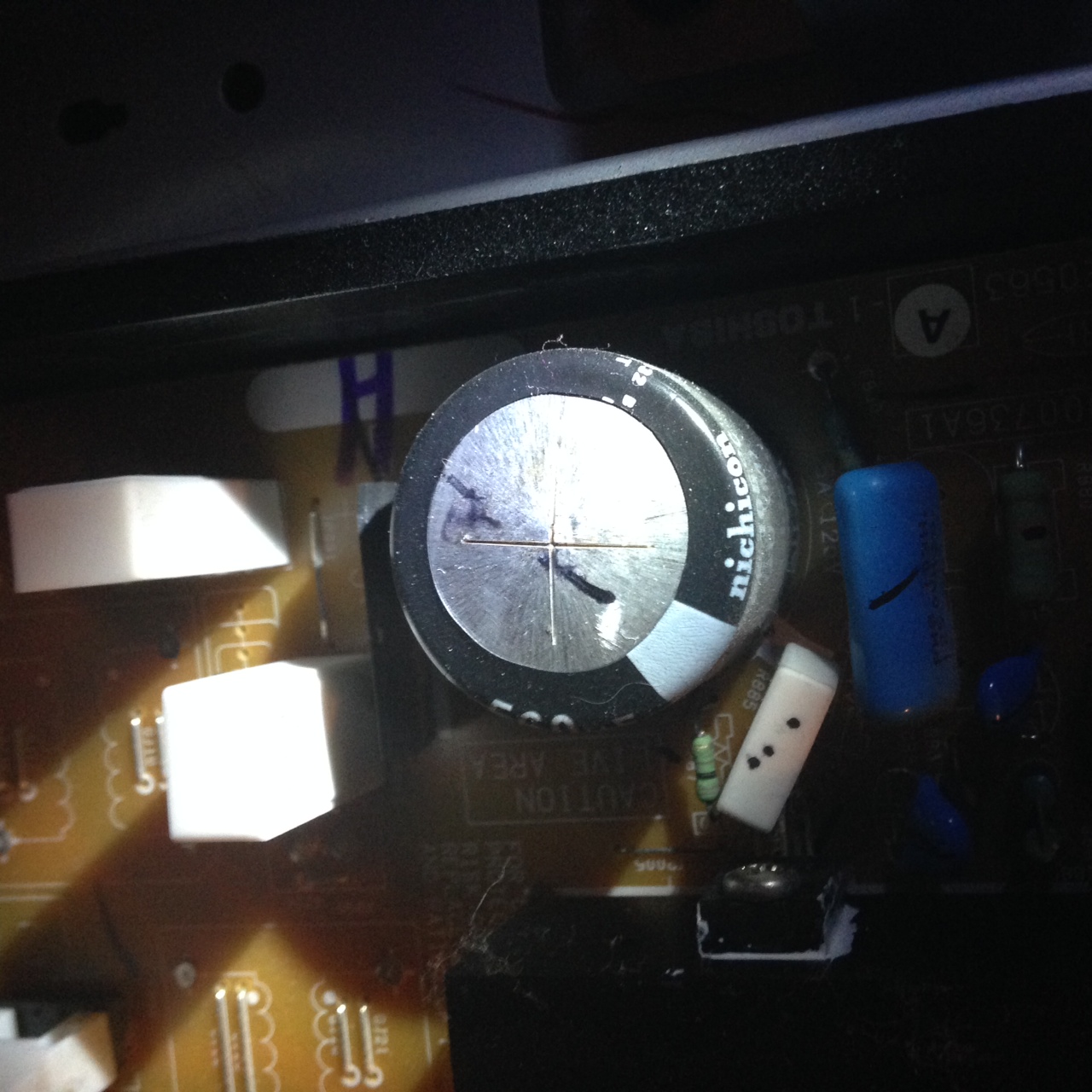 This is the cap on the sub power control. Could this be a reason for the vertical rainbow lines since it does feed into the video board then into the T-Con