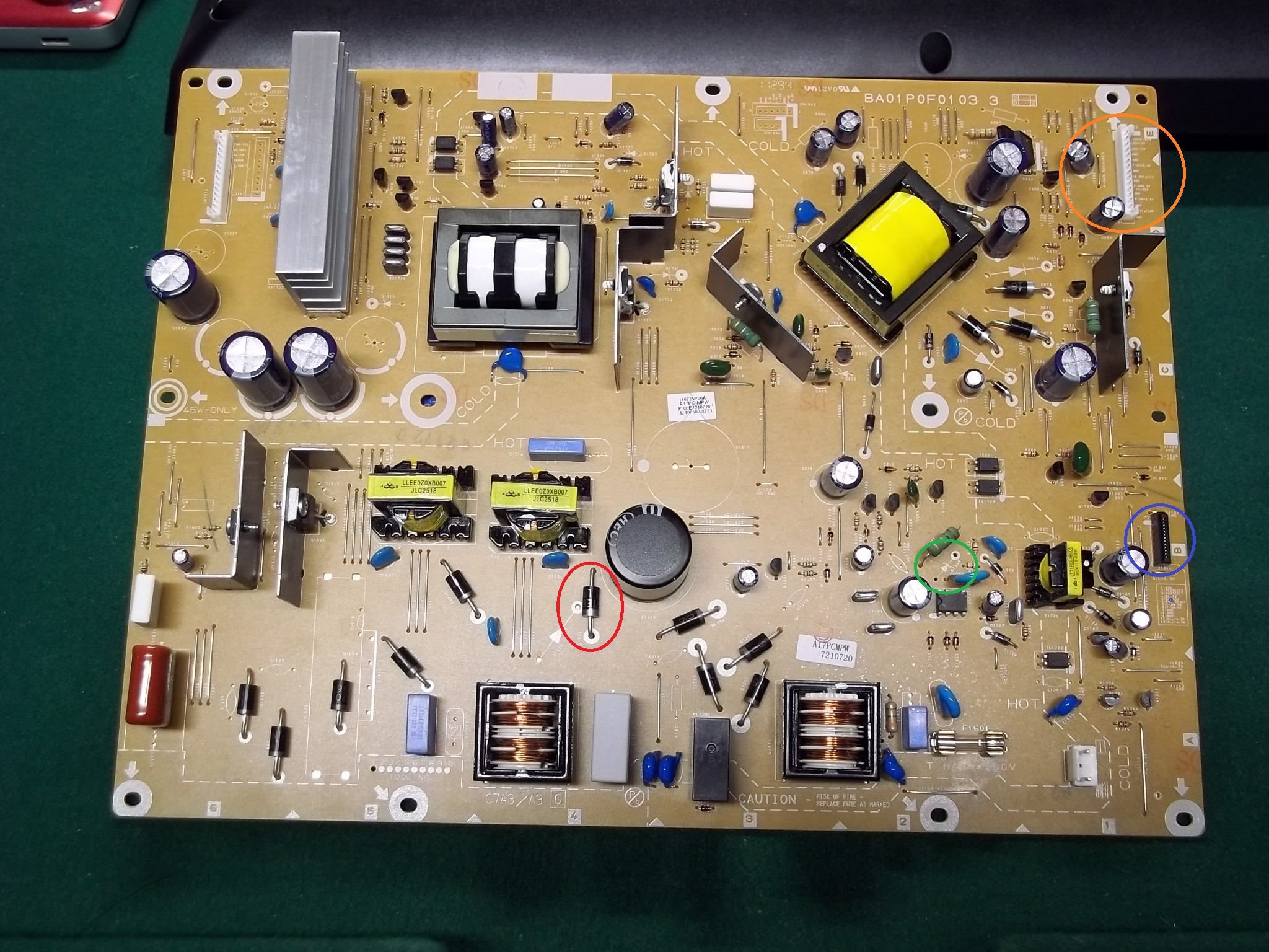 Hello all. New to the forum and looking for some help. I have a similar problem with the power supply blowing the 8A fuse. I have been through several threads on this power supply but it seems I have a different problem. Found the blown fuse and checked several of the diodes and found one shorted through. The diode that I replaced is the one circled in red. Now after reading a couple of threads I check the diode D1208 but it tested good. Now I did find a service bulletin that said if this diode is found bad you should just remove it. So just by chance I removed it, the spot is circled in Green. Still have the short but what I found is that if I leave the cable off coming from the tuner, which I believe is what activates all of the power supply sections, the fuse is fine. This connector is circled in blue. Now I can have the ribbon cable that powers the tuner connected, circled in orange, and I do not have a problem. Kind of lost at this point and looking for some guidance. Thanks