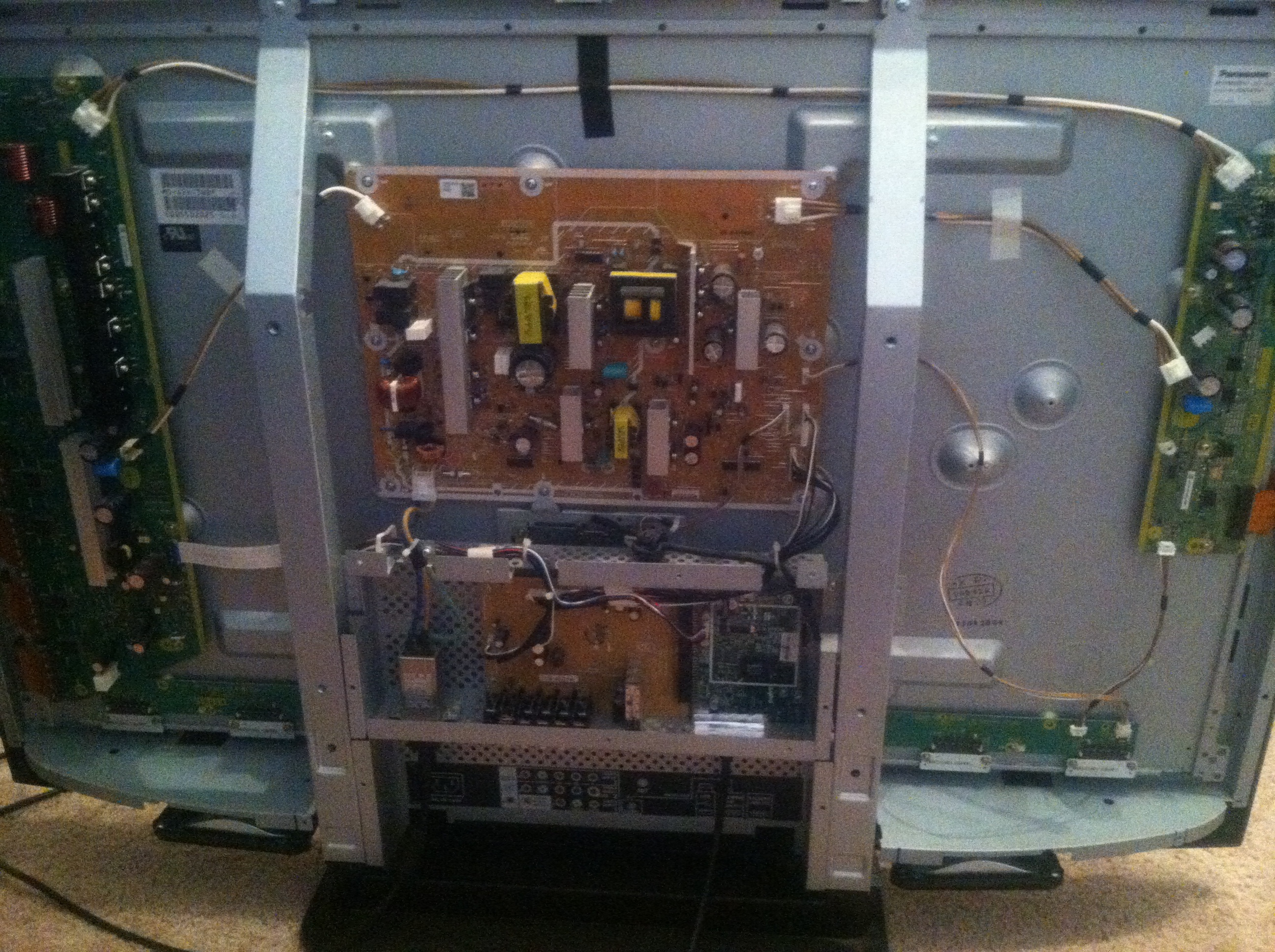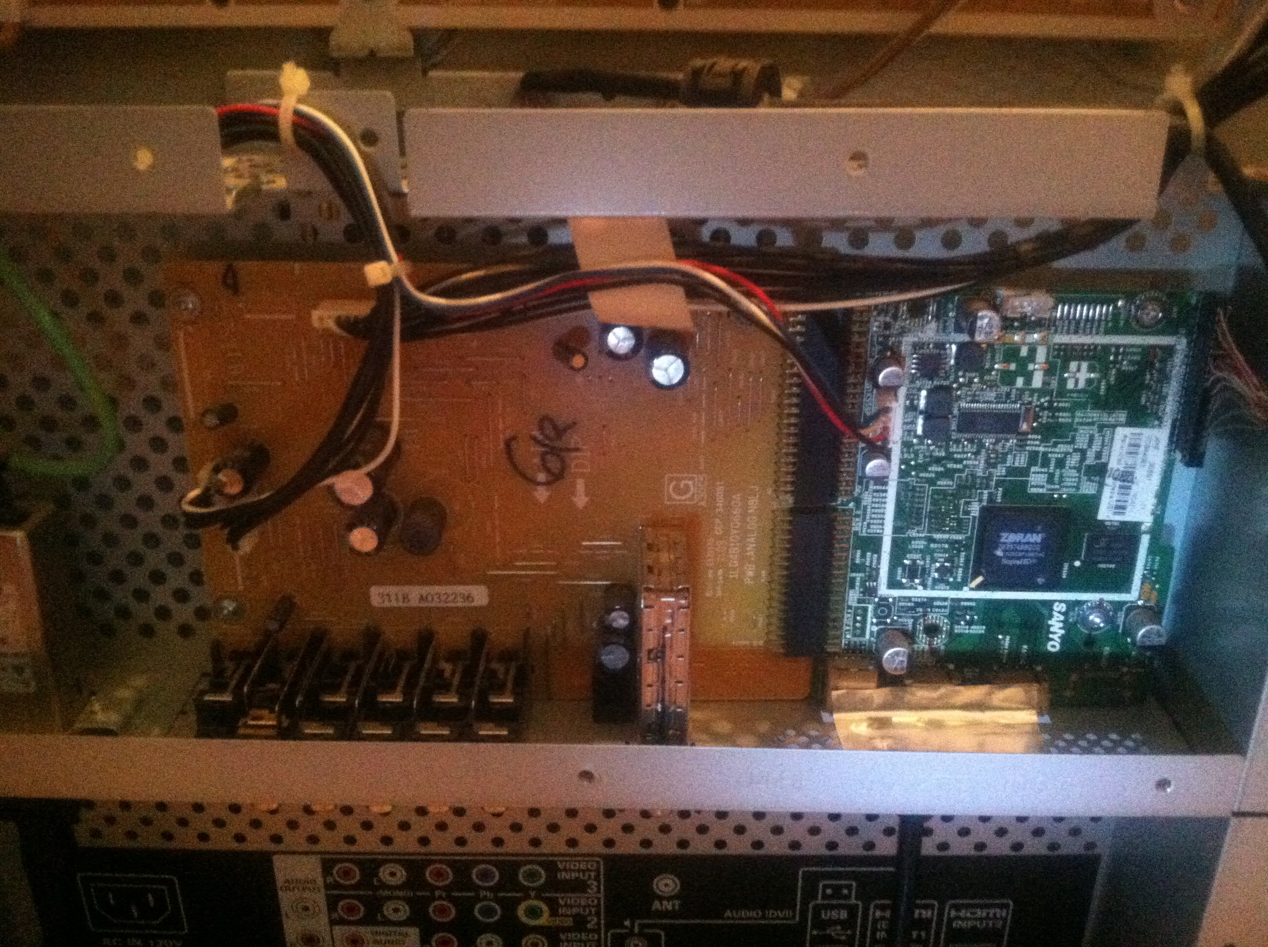 My Sanyo DP42740 Plasma won't turn on anymore. The power light nor the screen will even light up. not even an error code. I removed the back of the TV, and tested a few voltages and fuses and everything so far seems to be about right. I haven't been able to track down a service manual for this model though. I tried disconnecting different wires from the power board, and the only difference I was able to make was when I disconnect the SS board, on the right, from the power board the TV clicks on and the power led on the front of the TV will come on for a few seconds, then off for a few, then on again, etc. still no picture, audio, or even a dim light though. Could his mean the SS board is bad? I read in a few forums where others with similar symptoms had replaced the main board and all was cured. I bought a digital main and installed it, but no change. There's also a guy with a you tube video that said the same thing, with the same model TV, but his main board and mine are different. His is all one piece, but mine is half analog and half digital connected by a row of pins. Any help or comments would be great. Thanks!