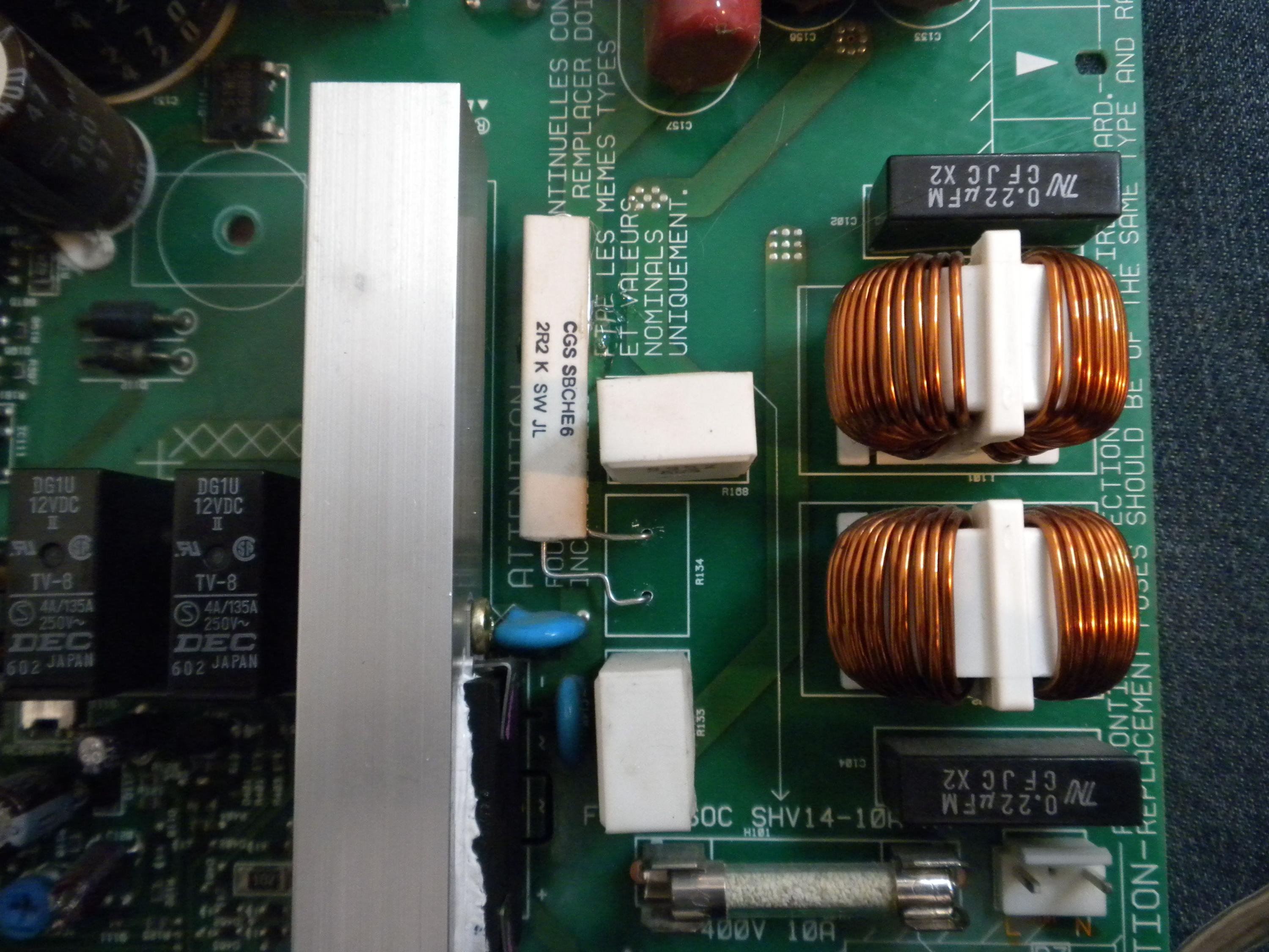 After getting the massive 50" TV home, I opened it up, and was delighted to see some very high-quality components inside compared to the other cheap and cheerful TV's that I have opened in the past. I had a read of tom66s thread here of the same TV with similar symptoms. He ended up repairing the TV by replacing the large FET and one of the power resistors on the primary side of the PSU. Sure enough, when I tested the Q281 MOSFET (Toshiba K2847 .9G , see attached image), it as shorted from Gate <=> Drain and was visibly damaged, and the resistor R134 (2.2 ohm, 7w ) was open circuit (both circled in one of the attached images). This resistor is in series with two other similarly rated resistors. I sourced three Toshiba K2847 .432 and four CGS SBCHE6 2R2 K SW JL power resistors (some for spares) from ebay. I replaced both on the board, having to mount the power resistor on its side as it was higher than the cover would allow.