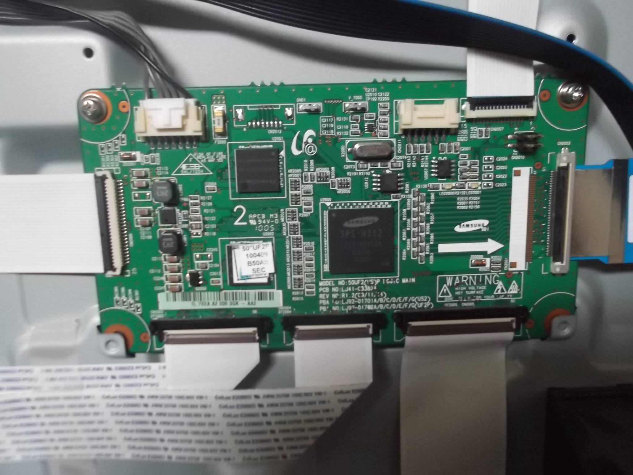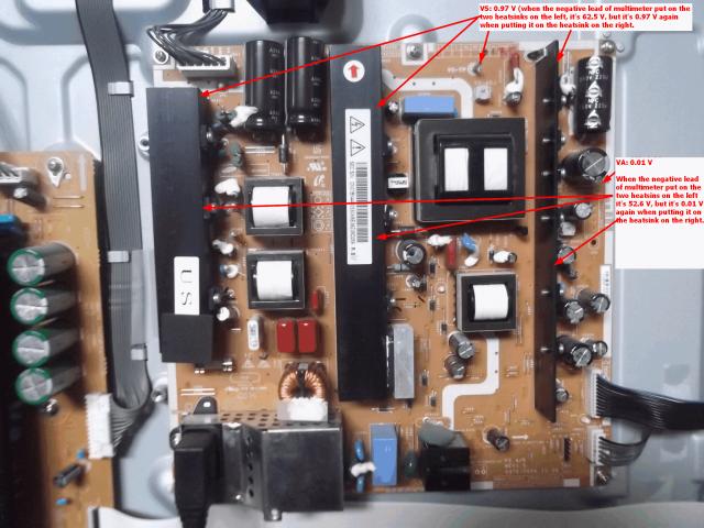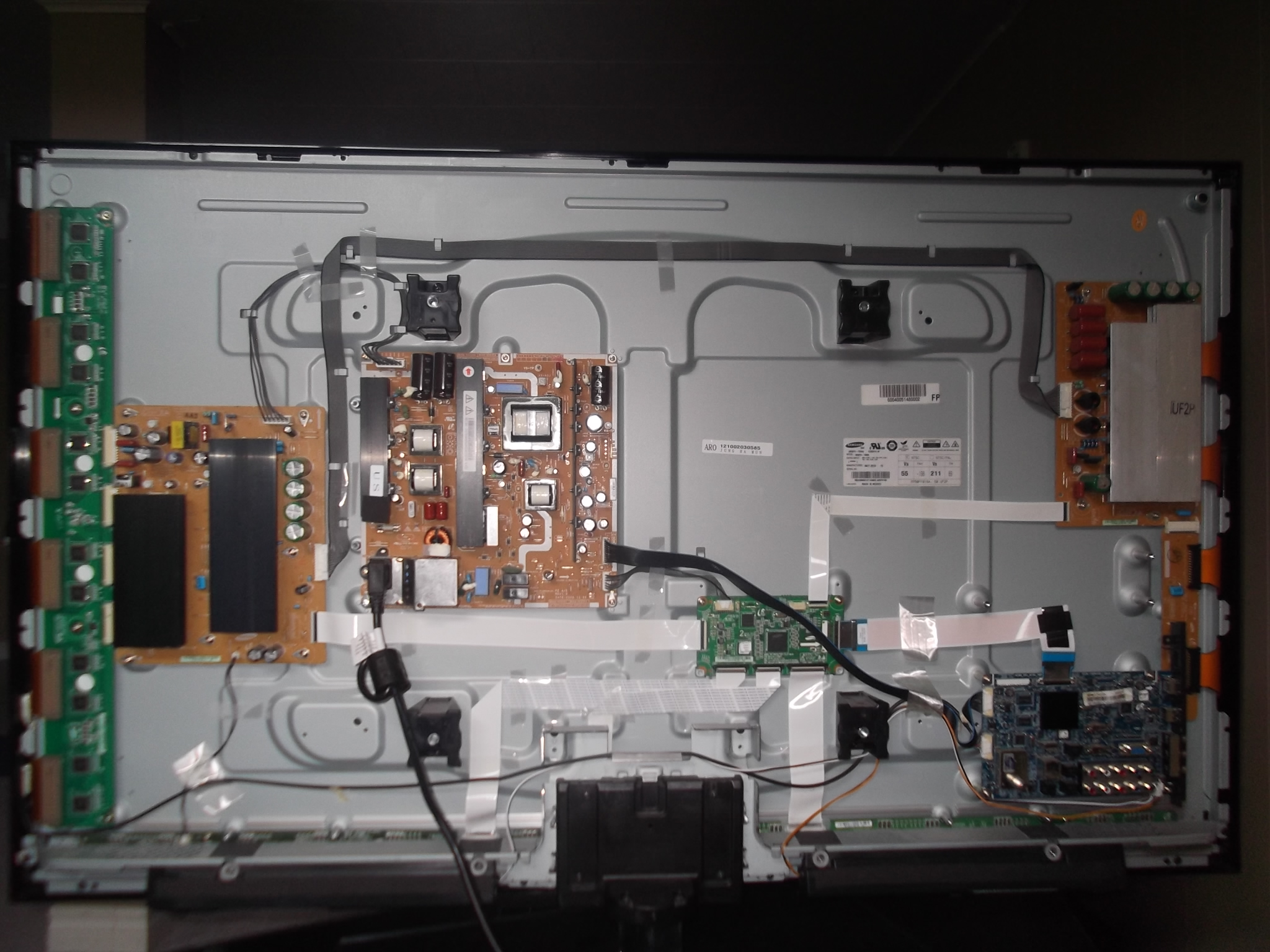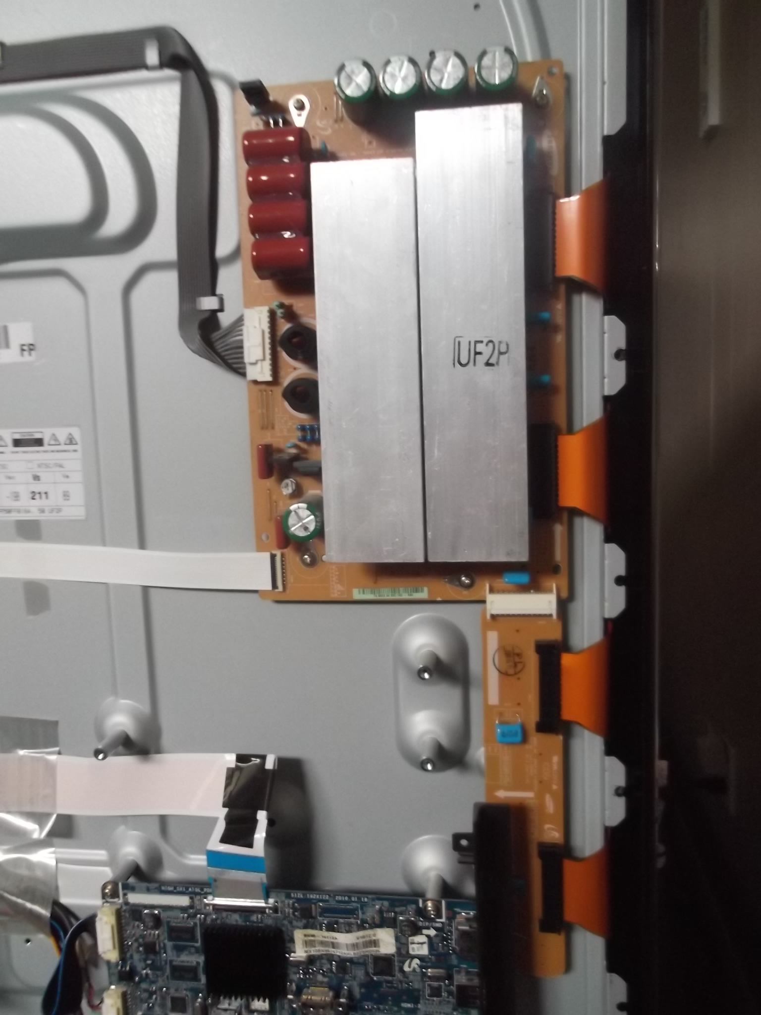 Today, after removing the back cover, I noticed the small green LED flashing about 1 time per sec when the TV is on (the remote control and power button on TV work, but other buttons like menu, tools, media, channel, volume not working). I tried to check the Y-Sustain board with the Y-buffer board after uninstalling it and didn't find any blown capacitors (probably can't tell visually). Are there any fuses on both boards as I couldn't find them. Can you please help?