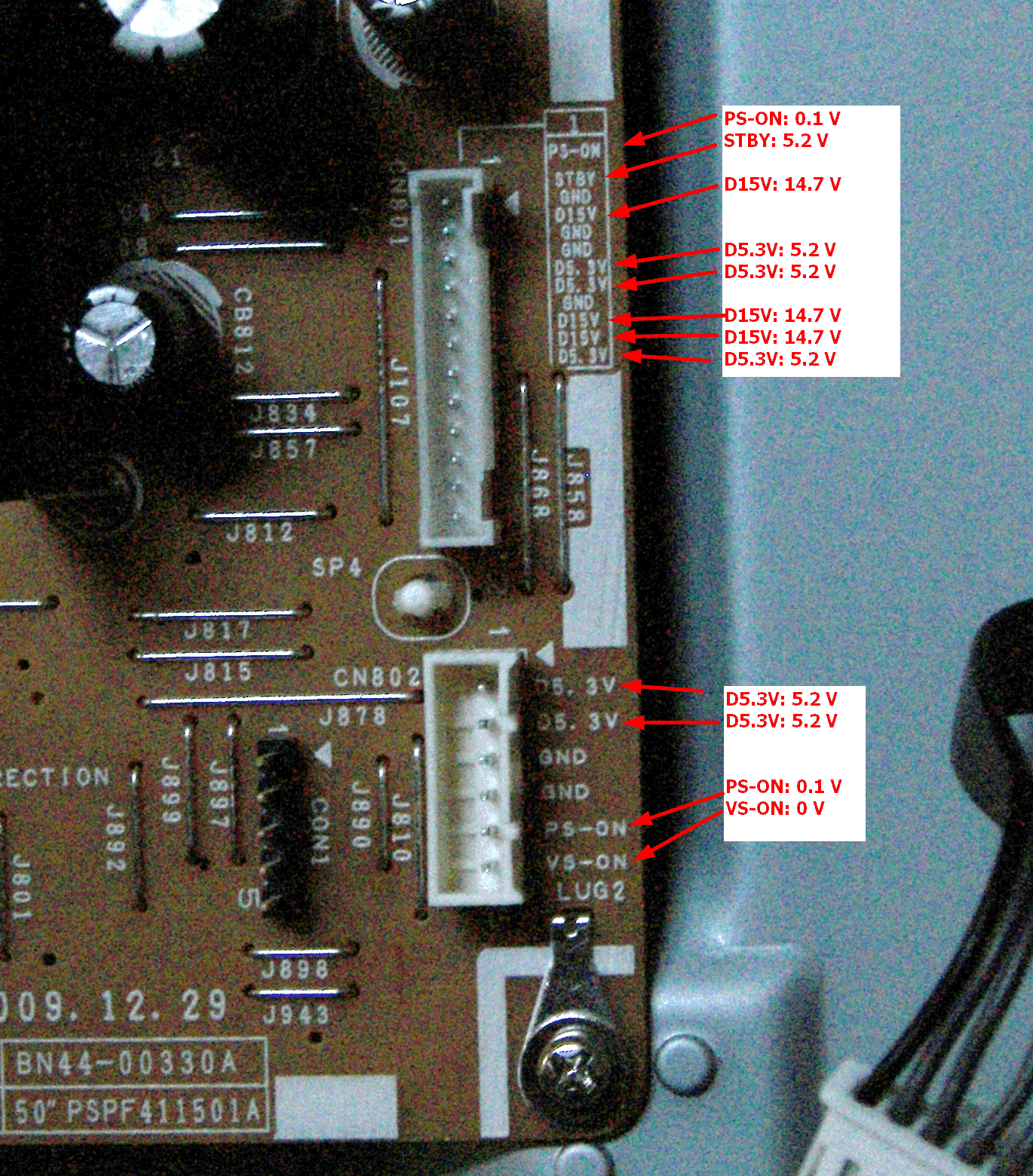 Also after re-installing the Y-Sustain and buffer boards, the TV can be turned on but without the high-volume buzzing noise and the LED on the back wasn't flashing any more.