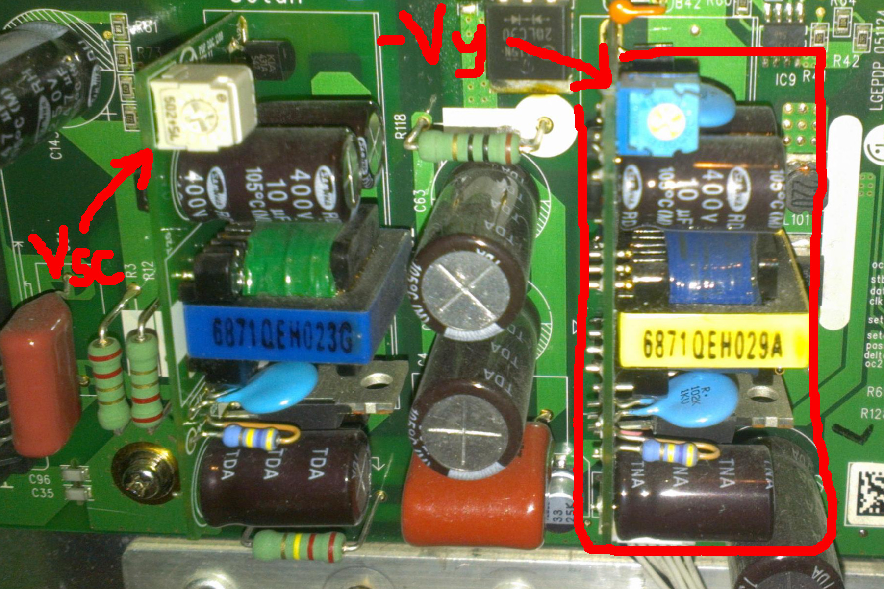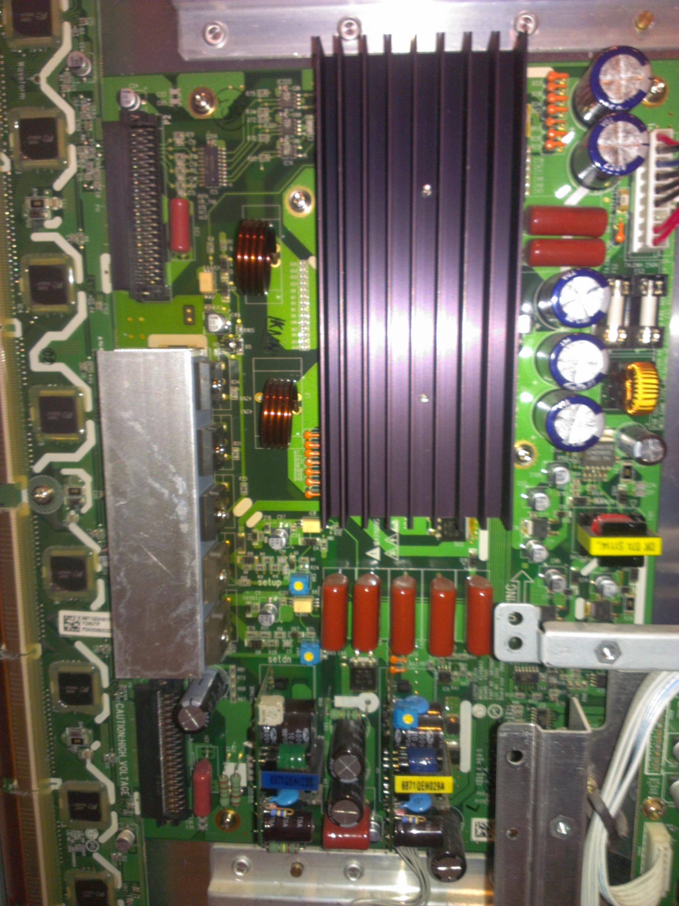 The TV popped and picture went out but had sound. Y sus fs2 fuse was blown. This TV model seems to have a lot of common Y sus problems that cause this so I put in an identical Y sus board from a donor TV. It started up great but I now have sparklies, mostly red, in dark areas of the picture. I set Vs to 180V and Va to 180V on the power supply per the service manual. I set Vzb on Z sus to 100V, Vsc on Y sus to 120V.