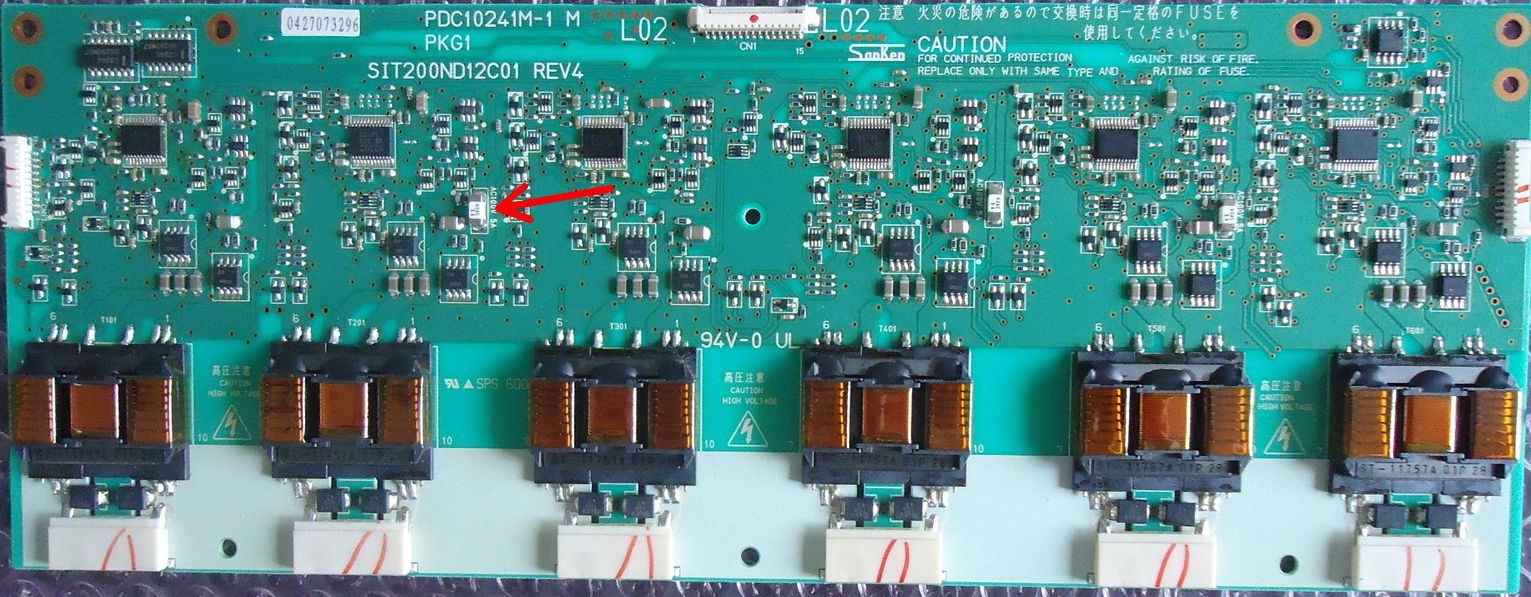 If you look at the red arrow, it points to a fuse labeled "100AC 5A". There are three of them on the inverter. That particular one is reading (infinite?) very high resistance. The other ones test fine.