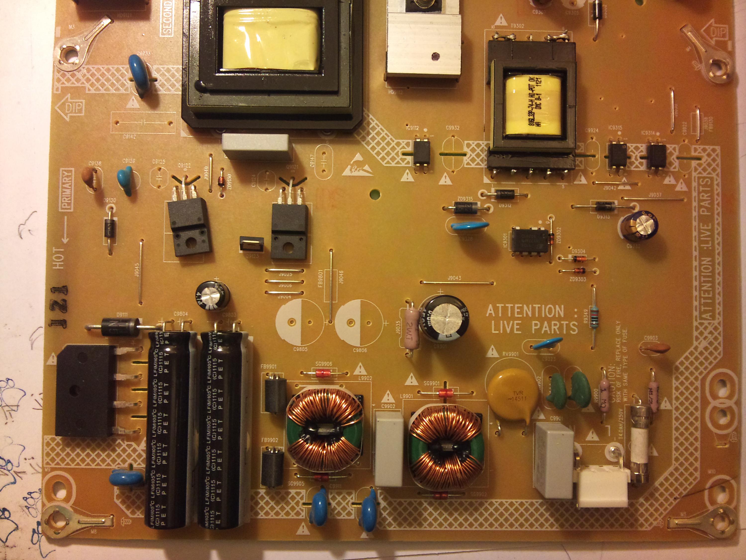 So I'm assuming the problem is located on the logic board and not on the power supply board. I see no buldging caps anywhere. Though there is one "CapXon" lytic cap on the logic board, but it doesn't look bad, and two "Elite" GP with an orange sleeving. It haven't seen any burnt component yet.