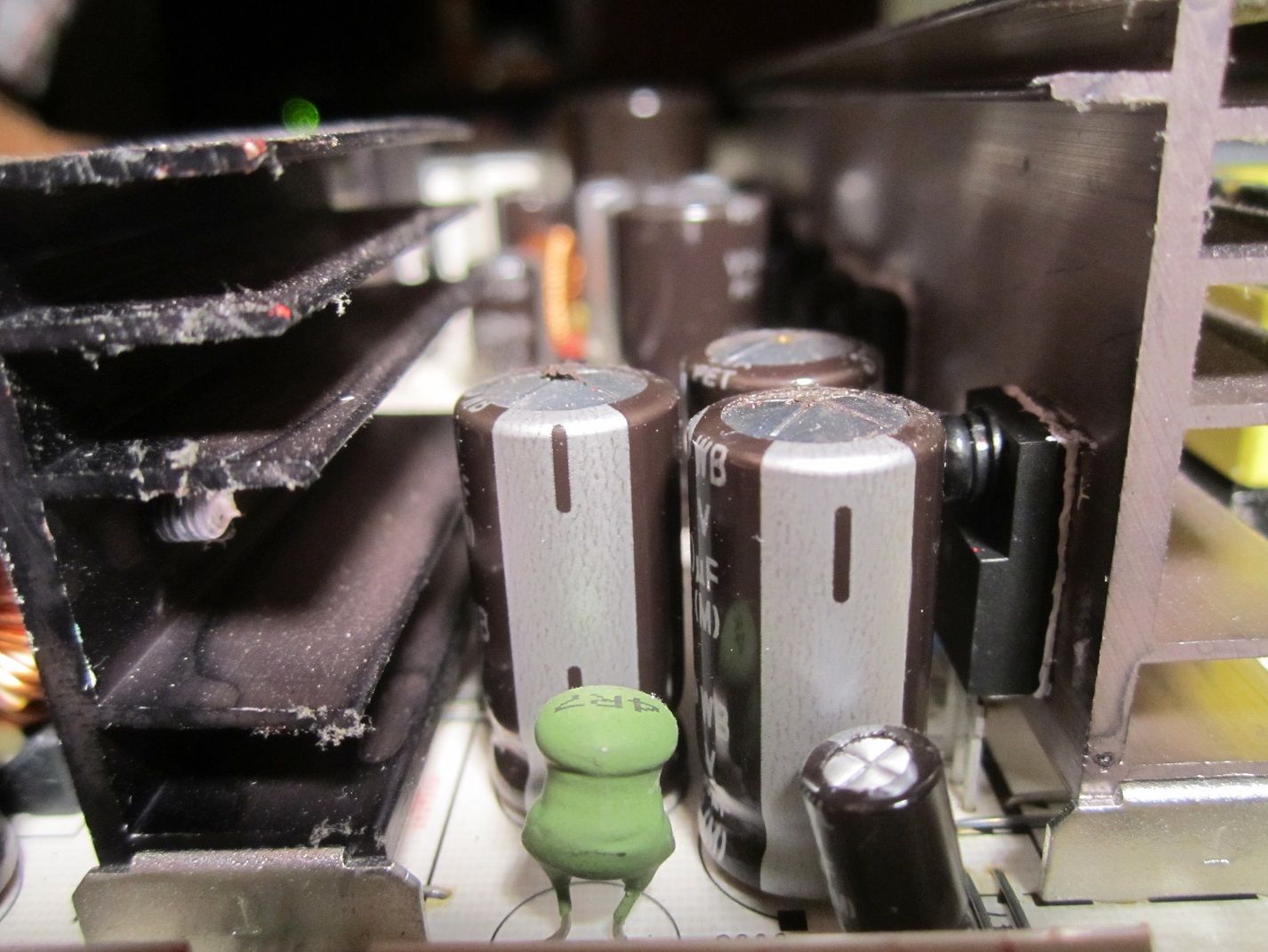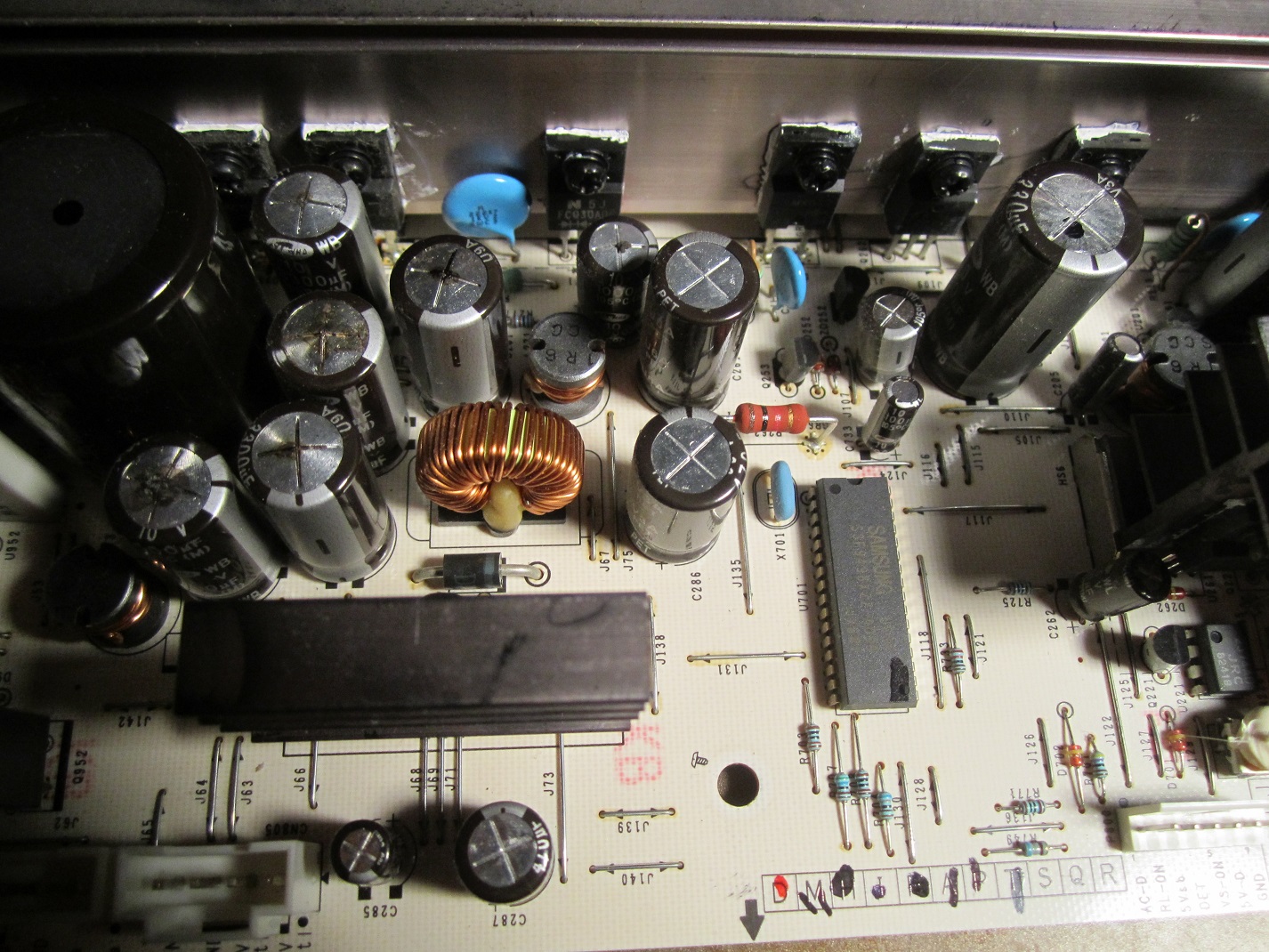 I put the 10 new capacitors on the power supply board in and plugged in the TV. There was immediately a fast double click followed a few seconds later by one more click. Then I pressed the power button and there was the same quick double click and a faint buzzing.... but no image when I pressed the menu button.