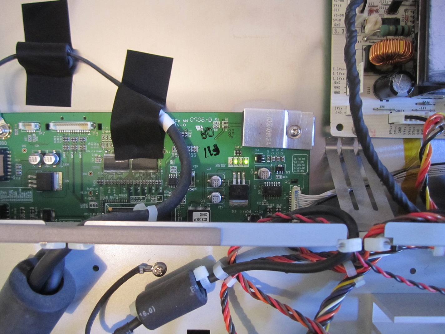 Ok, so I unplugged cables from the board on the left. (Which is I believe the Ysus, correct?) There are three cables, one with many wires coming from the power supply board, one leaving the Ysus going over the power board accross the whole unit and plugging into the Zsus, and another one coming from the power supply board to the Ysus but this one only has a few wires.