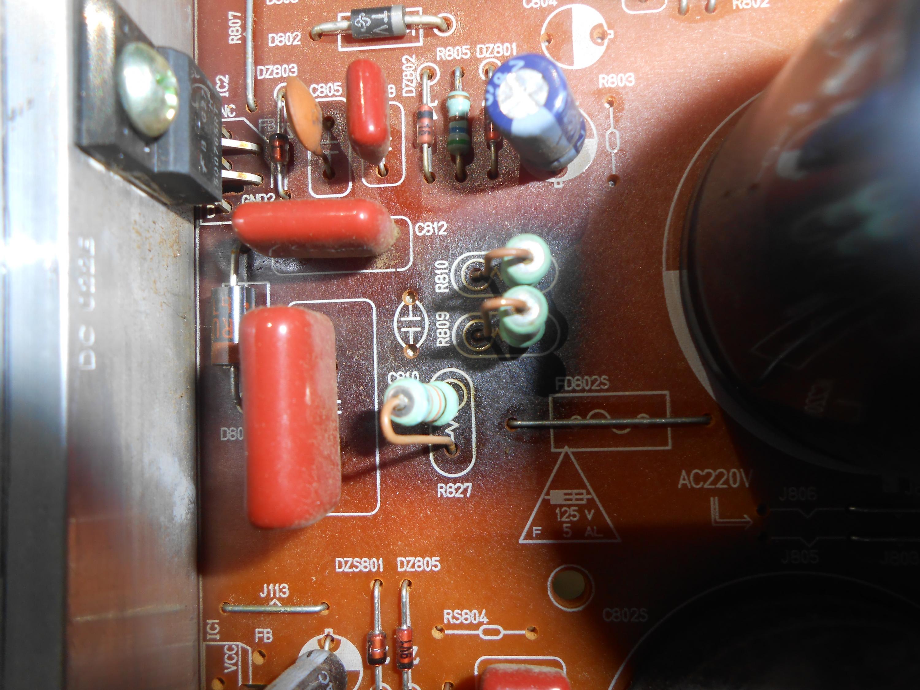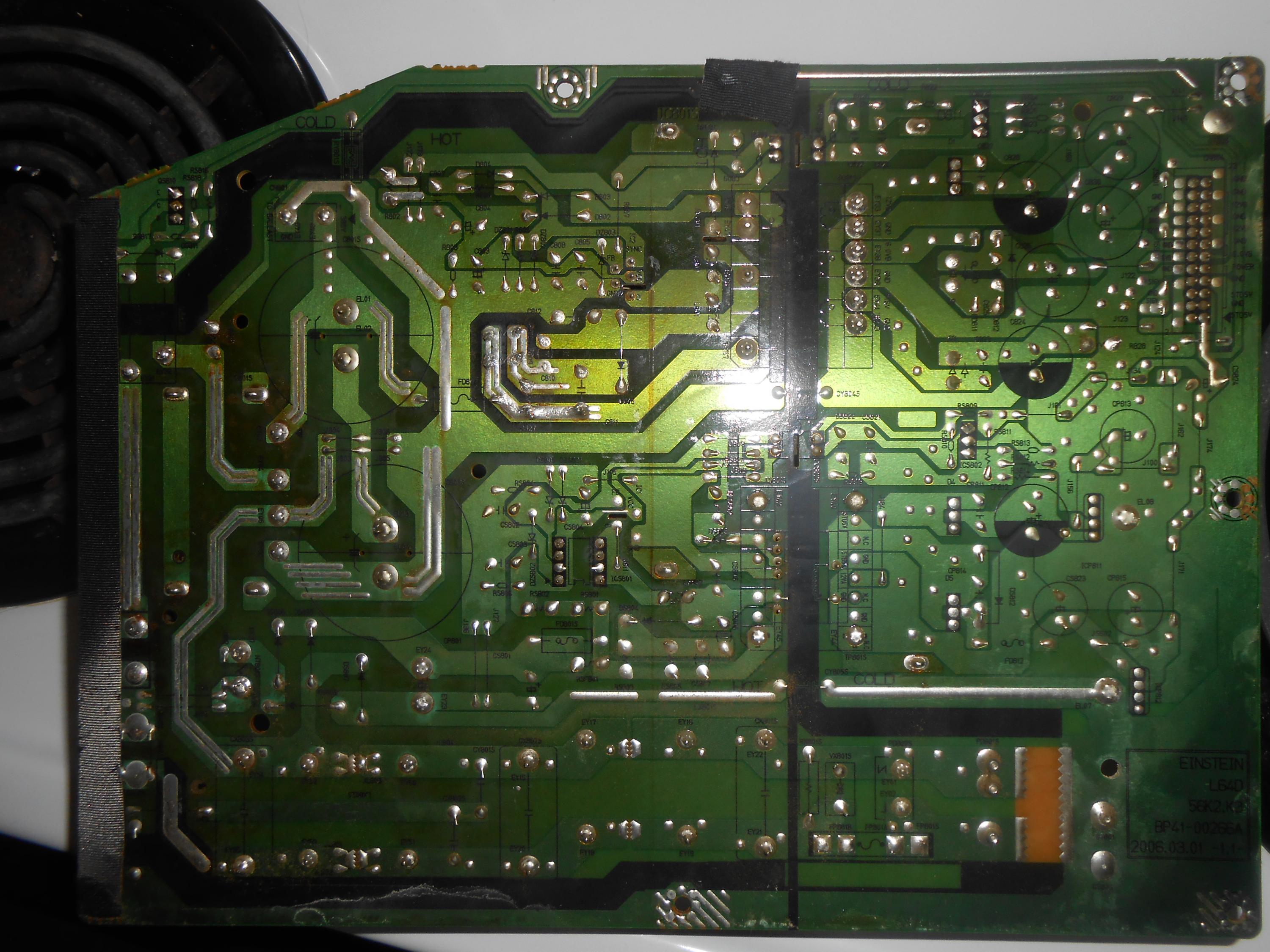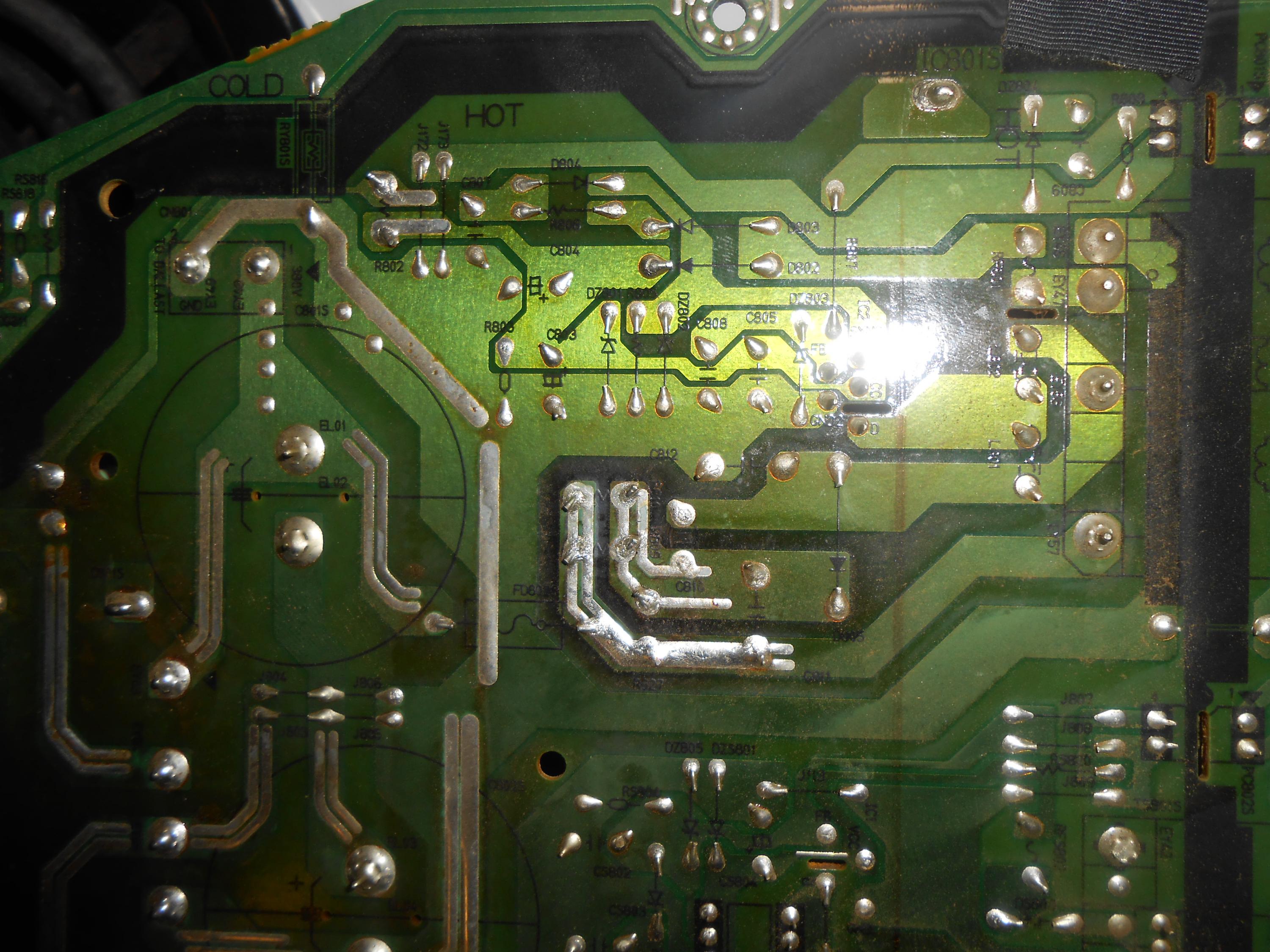 Alright here are the pics and i see a potential area of problem that has darkened the board it is right beside the two large capacitors that say 250v. Let me know what you think. i also took a pic of the back side and the solder in that area looks a little strange like it was real hot , i dont know.Comment