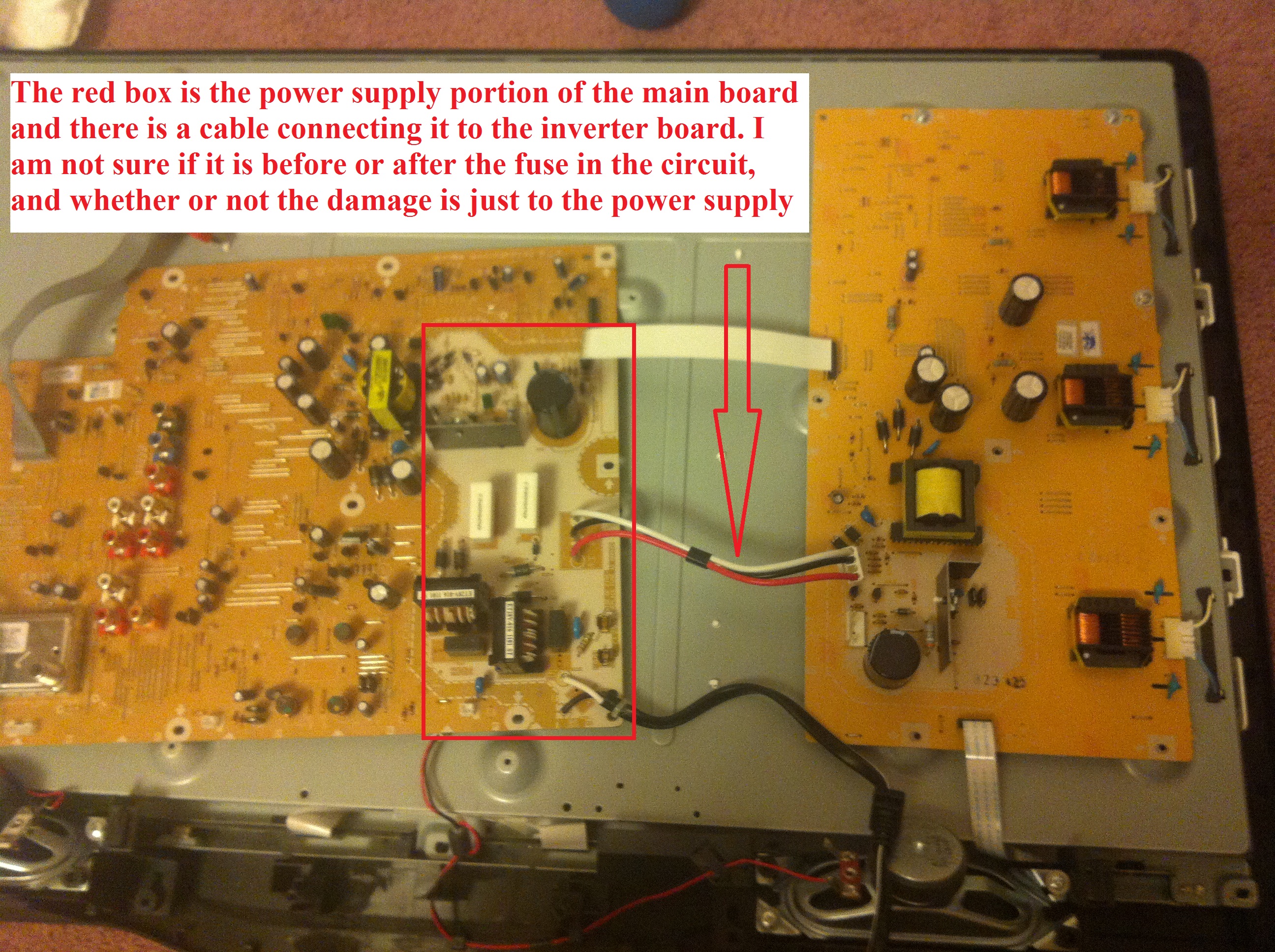 Im not sure of the details but I do not believe it was plugged into a surge protector. I found a replacement board on ebay for a price that im willing to pay (link below), and I also will link to a site showing the inverter board (the other board you requested) as well as some pictures of the inverter board on my tv set. I want to purchase the one off of ebay but only if it will solve the problem, i.e. is it possible the inverter board was messed up too? im not really sure how extensive the damage would be or if it was just stopped at the blown fuse. again any help or insight into any of this is greatly appreciated thanks for your time.