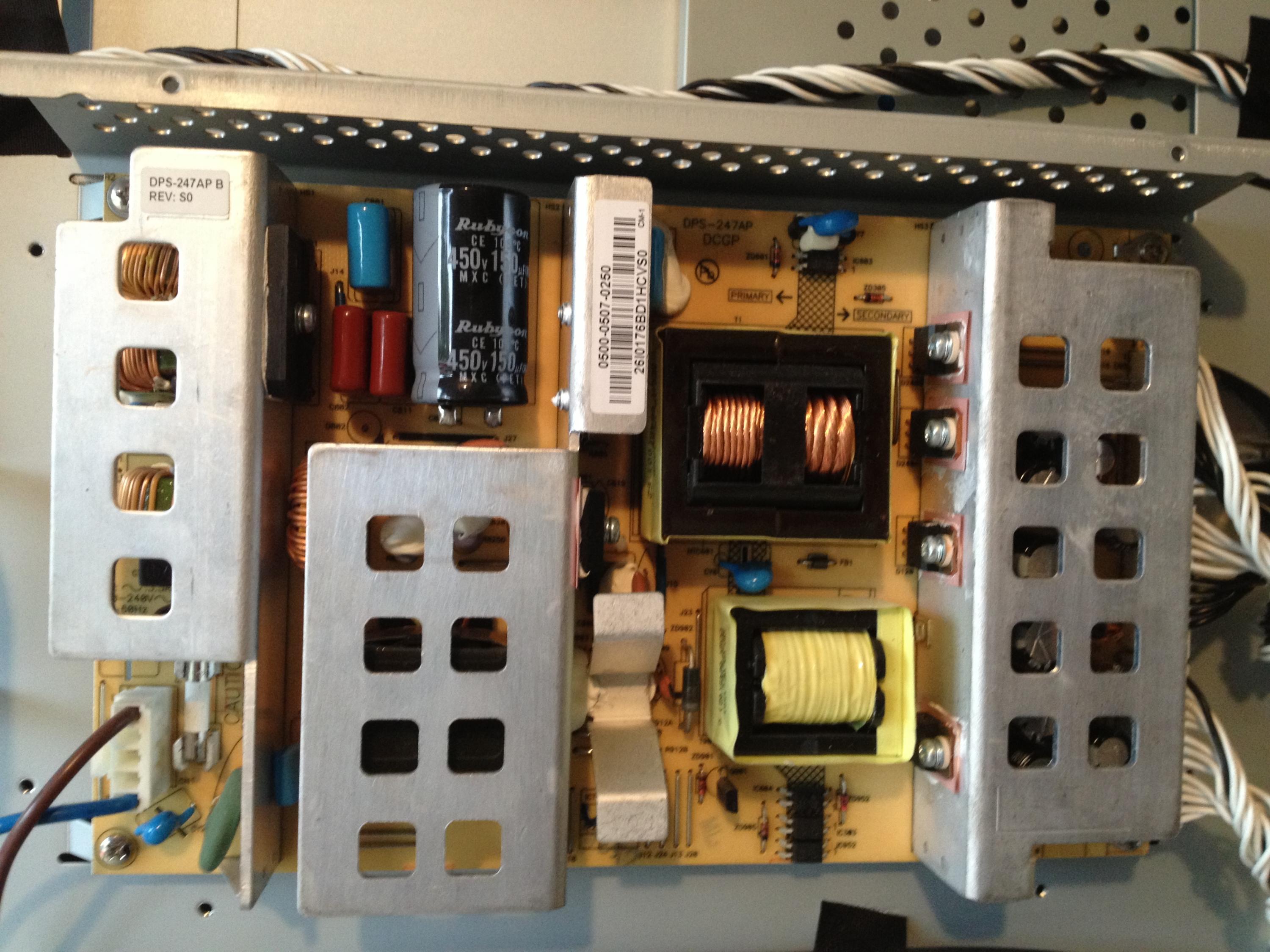 Picked this one up today for $25 and came home and took the back right off. Vizio light turns from Amber to White when I power it up with the remote or button the side. Started by testing the standby and as expected, its putting out 5V. When I power it up, the PSON shows 5V as well so I figure the control board is working. Moving on to the 24V outputs, they start out at 14V and quickly drop to 1-2V. I've pretty much decided it needs some work on the supply but thought I'd post for knowledge and reference in case someone else needs it. Opinions welcomed on where I could start with testing the supply for repair or if there could be another problem causing this.