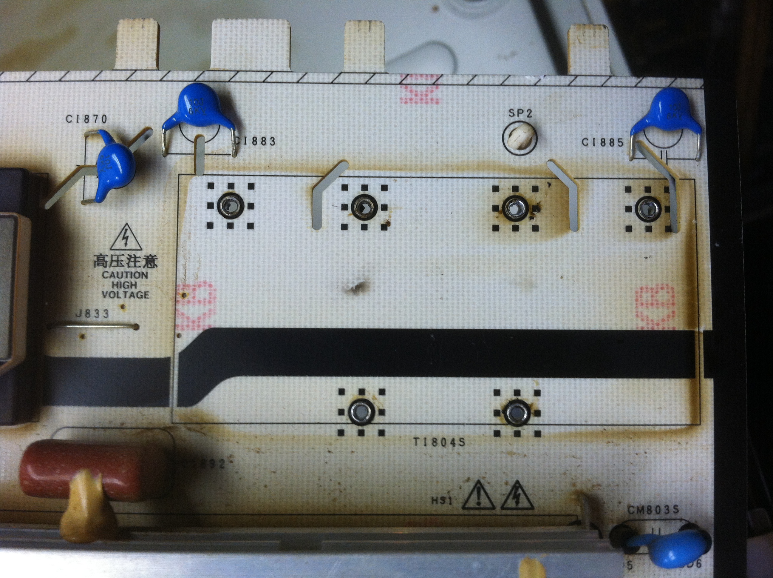 When I got it opened, there was one bulb out, and two dim bulbs. I don't have any 900MM bulbs, so I soldered a lead on each end of a 840MM bulb for test purposes. I replaced the failed bulb with the new one and fired it up. They all lit. I pulled the jumper from CI806 and tried again. The lights still cut off after a second. At this point, I don't know if the modified bulb is still drawing too much current and sending the inverter section into protection or if there is another bulb causing the problem. I saw a youtube video where the maker of the video was able to determine which lamp was causing the problem on a differeent Samsung with a different configuration by probing something on the backside of the inverter. Looking at the IP board via the link to ShopJimmy that I posted earlier, do you see anywhere I could probe to look for an abnormality?