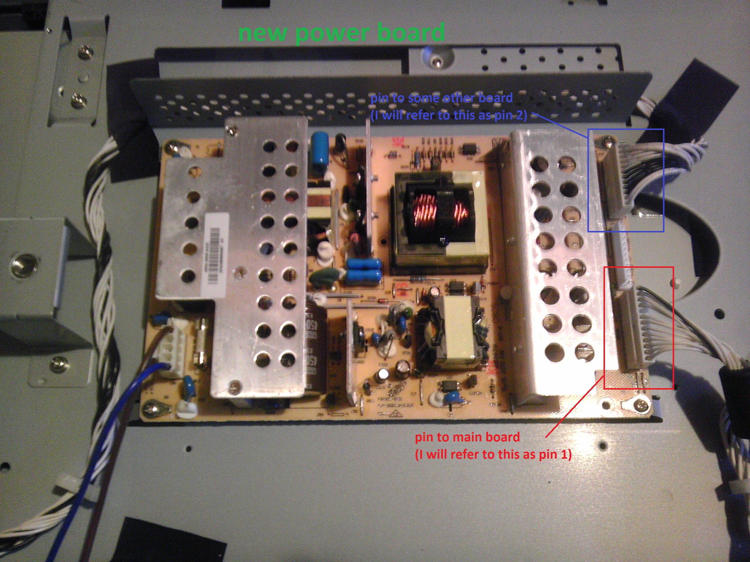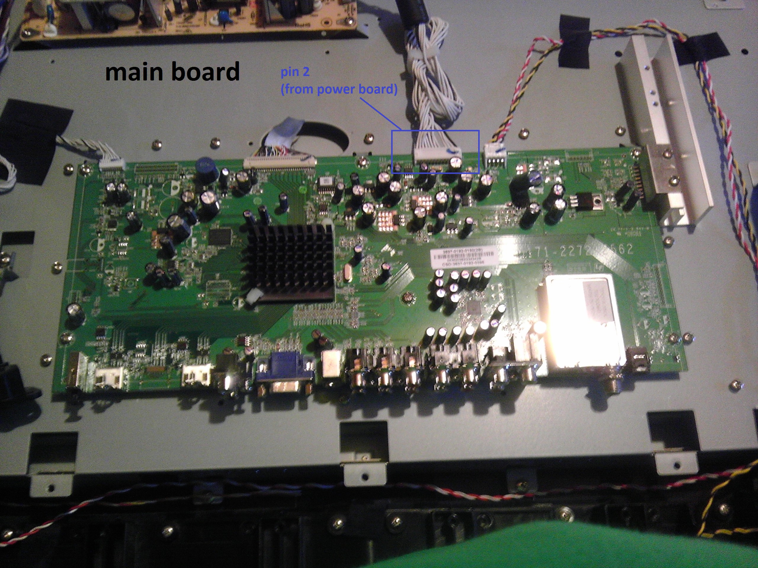I read up about similar problems and without thinking ordered a new power supply (0500-0505-0420). I put that one in and nothing changed. Then I did some more research and came across this great thread (https://www.badcaps.net/forum/showthread.php?t=17997). I read it through which led me to think that my problem might also be a bad main board. I was hoping to get the opinion of someone else on what might be my problem before I go and purchase another board. I have done some basic voltage testing and my results can be found by the corresponding pictures below. Also, when I plug the TV in, the amber Vizio light on the front light lights up. When I push the power button on the side of the TV, the amber light turns white (like the TV is turned on). It stays that way for about 40 seconds and then the light turns back to the amber color.