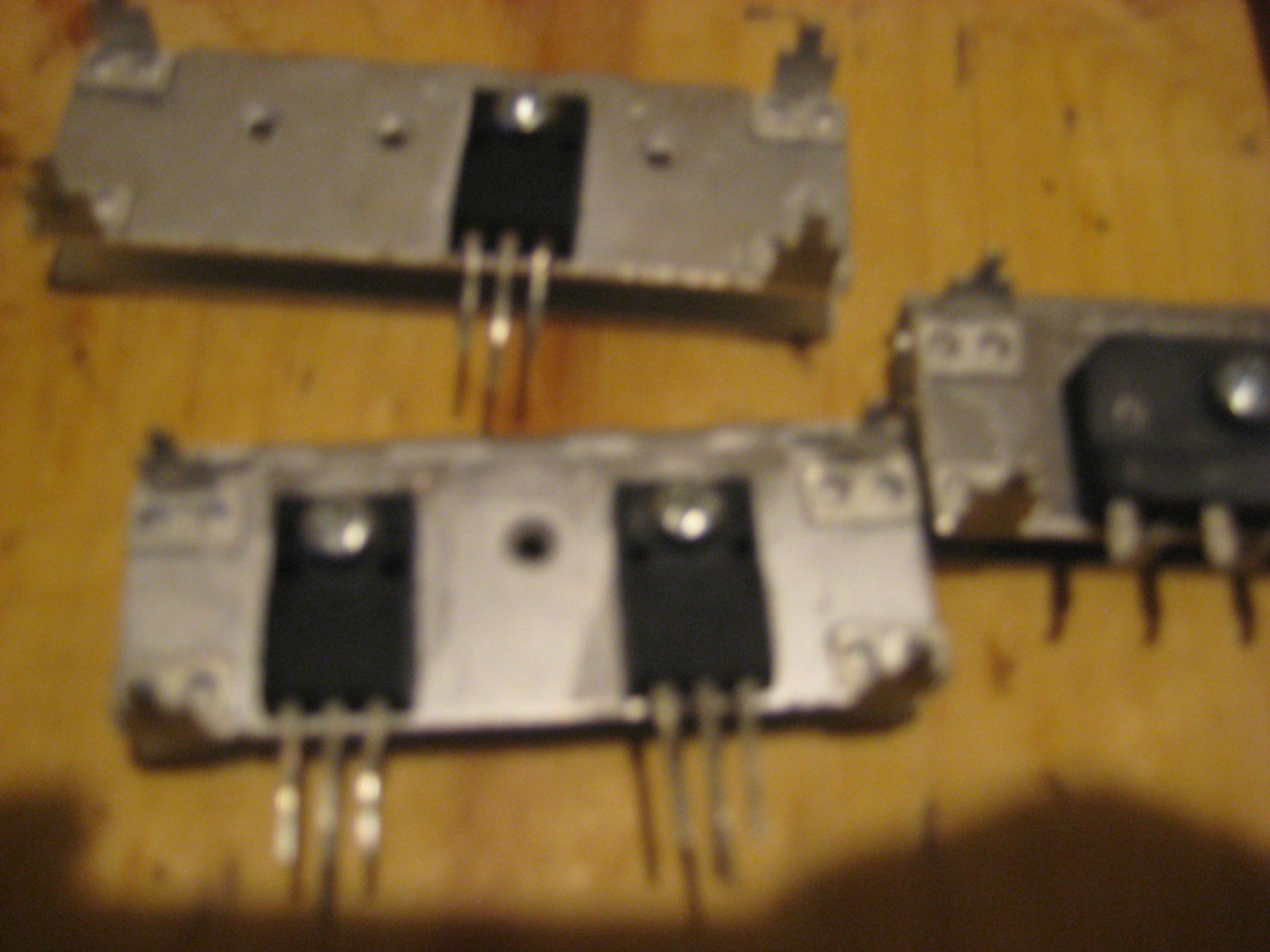 Physically, they all seem to be about the same size (3/8"x5/8") and the middle pin is longer than the outside pins. This leads me to think that the single is also npn, but that is only a guess, that I would not be willing to bet on. The "bad 1, is on its own heat-sink (about 1/4" larger than the other heat-sink), while the other 2 share 1 heat-sink. They are all 3 black with a "step" at the top. The only exposed metal on them, are the pins, the screw, and the heat-sink(with thermal paste). The screw goes straight through the "plastic", without a metal backing.