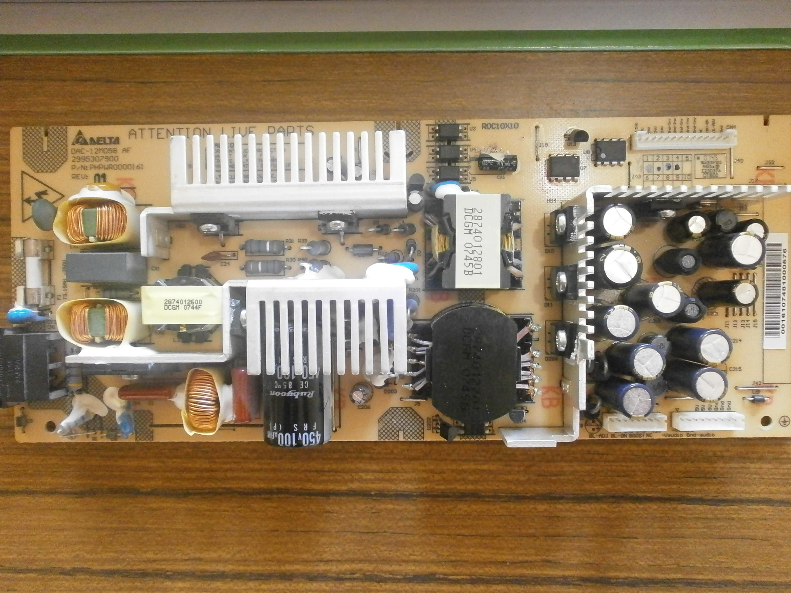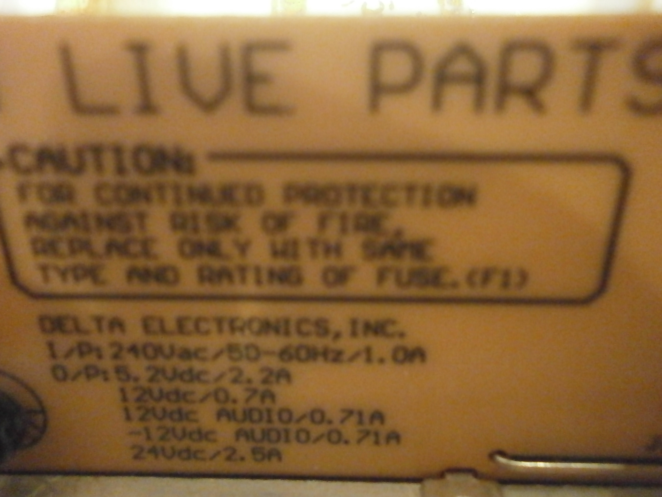 Hmmm, got the service manual from ElektroTanya, but the 2 versions of PSU are _nothing_ like mine, so it's pretty unusable. I tried Philips and Delta, but both were (as expected) unhelpful. I'll see if I can guess what the PSU gives by looking at what the other boards use...