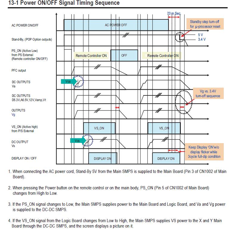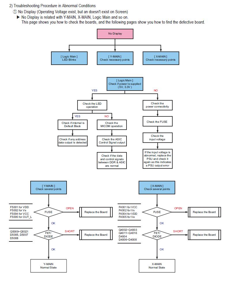 Plasma set powers on - then blinks 4 times (blue power button LED) then blue LED goes off. All power supply voltages are there and correct with all connections. No video, no OSD, no Audio. Have service manual. Y and X main boards are getting voltage but not 'on' (no heat from heatsinks). have green flashing led on digital board. set acts like it is on but no video, no OSD, or audio. all fuses on x and y are good. thanks. service manual says to replace Y main, X main, and then logic main ??? boards look good. There were 3 bad caps (2 on PSB, 1 on X- main) that I replaced. checked most on X Main and PSB. any suggestions ?