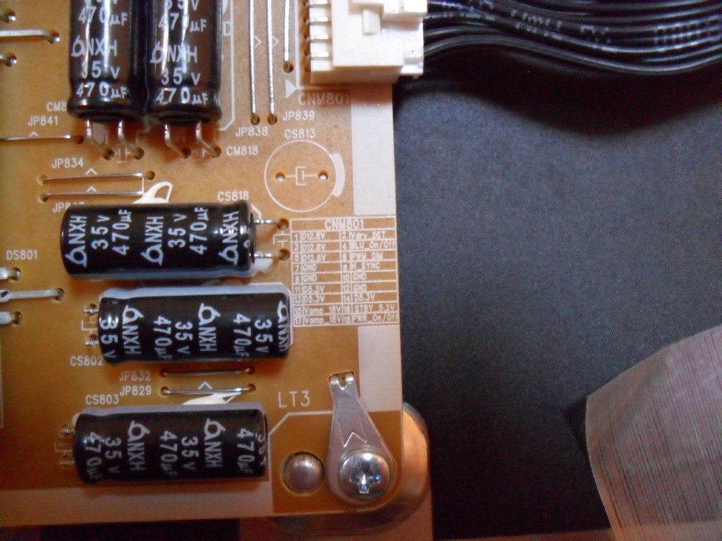 The only full voltages are the 5.3 standby, 5 volt CS803 supply and the 385 volt CP801-804 CS802 complex DC at the top of the board. My best guess is this is used for the LED backlight arrays?