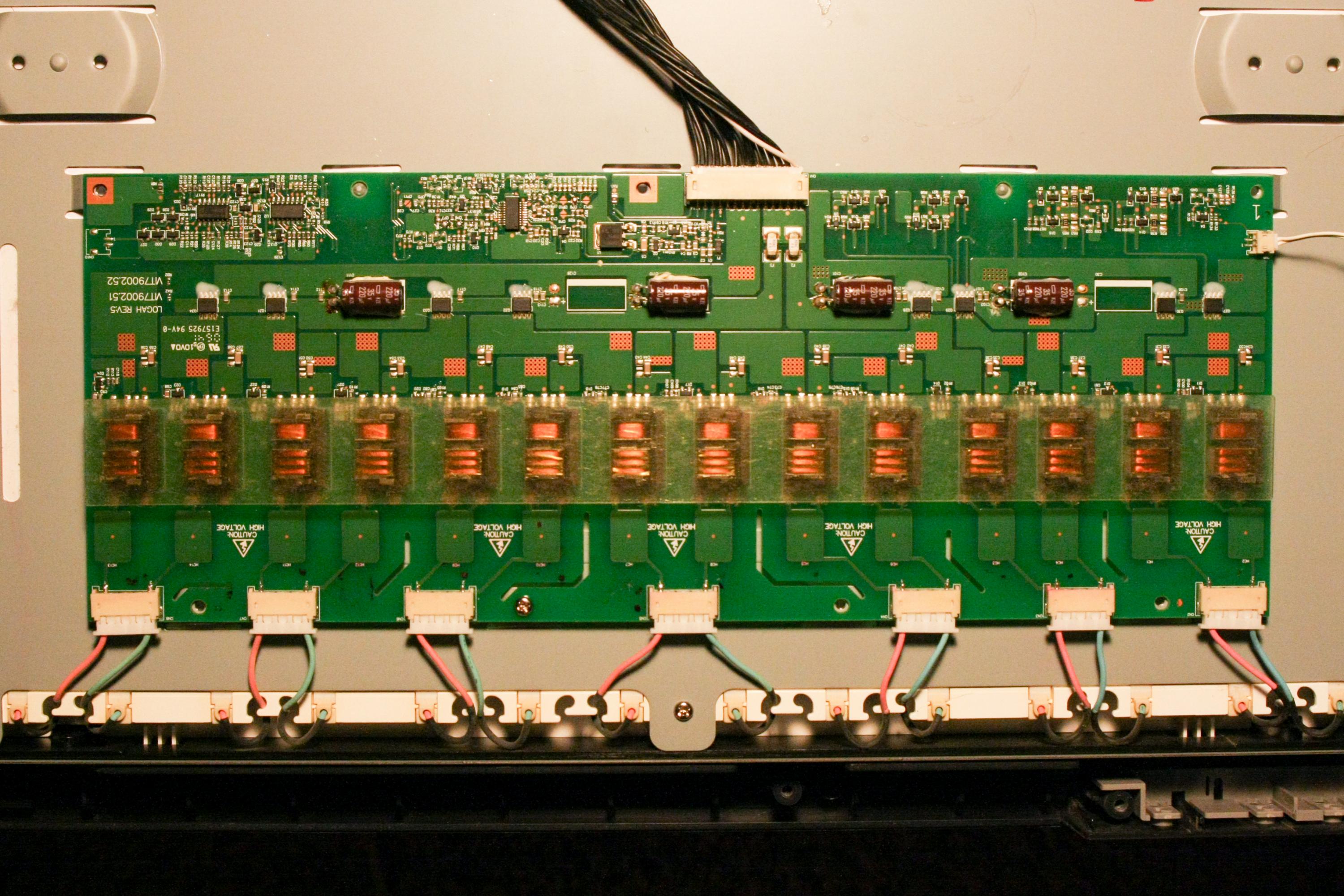 Then, I decided to try the reverse. Got the TV all re-plugged, back together, and then used the mini toy CCFL bulb in each spot on the Sanyo's inverter board, one at a time. To my surprise I found a configuration (third blue CCFL line from the bottom) that kept the TV on! Plugged in my PS3 to verify a good picture and all is well!