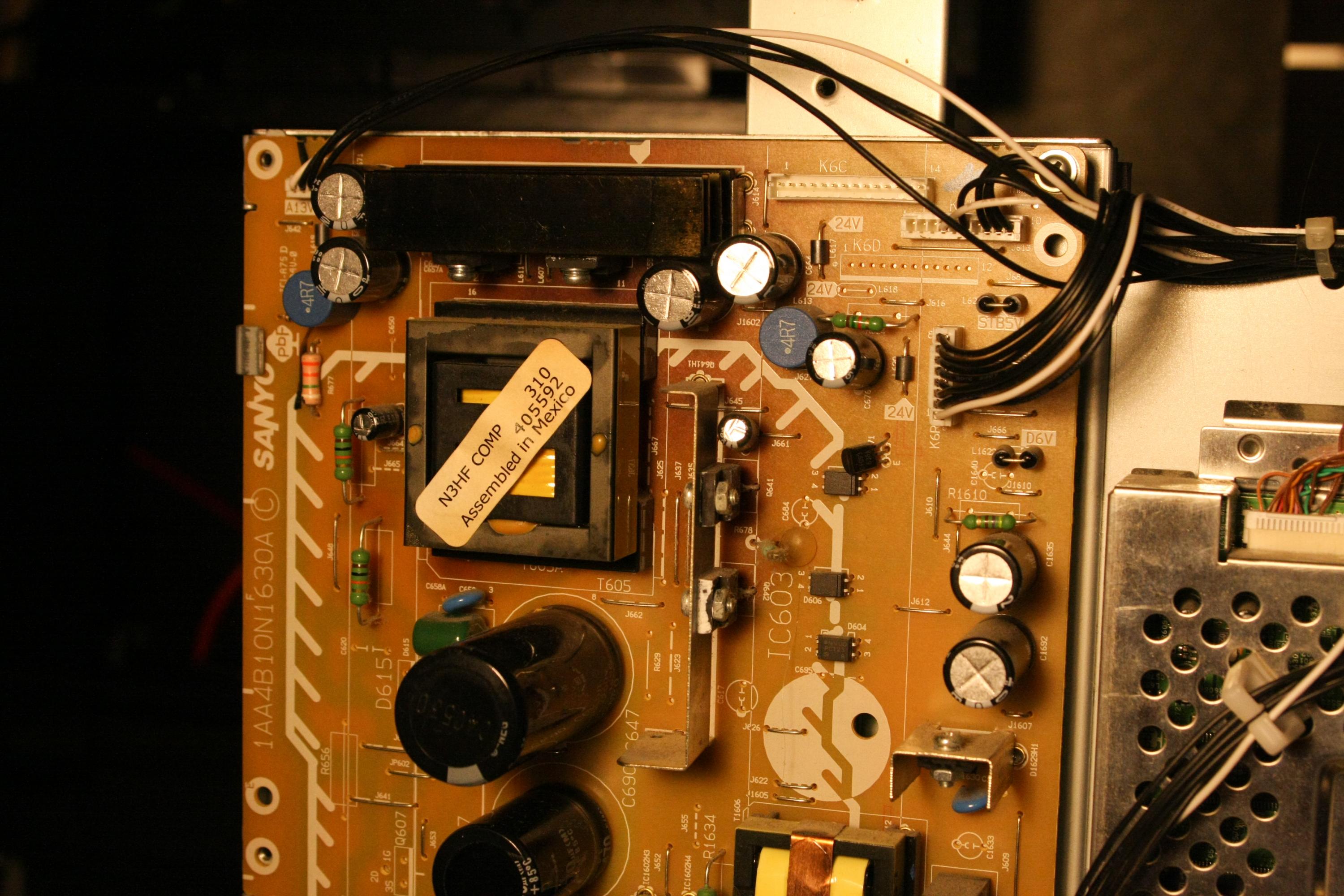 So of course, I crack it open and don't find any blown caps. I thought maybe the two main [640?]uf/[250?]v caps on the PSU were bulging, but when I replaced those with some spares sitting around it didn't change anything.