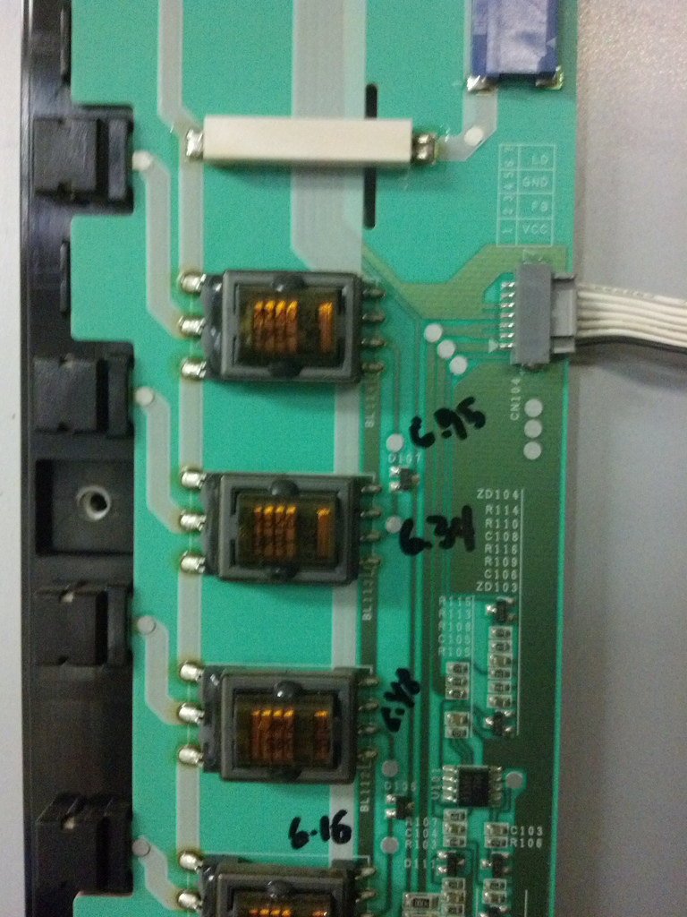 I have 12v going from power supply to inverter board on top harness. All the transformers on the inverter read the same EXCEPT the vertical one in the center of the board it is reading as shorted across the side with 3 leads, I haven't had time to unsolder that one yet and see if it is the transformer or something else.