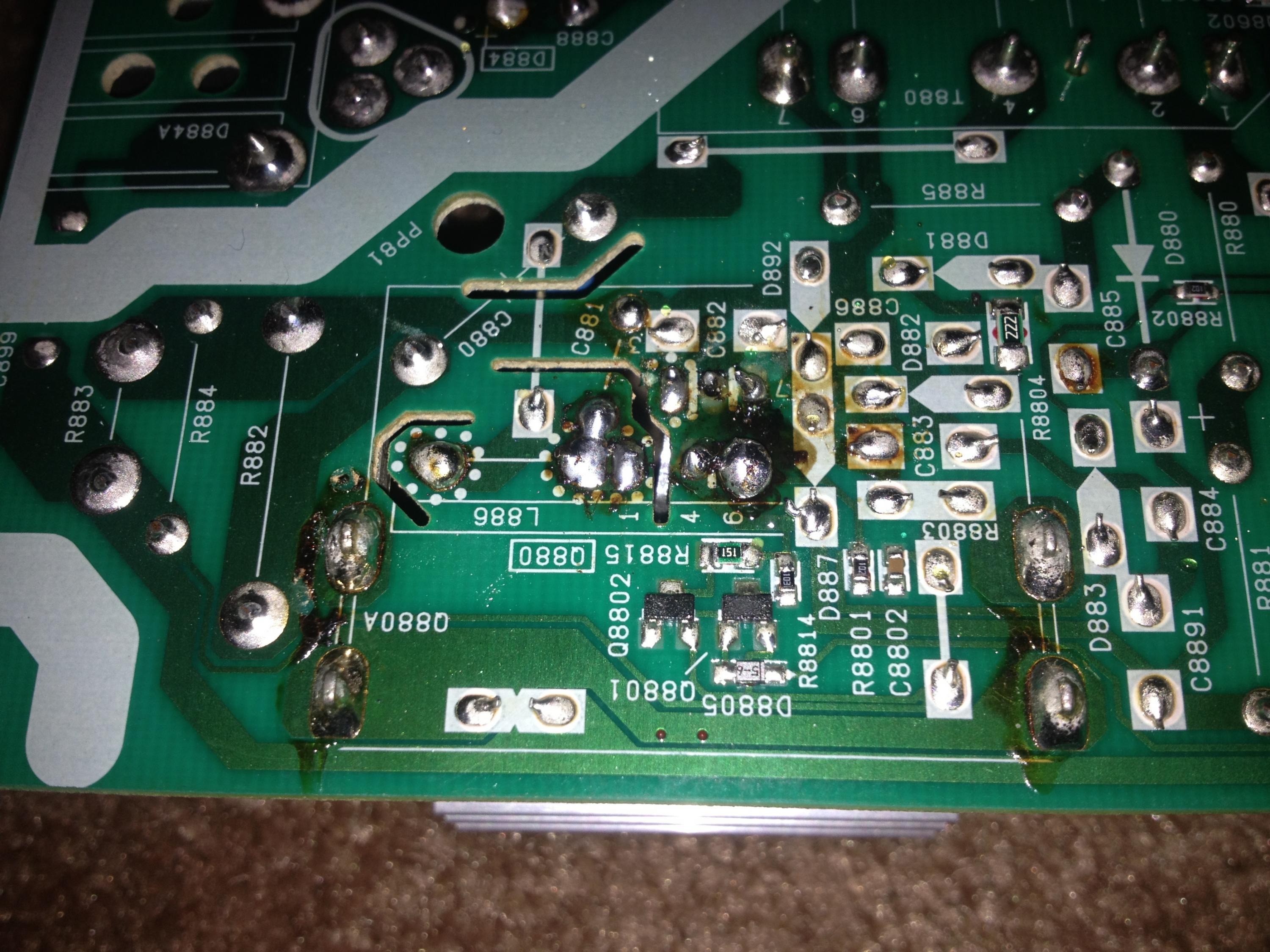 So I got one of the it's I replaced to stop getting hot by putting more heat sink paste on it. I didn't put much on before. But ic q880 is still getting hot. There is a diode next to it but I think it's fine but I'm not sure how to test it. Also there are two rectifier diodes on the opposite side of the board next to q820 that both have burn marks on the solder joints K. I don't know if this would mess the other ic up or not.Comment