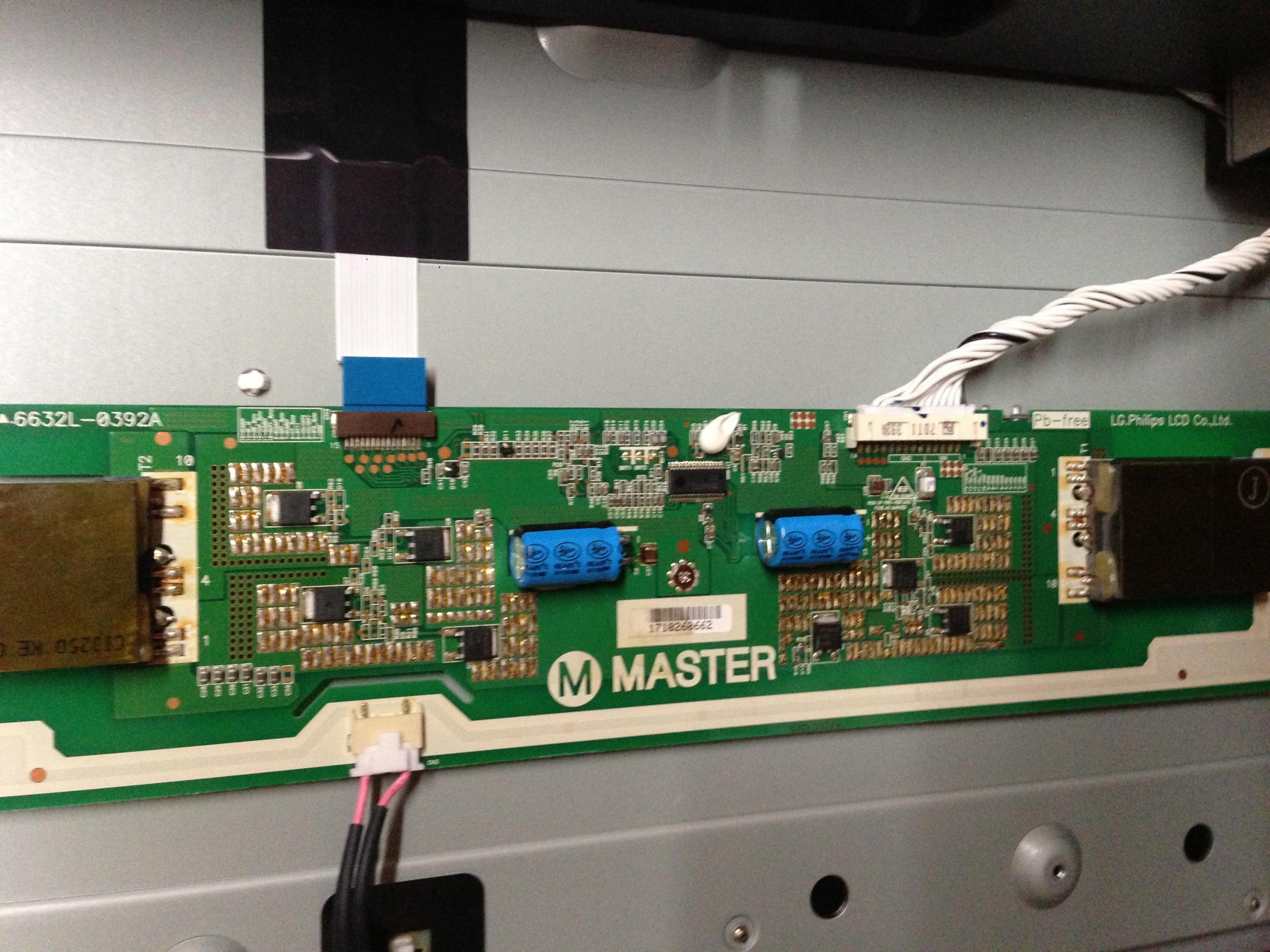 First, thing I did was open it up and found some bulging caps.( as expected). One on the PSU of the 24v supply and the two caps on both of the master and slave inverter. I replaced all 5 caps. Now when I was just about to unsolder the first cap on the master inverter I noticed that there was a solder ball on the 32pin IC chip. It was between around pin26 or pin27. I removed it and proceeded with the caps. Still no backlight.