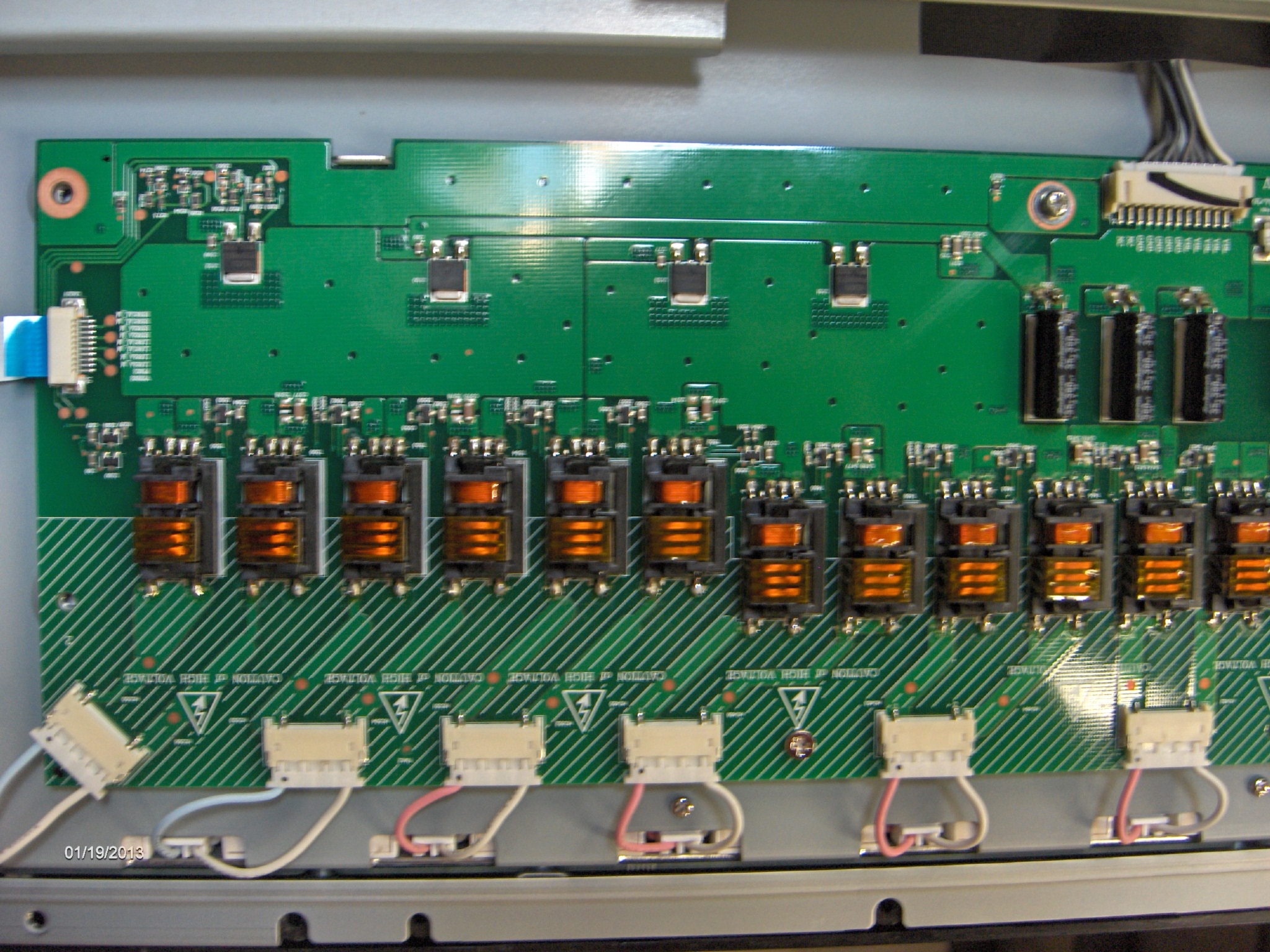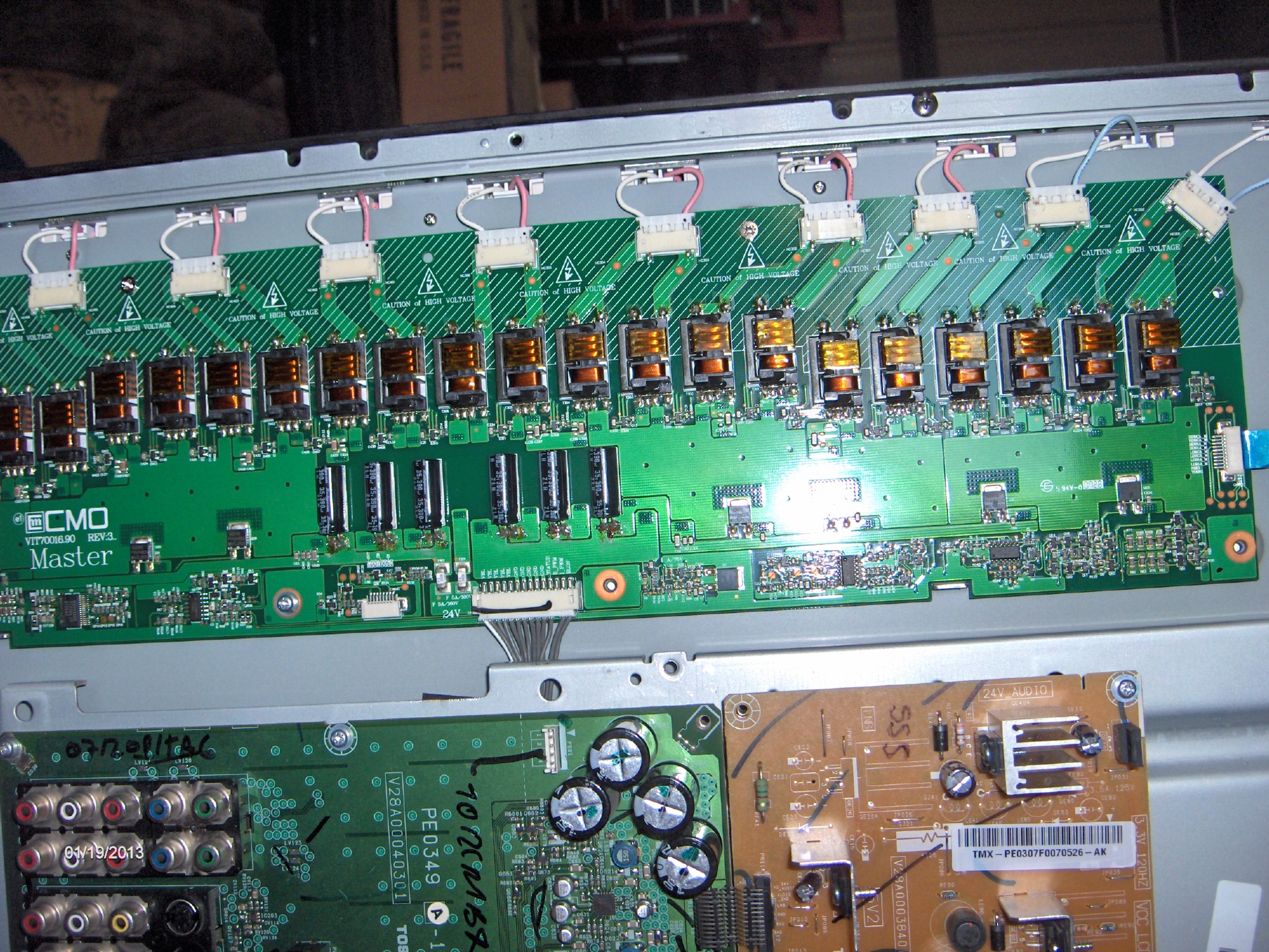 Production date 11 2007. The set was given to me after it went black but still had sound. She replaced the power supply, I could have told her that was not the problem, well I have a good spare PS. The set powers up after about 8 amber led blinks (sine board boot) and steady green after that. A flashlight to the screen shows the menu or whatever you select. The backlight system does not even attemp to power up, as per service manual all the voltage readings are correct except for inverter master status, it should be 3.3v it reads .41v. There are no blow fuzes on the inverter boards, the primary side of all the hv xformers is .3 to .4 ohms, the secondary coil is 2.2k ohm, no shorts between pri and sec. The mosfets test good for shorts. There is 5 volts on BLON and 3.12v on the Ipwm pin (6 volt ac), I did not check the frequency.