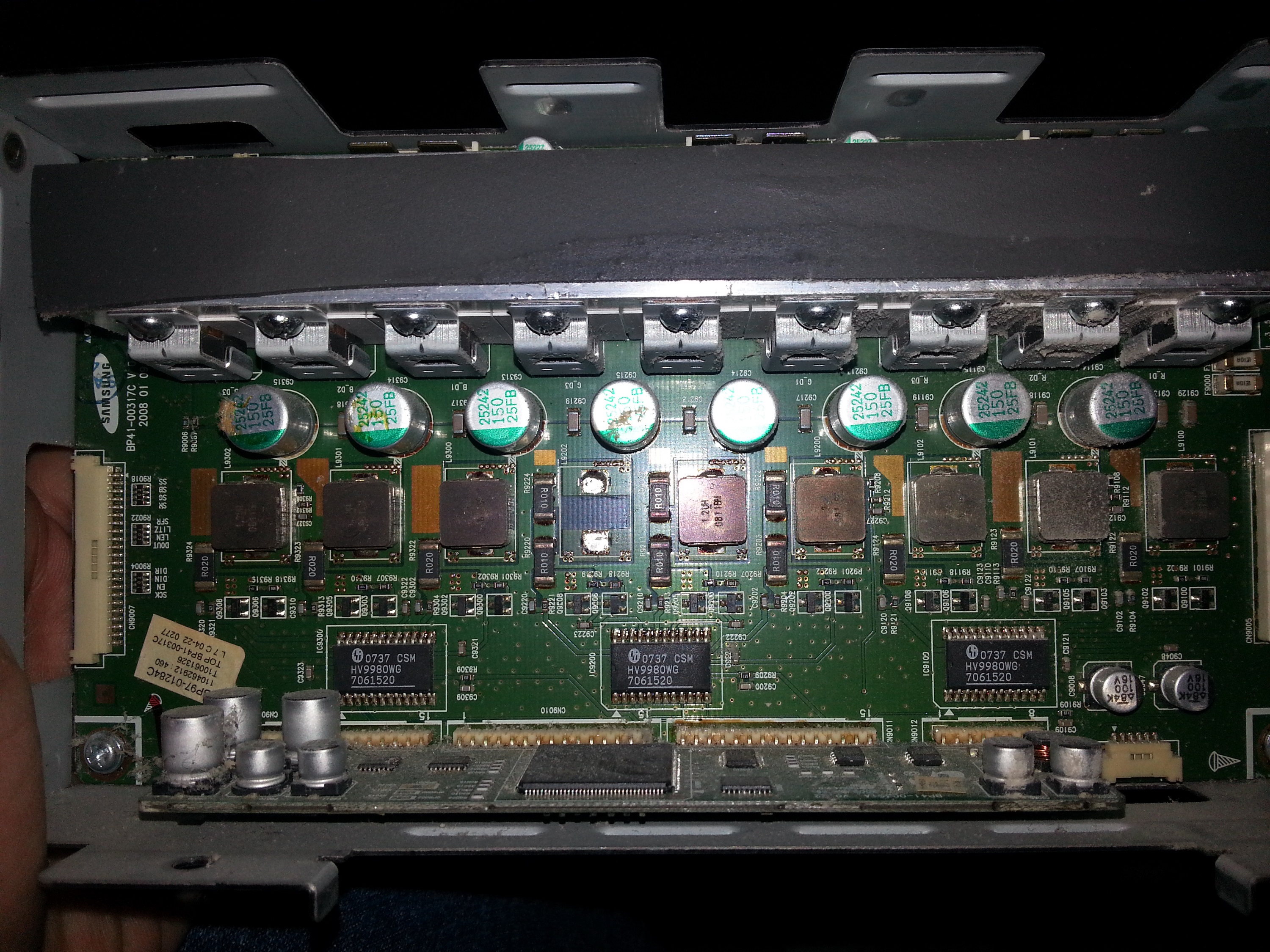 so... not good. I got the caps today, replaced them tonight. Put everything back together, turn on the TV.... same problem. It starts to come up, I see the input very briefly, it flickers and goes black. switch back and forth between inputs and it keeps doing it. Input 1 and 3 seem to stay up, 2 keeps going out (which is where my satellite is connected). After some struggling, it tries to reset itself. 3 tries to reset, back to the 3 flashing lights. So now I'm guessing the LED Driver? Anyone have any ideas? I think I'm going to go be sick now.