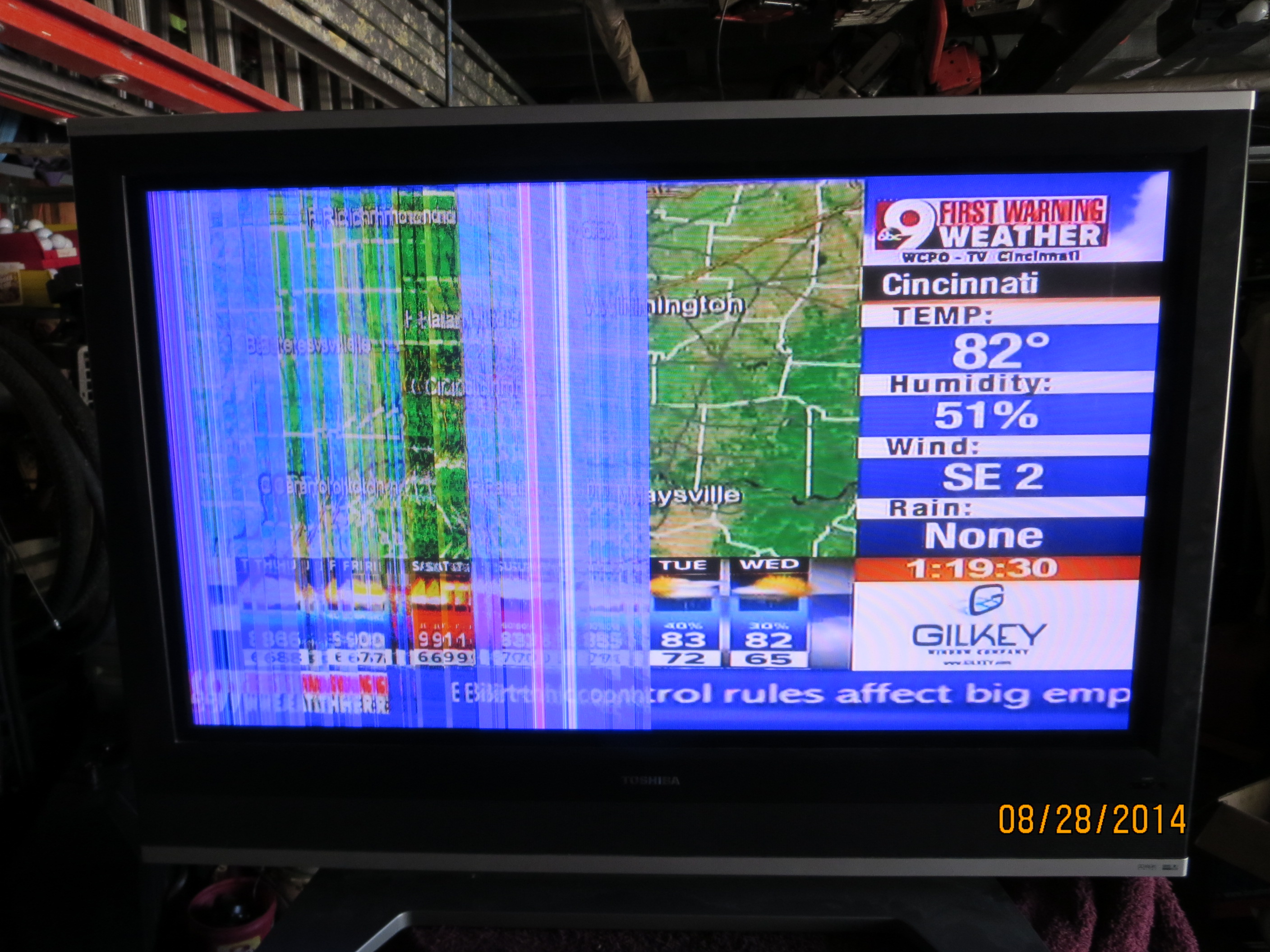 Is that with video input to the TV? Can you get anything on the other side? Looks like bad panel or missing Va/5V to X-driver boards.Please do not PM me with questions! Questions via PM will not be answered. Post on the forums instead!