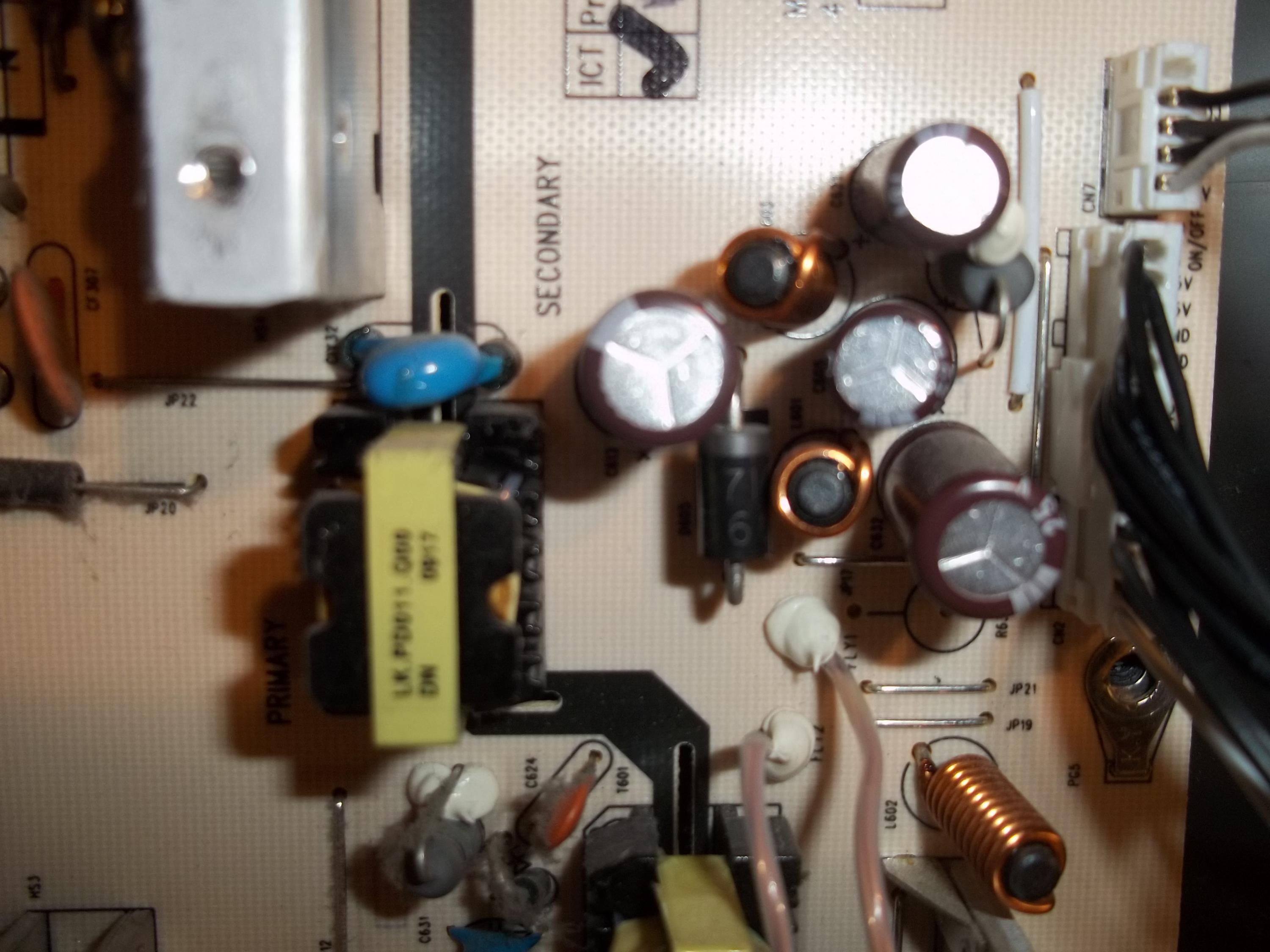 Above the two caps is the High Voltage Inverter transformer, to the right of it there are two MOSFETs, and two Diode mounted on the heat sink, they are for driving the inverter transformer. We need to find out if we are getting the 349V to feed that circuit or not, so please post the WHOLE toP side of the board and the bottom side, then 1/4 section or smaller of the bottom side. I am looking for some kind of fuse or fusible resistor that the 348V feeds in to it and the out put side of the fuse then feed the 348v to the MOSFETs.Never stop learning