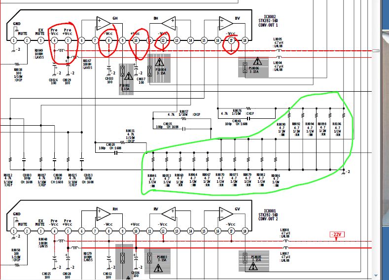 The 4.7 ohm resistors, judging by what I can make out on that schematic are those all the blue ones that are under the convergence IC heatsinks?