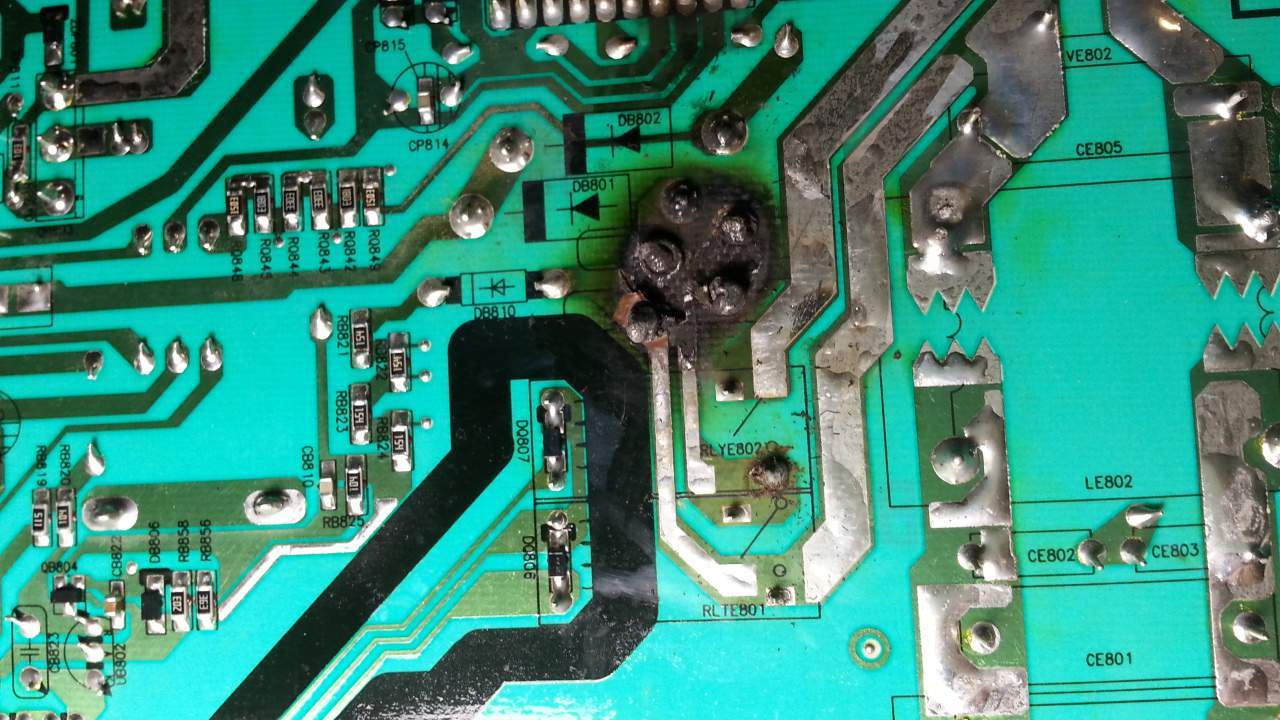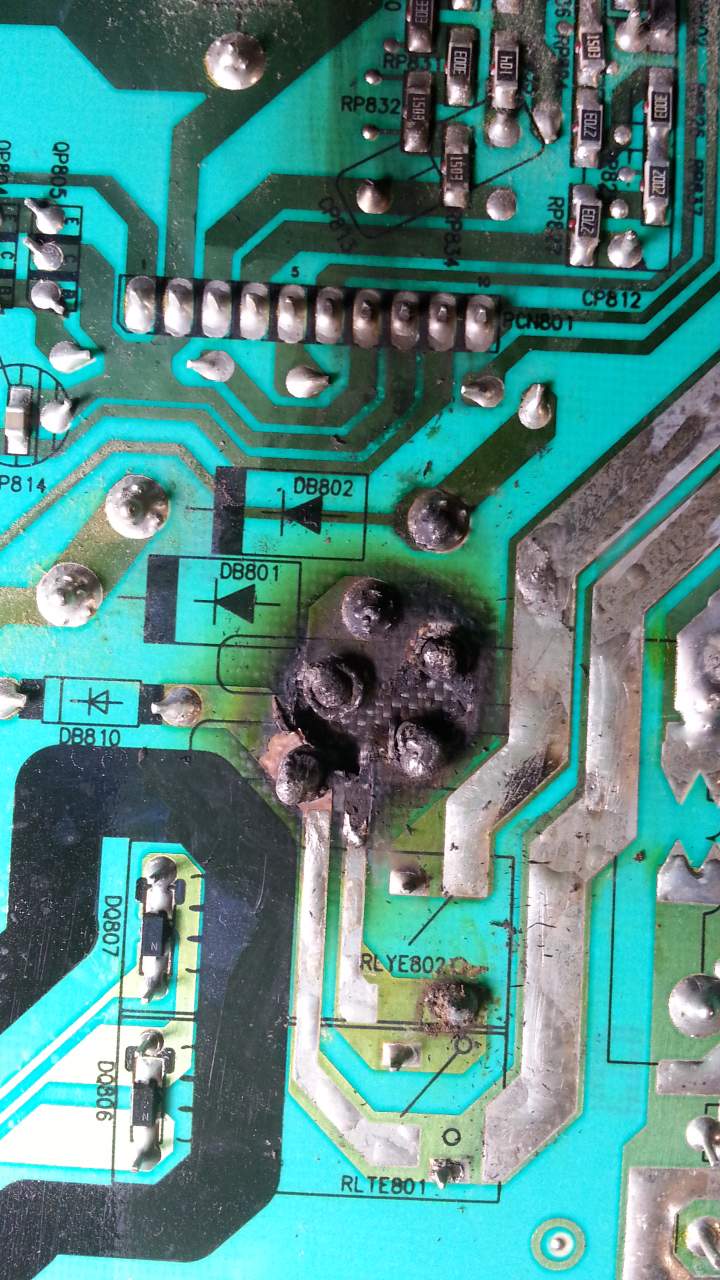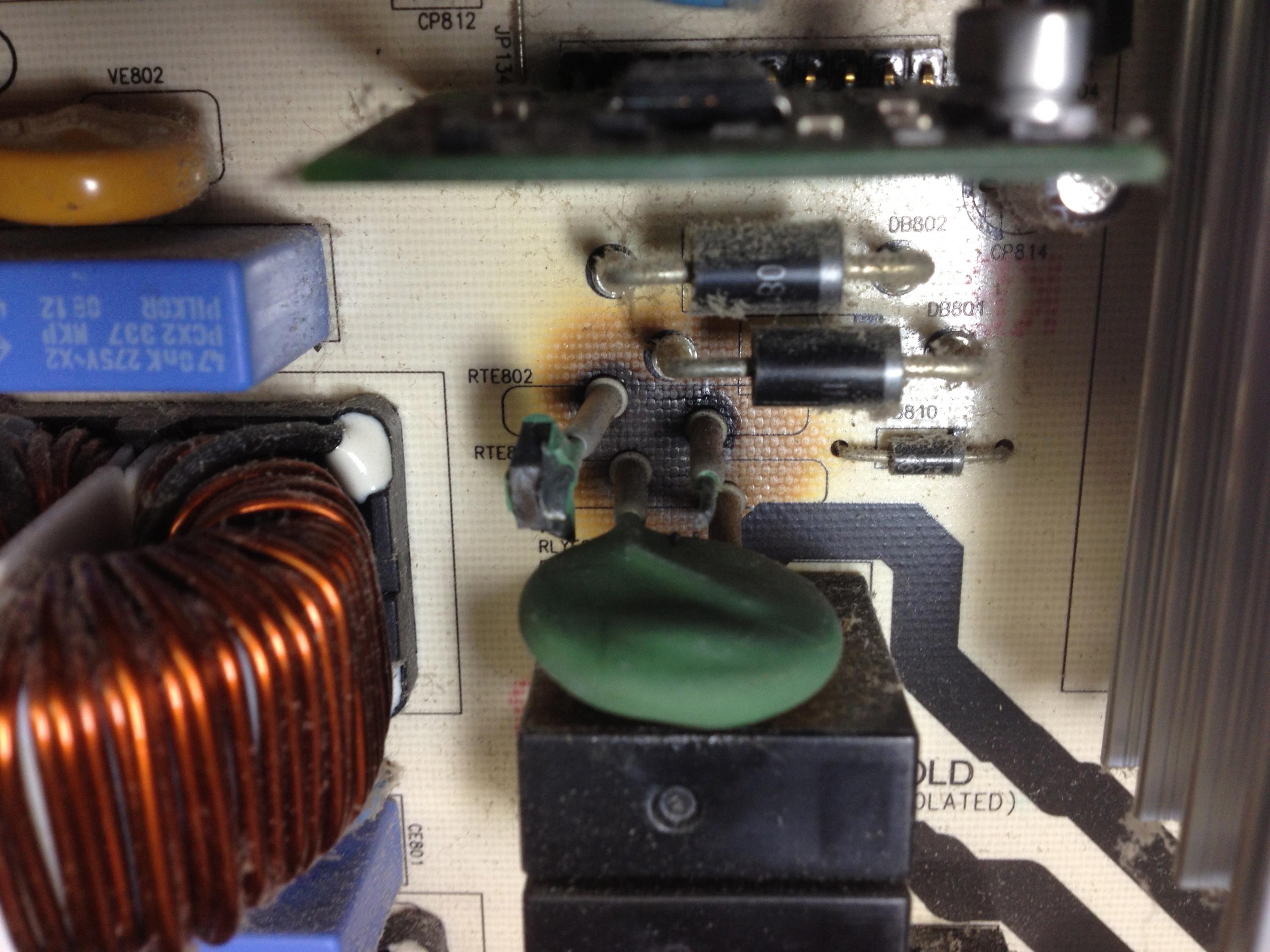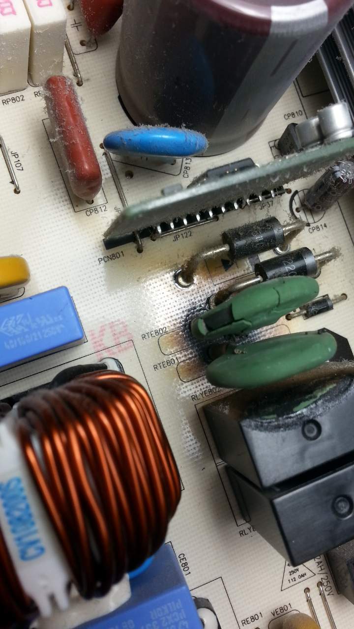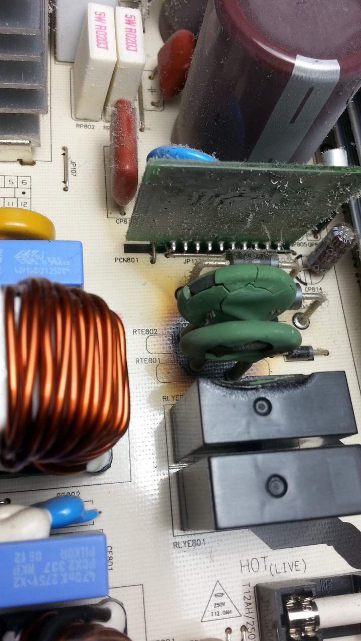 I was told the set was working fine until one night they heard a “pop” and everything shut down. On checking the board, the first thing I found was a green blown apart RTE-802. I found FishFind's thread for the same PS board when I did a search for RTE-802 https://www.badcaps.net/forum/showth...hlight=samsung.