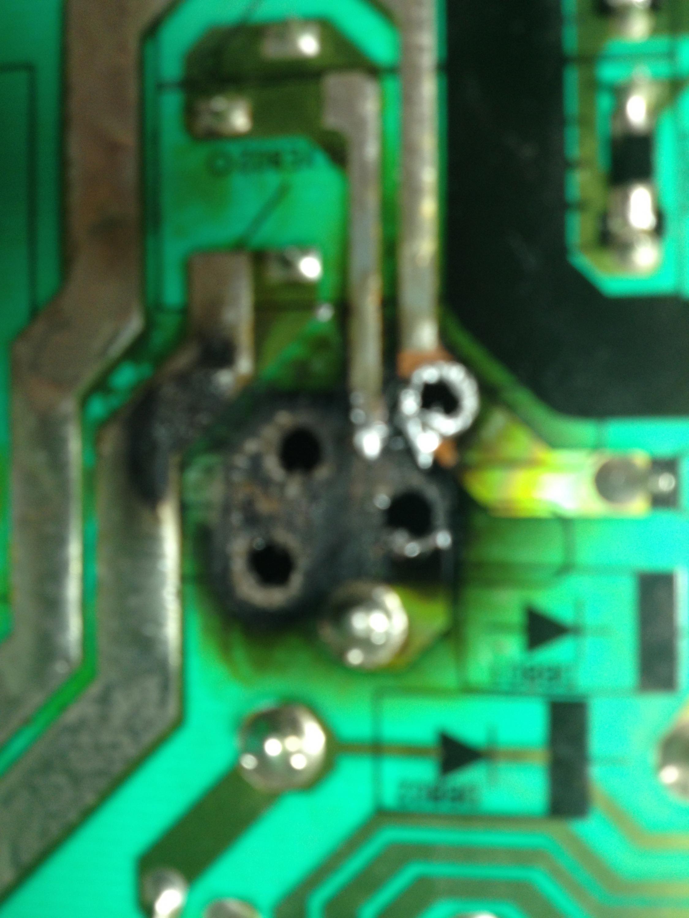 There are two of these green inrush current limiting NTC thermistors side by on the lower left side of the board. From that thread I leaned about the cold solder joint on the relay and sure enough the lower pin on RLYE-801 was nearly hanging free!