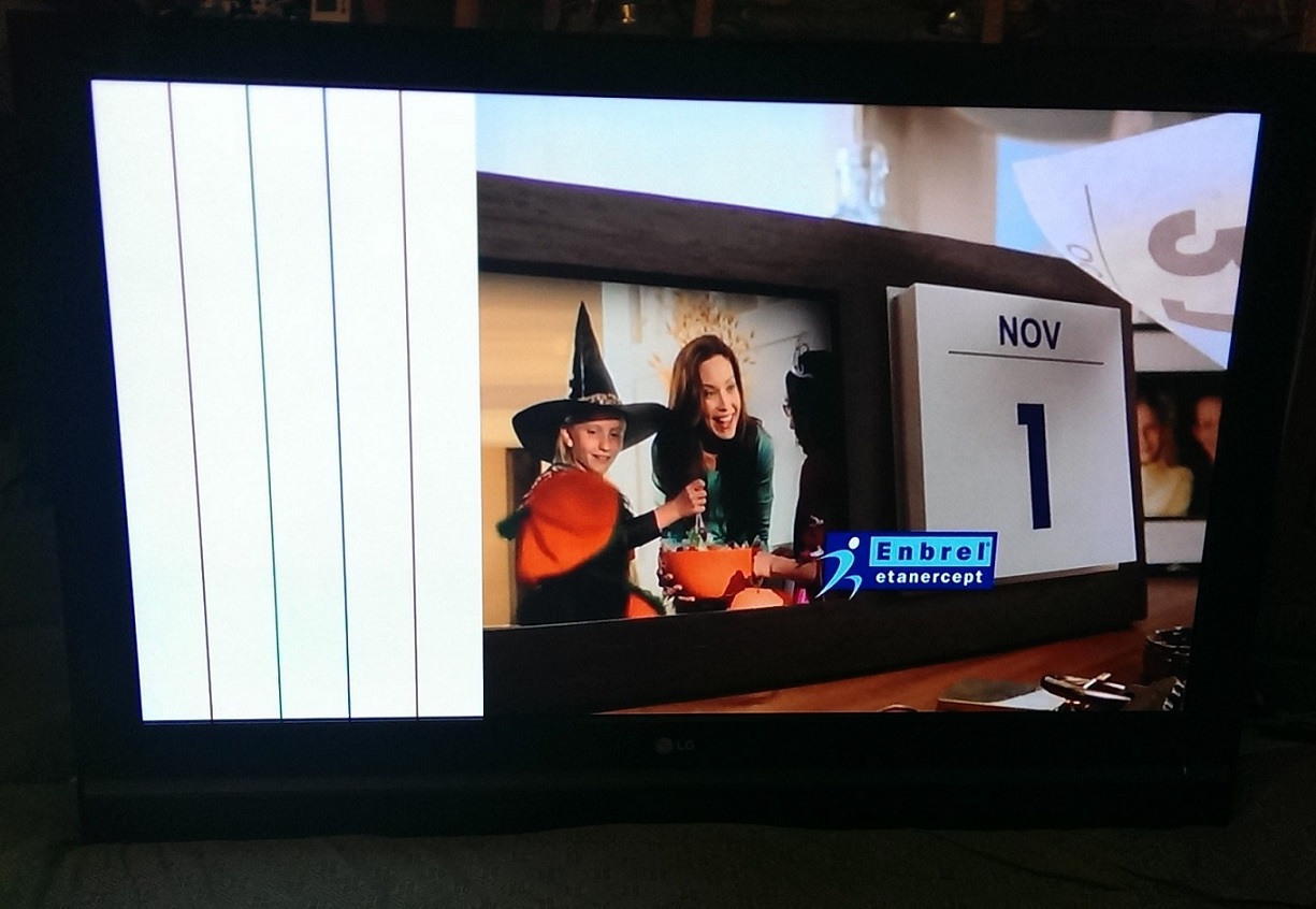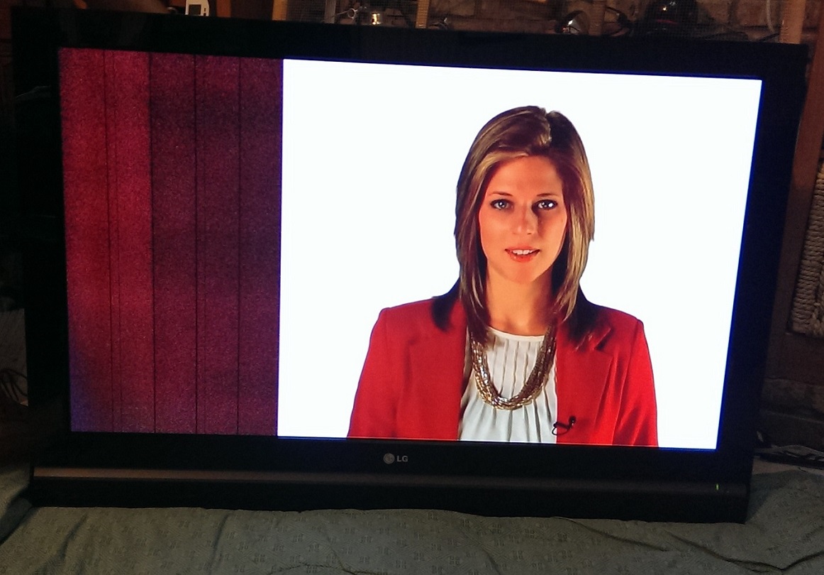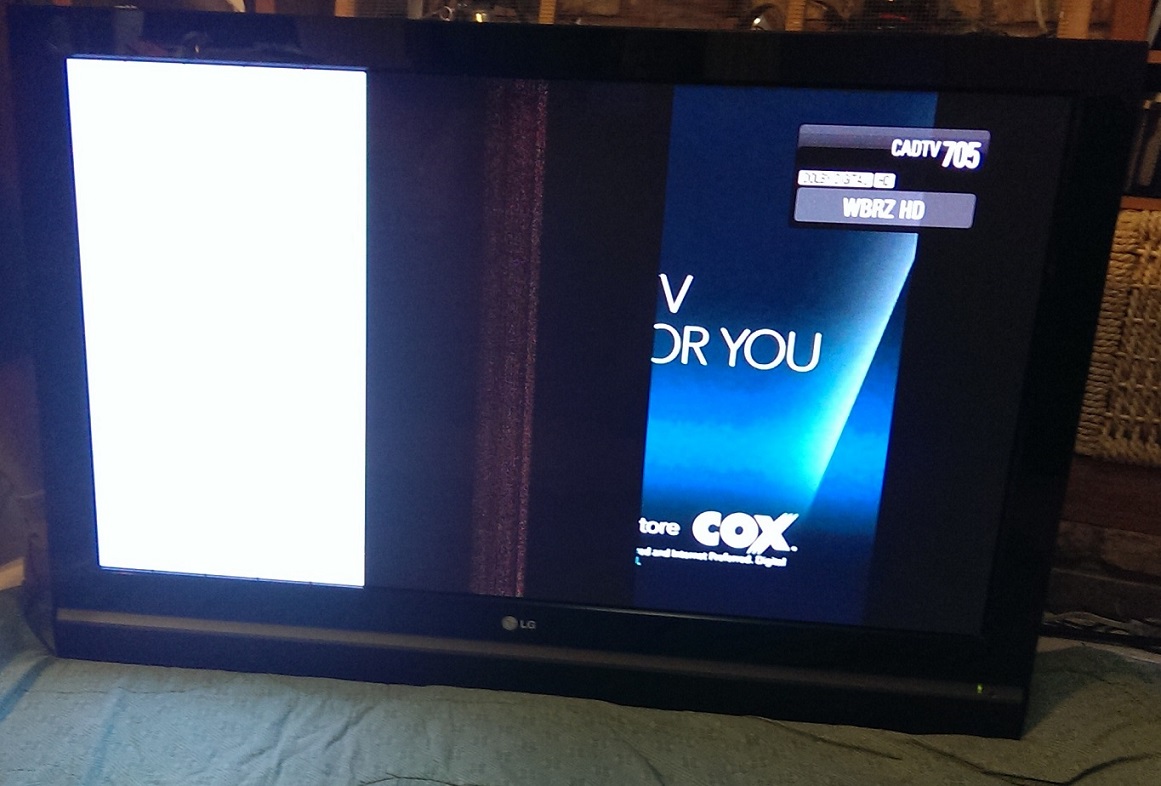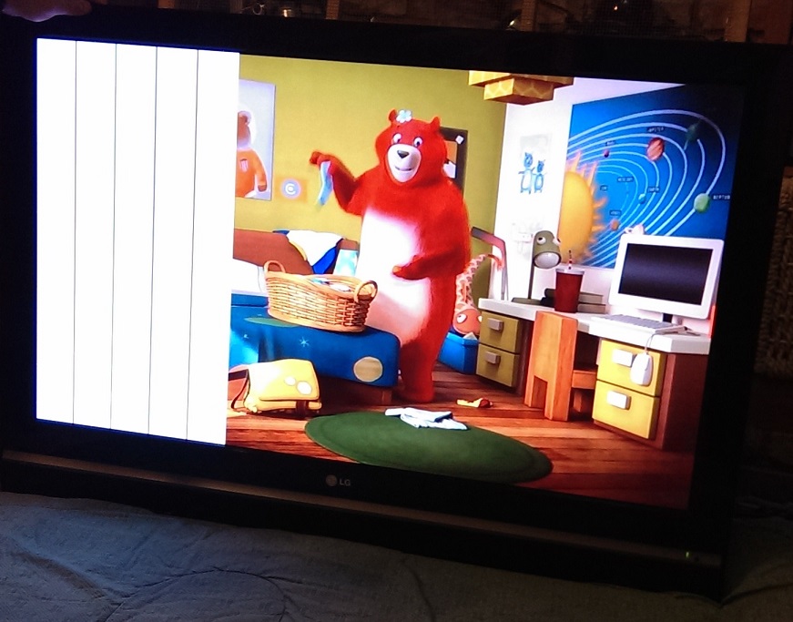The screen went out on the left side (looking at the screen). It is mostly White with spaced lines (line colors are Red, green Purple and Red). When it first started it would sometimes be mostly black with the colored lines. It did happen to work the next day for a few hours or more, then reverted back to the issue where it stayed.